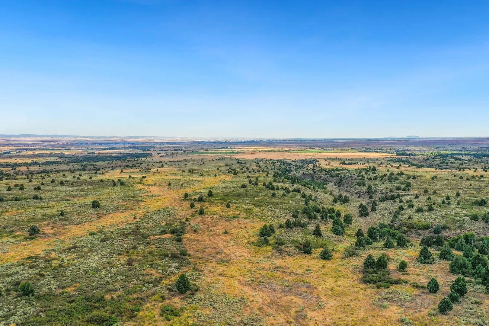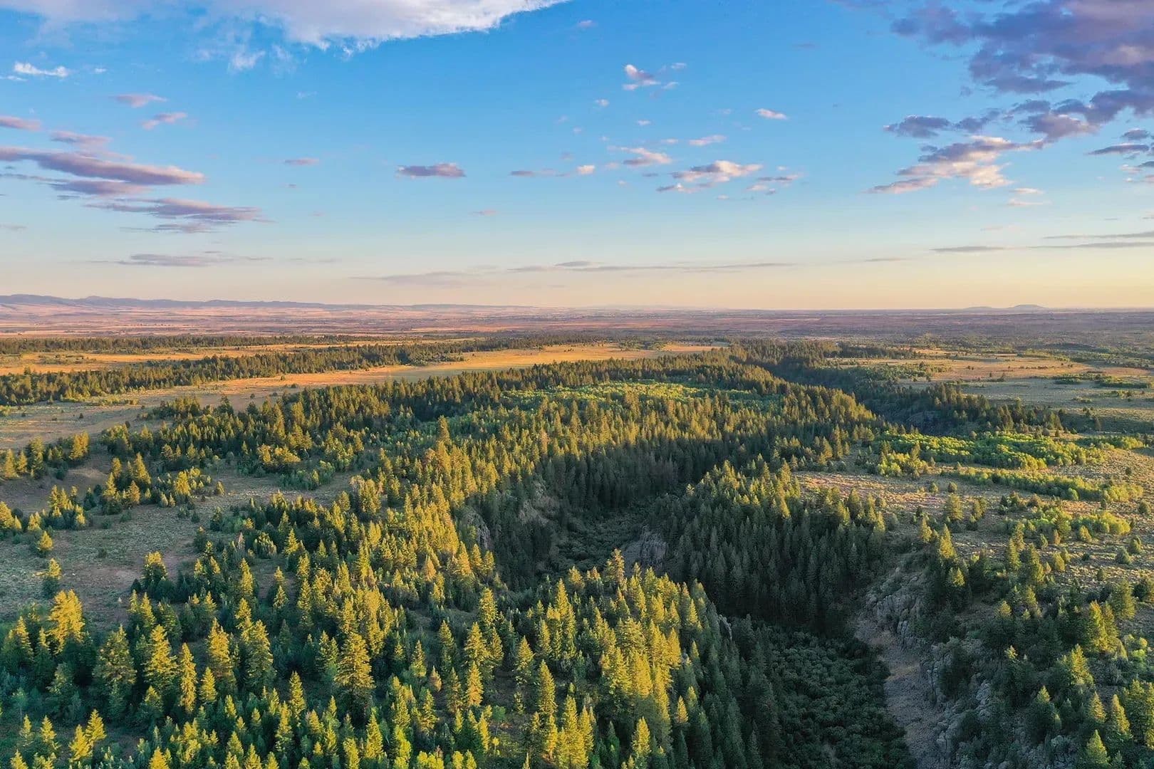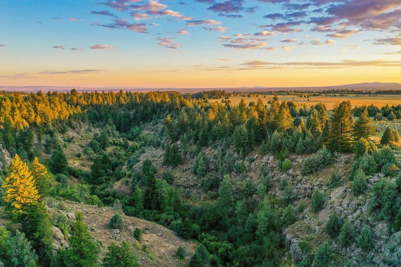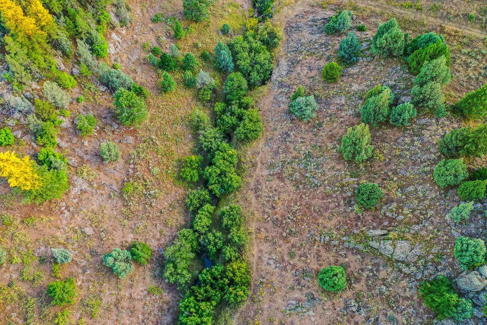 Flowing directly through the property, five named creeks: Dry Fork, Spring Creek, Snow Creek, DeWitt Creek, and Cold Spring Creek, create a diverse aquatic ecosystem supporting exceptional wildlife habitat. Multiple natural springs further enhance the property’s water wealth, creating lush riparian corridors that wind through deep timber draws and emerge into expansive sagebrush flats dotted with productive grasslands.