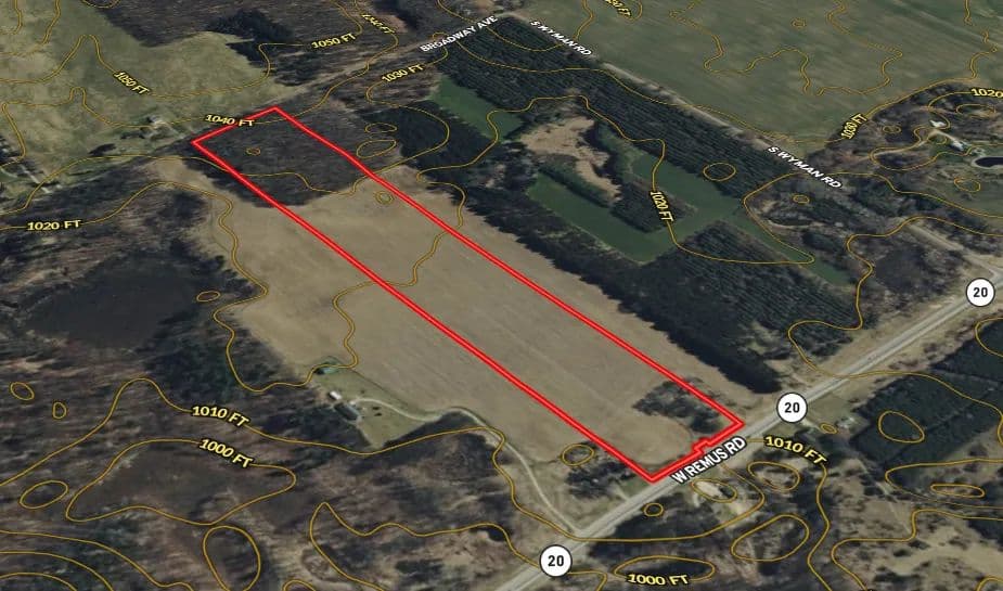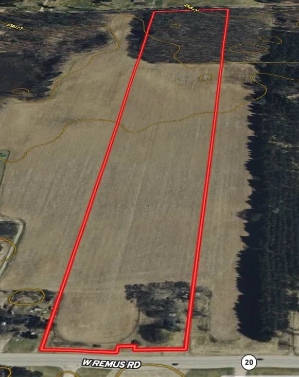 A great affordable 26.6 acres on a paved road just east of Remus in Isabella County. This old homestead at 10282 West Remus Rd (M20) needs a new family to make memories like the previous family did, but you would have to start from scratch on the home! Do not enter the current homestead as the ceilings and roof have fallen in, in many places. This property also has road frontage on Broadway Rd. and that frontage is all wooded and rolling making a great spot for a home on a quiet road. This property consists of almost 7 acres of woods and old homestead and the balance is income producing tillable.