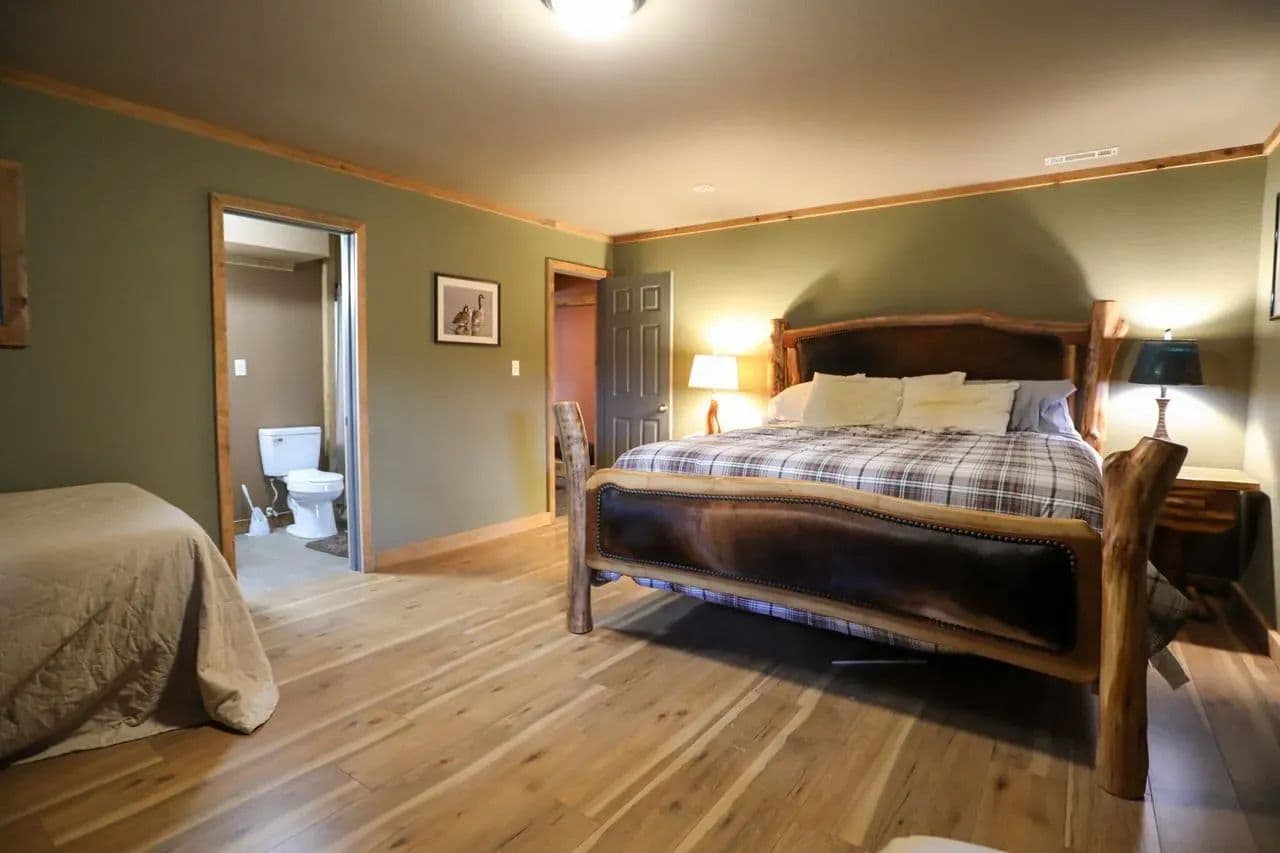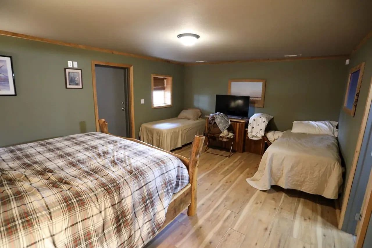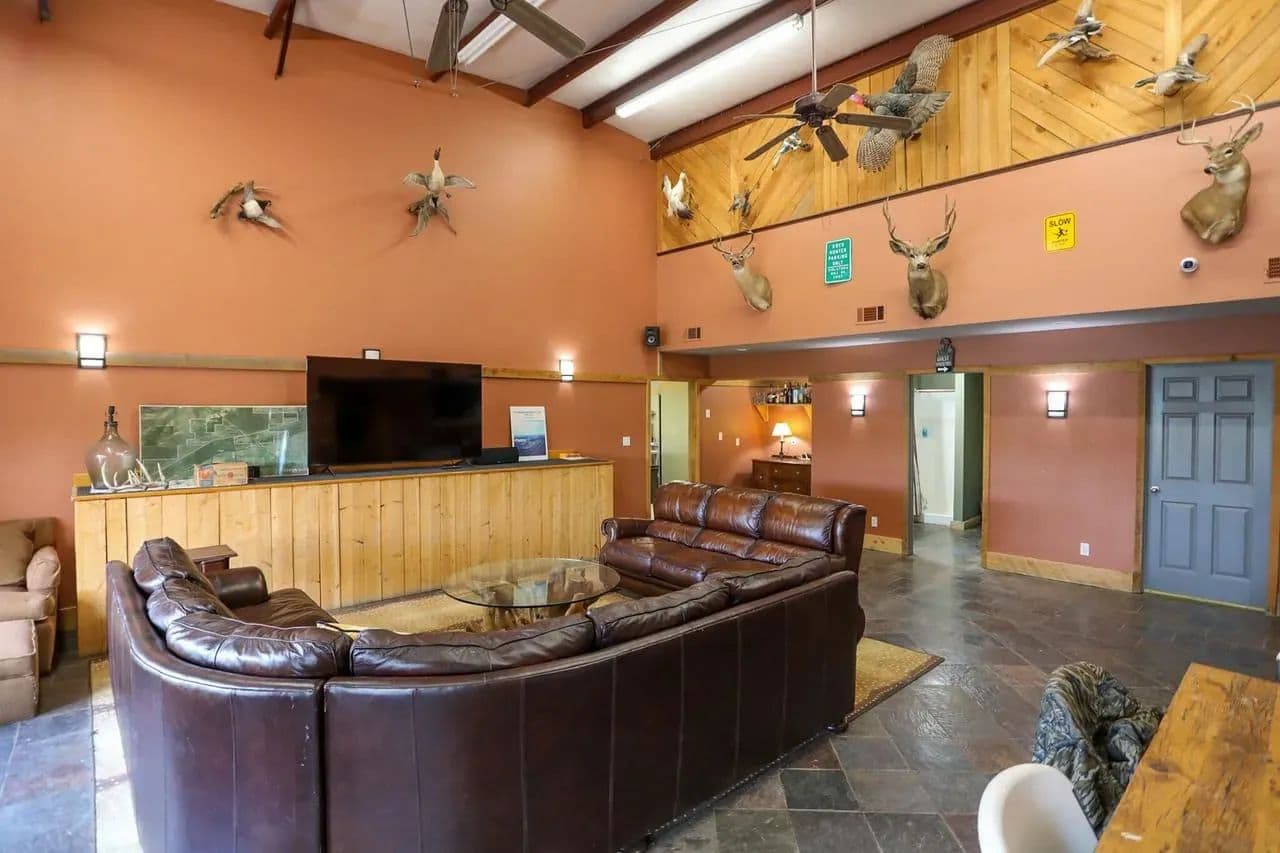 Included in the sale is a spacious, low-maintenance lodge designed for comfort and function. It features two private suites on the main floor, a large upstairs bunk room, and a private en suite upstairs. The commercial-grade kitchen with stainless appliances makes hosting easy, while the large garage/mudroom and screened porch offer practical space for gear and relaxation. Thoughtfully located just off the farm along a gravel road, the lodge maintains privacy and minimizes disruption to wildlife movement on the property.