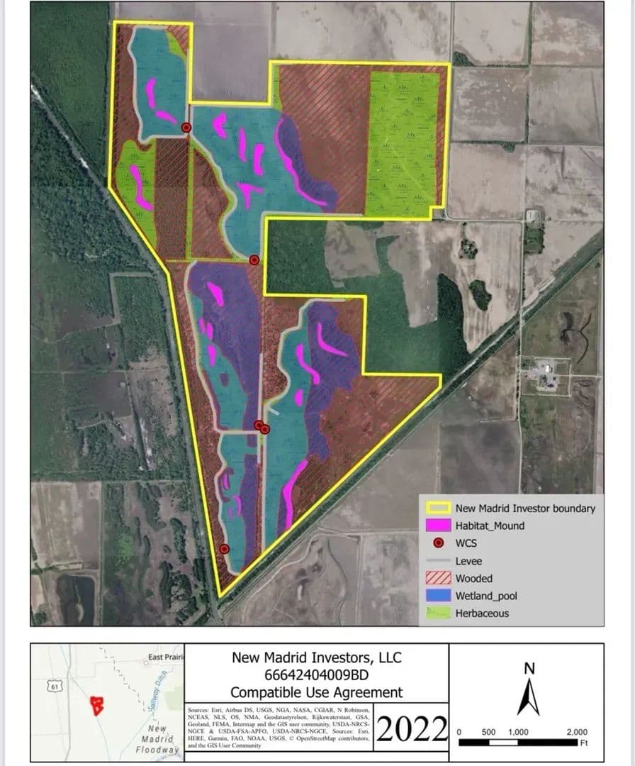 Located just off the Mississippi River in the legendary St. Johns Bayou region of New Madrid County, Missouri, this 695± acre hunting farm offers a rare and highly sought-after opportunity in one of North America's most historic and productive waterfowl corridors. Surrounded by renowned farms and infamous duck clubs, this property sits at the heart of a region that has long been considered a premier destination for serious hunters chasing mallards in flooded timber, trophy whitetails in bottomland cover, and longbeards in spring green fields.
