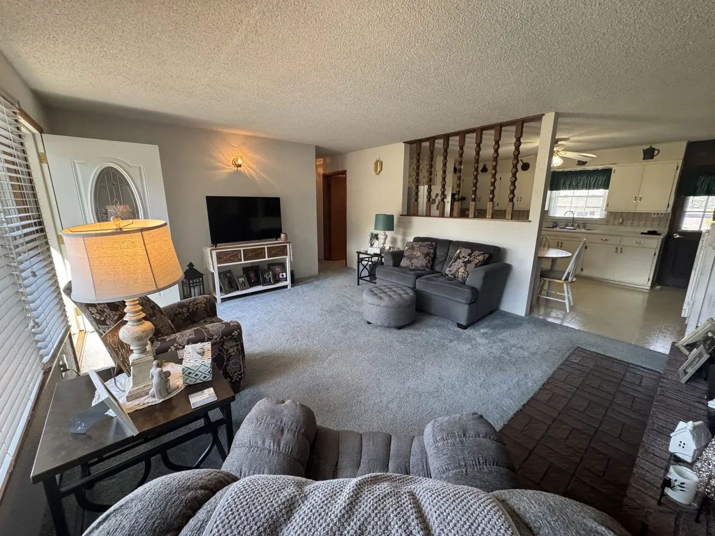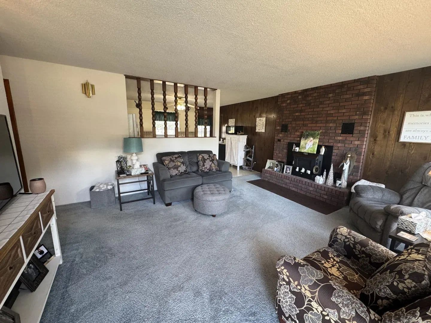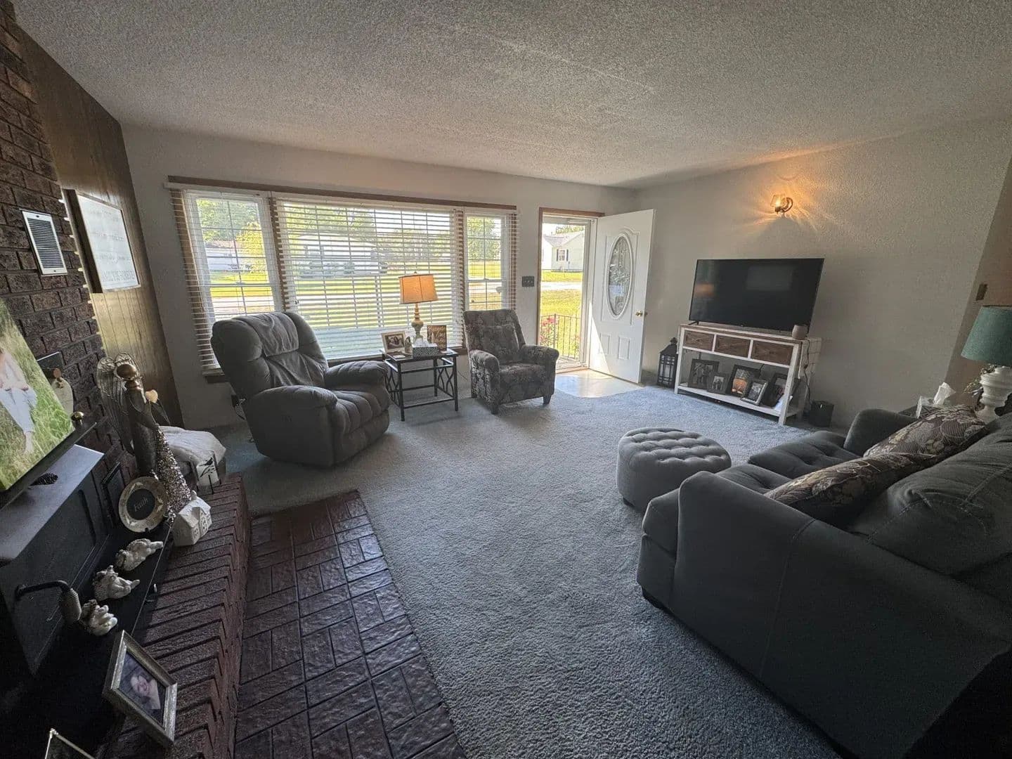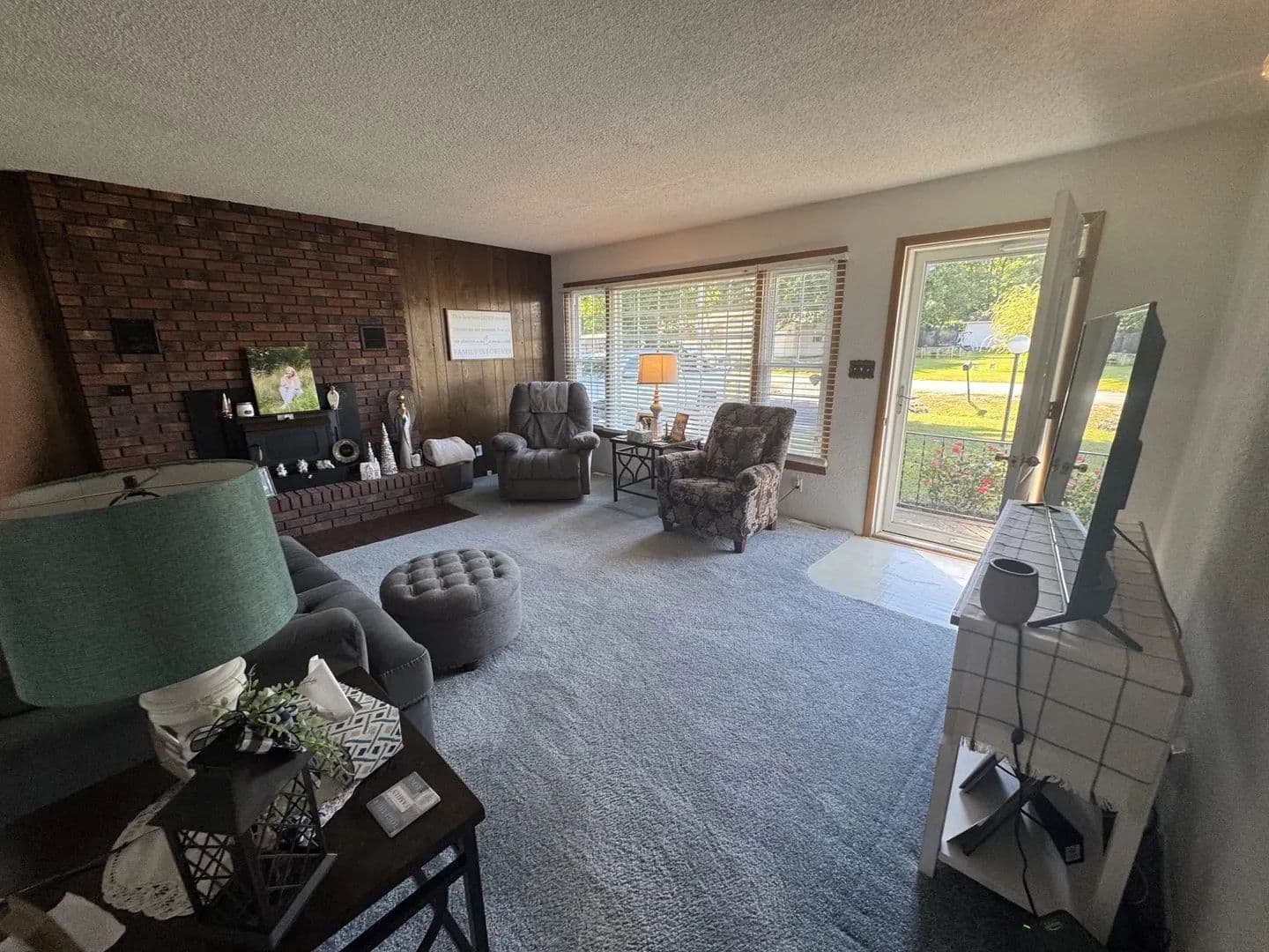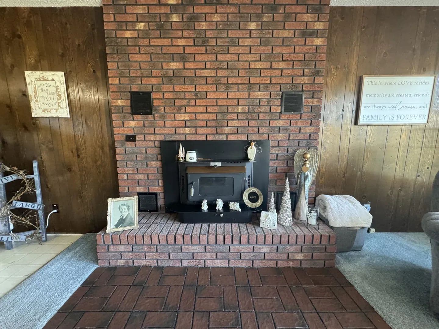 The inviting living room showcases a beautiful brick fireplace with a wood-burning insert, creating the perfect cozy gathering spot. A partially open layout connects the living room and kitchen, making conversation and entertaining effortless. All three bedrooms are generously sized, with the bathroom conveniently located nearby.
