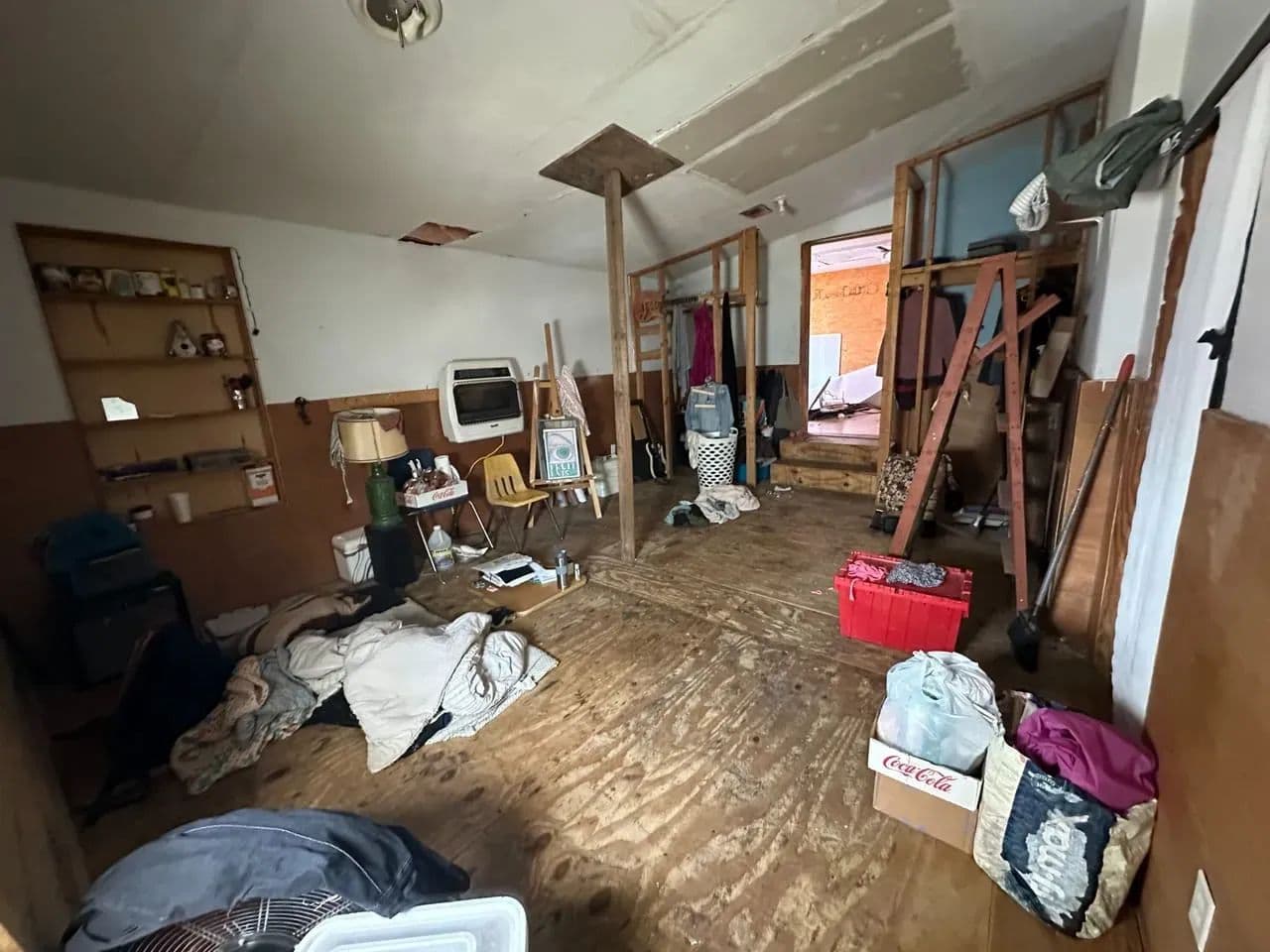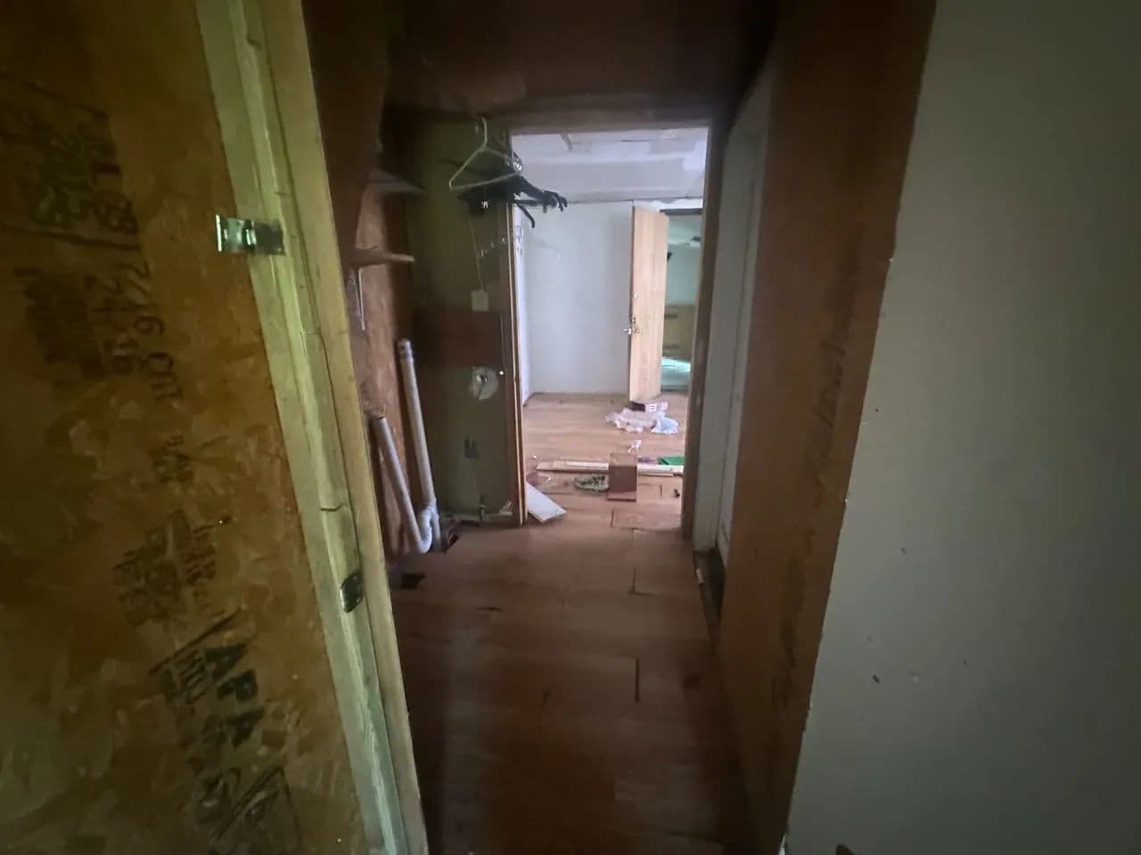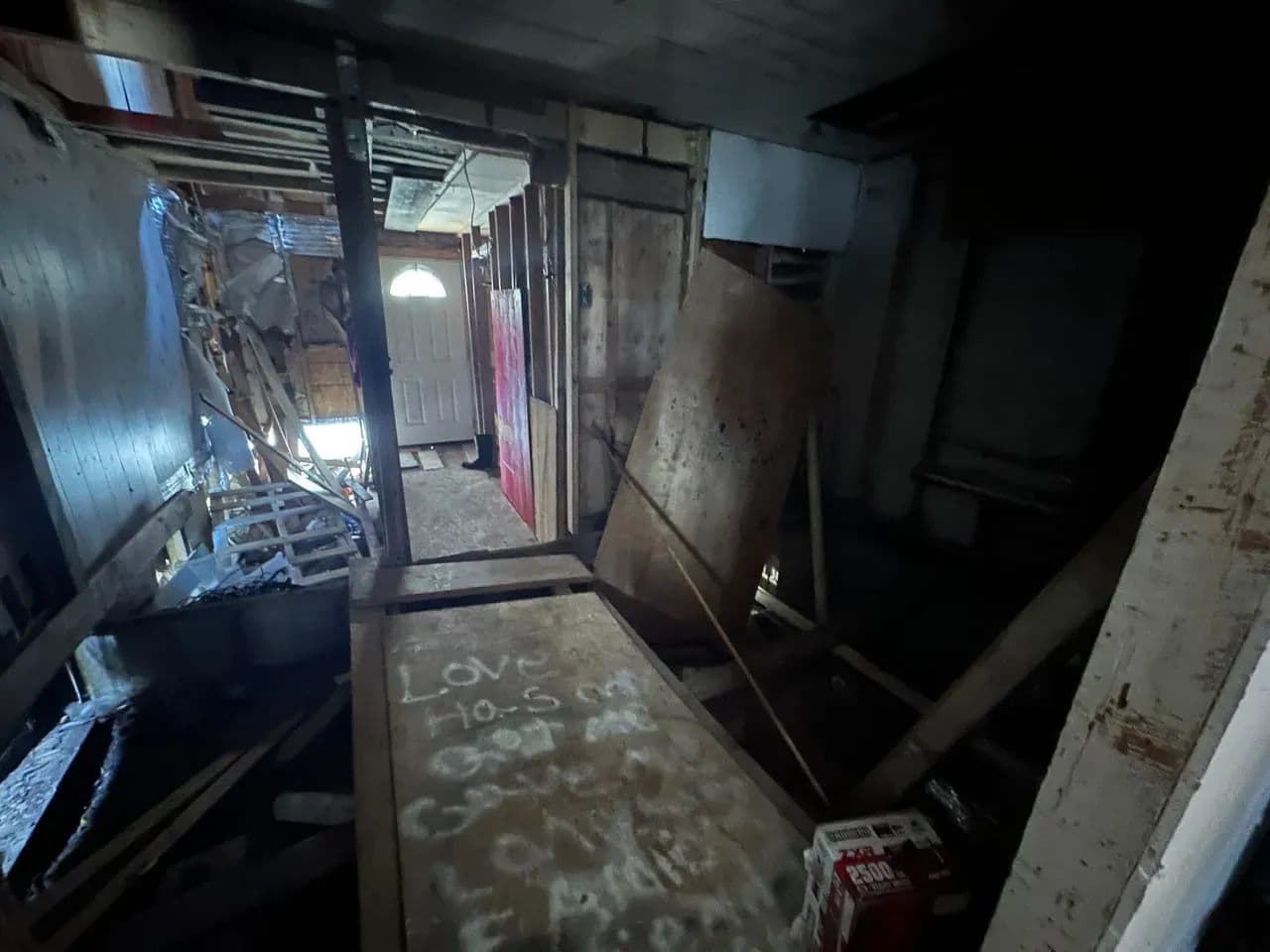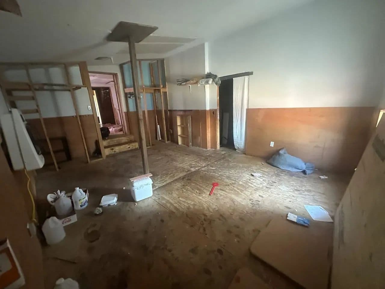 The main level offers 2 bedrooms and 1 full bath, with the seller reporting an additional 2 bedrooms and half bath upstairs. The stairwell has been removed, so access to the second floor will need to be reestablished. The home has power and water connections, though both services are currently shut off.