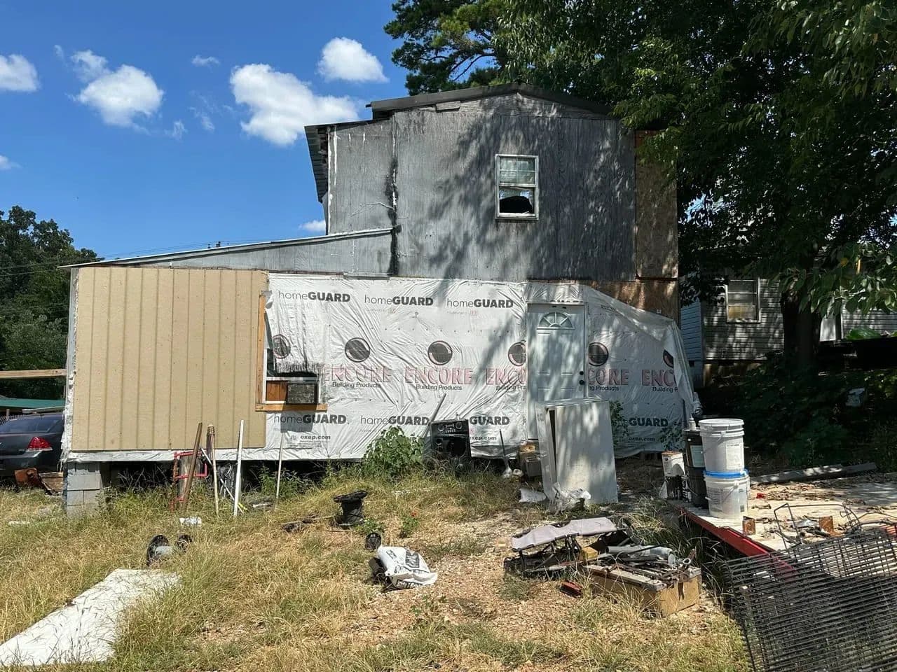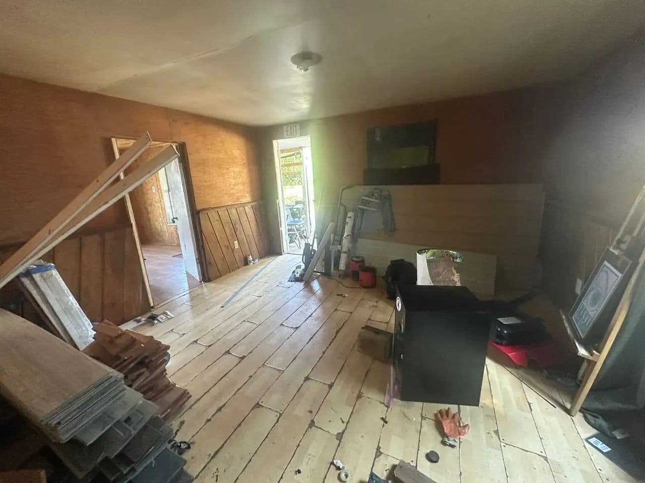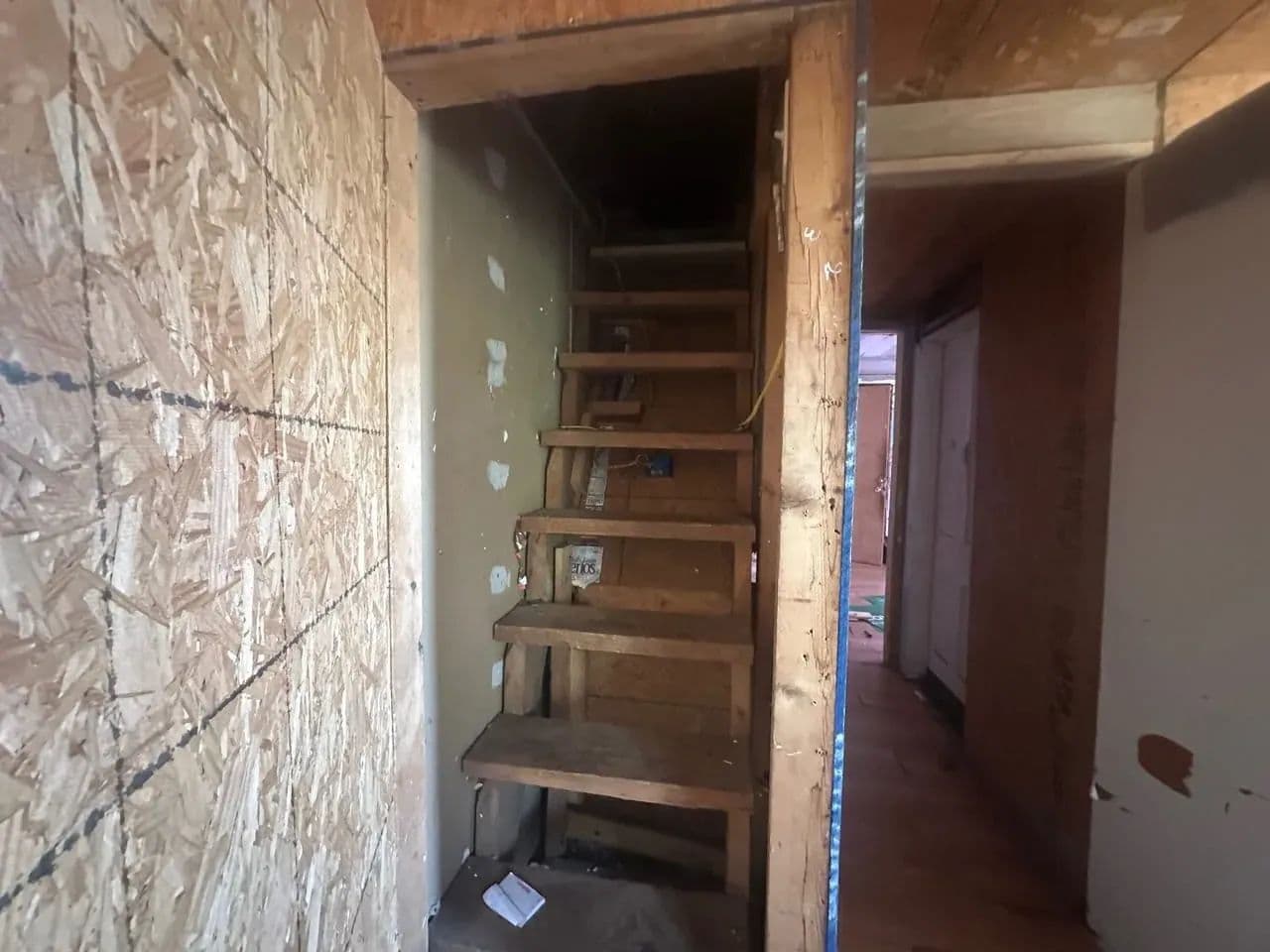 The main level offers 2 bedrooms and 1 full bath, with the seller reporting an additional 2 bedrooms and half bath upstairs. The stairwell has been removed, so access to the second floor will need to be reestablished. The home has power and water connections, though both services are currently shut off.