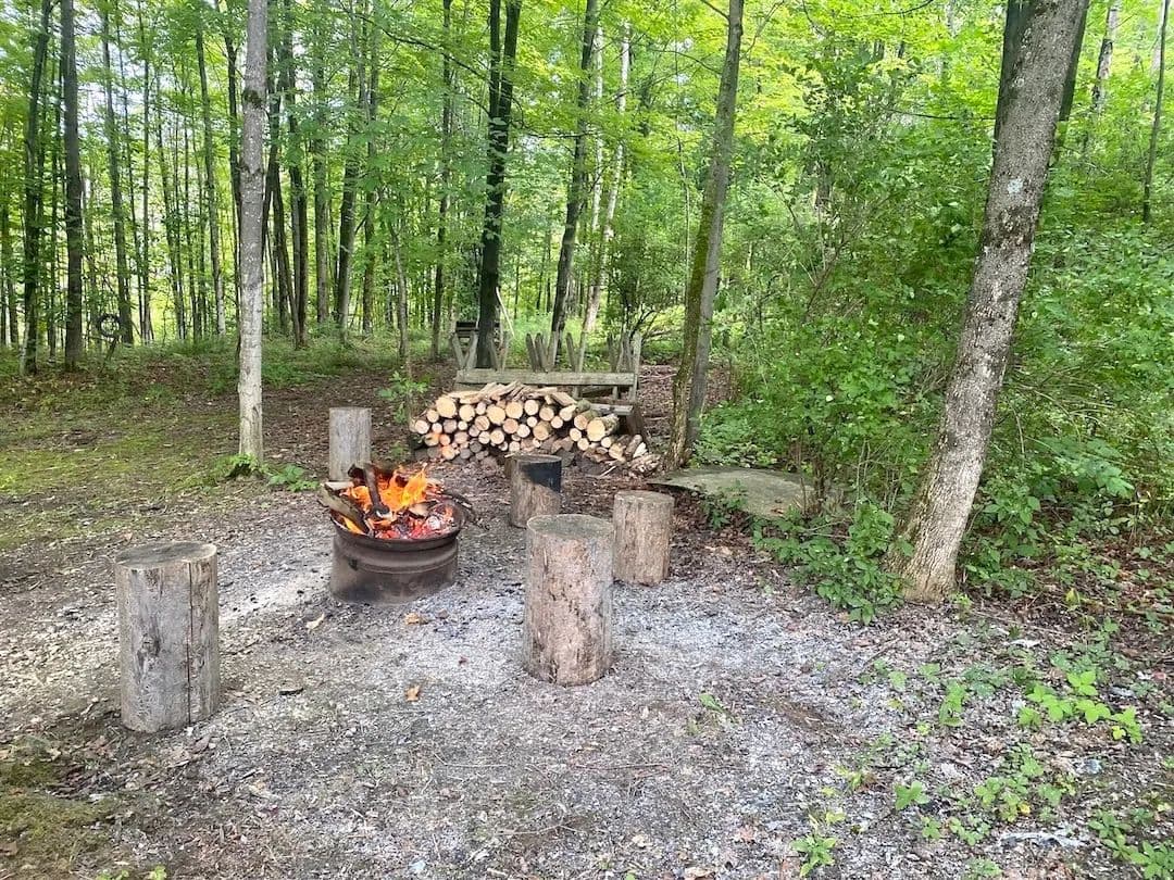 Step outside to a large open deck and enjoy the unique outdoor amenities including an enclosed shower with propane on-demand hot water, a rainwater collection system with storage, and an on-site outhouse. The yard features a designated fire pit area offering a comfortable space to relax and enjoy the outdoors. Surface rights convey.
