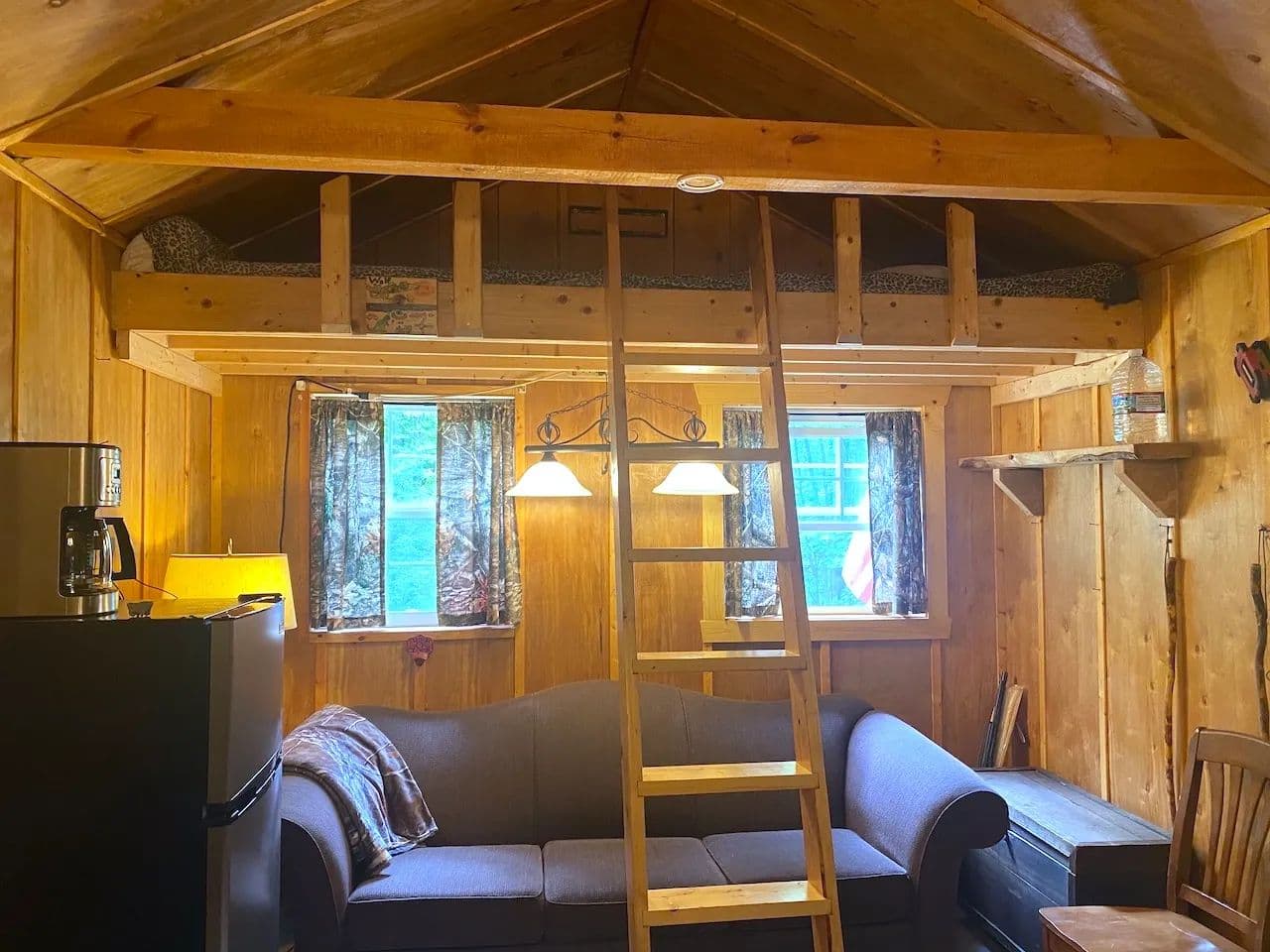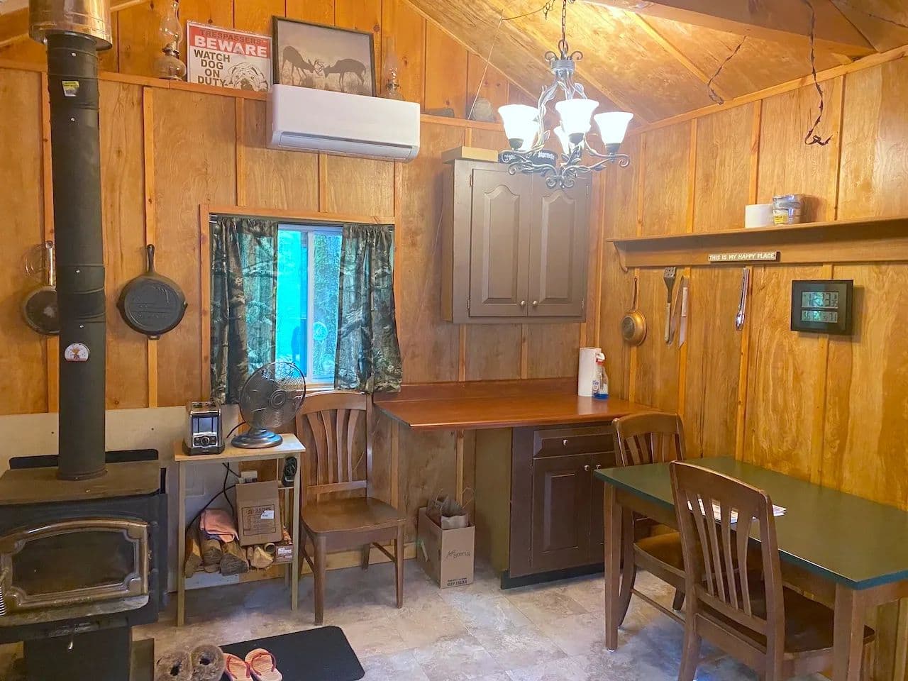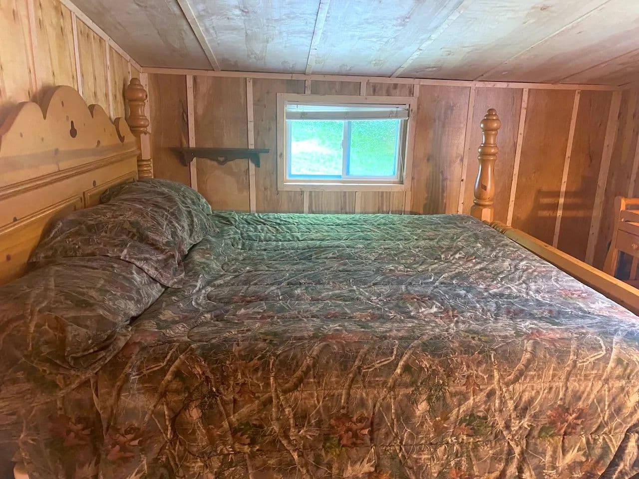 The cabin has an open-concept layout with a spacious bedroom and a half-bath on the main level, along with a loft that provides additional sleeping space for children or guests. A newer mini-split heating and cooling system ensures comfort in all seasons, and a fire-view wood stove adds additional warmth during hunting season.