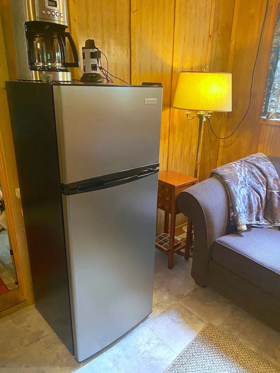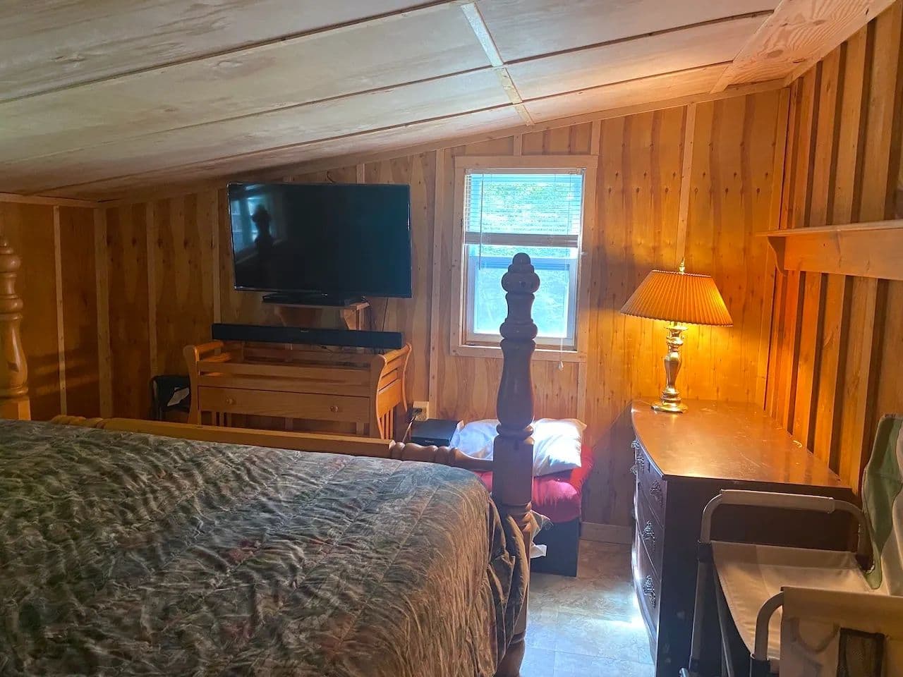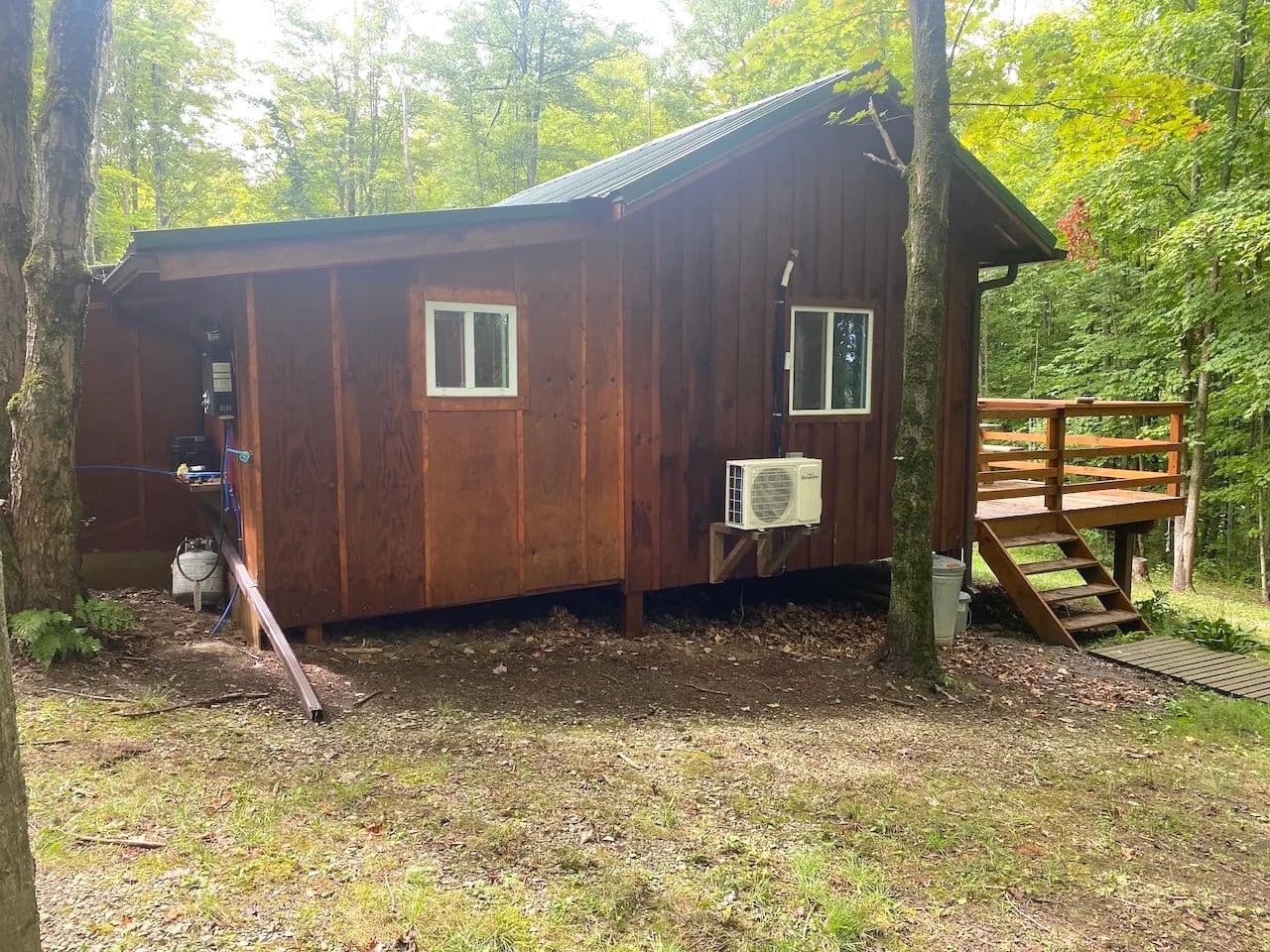 The cabin has an open-concept layout with a spacious bedroom and a half-bath on the main level, along with a loft that provides additional sleeping space for children or guests. A newer mini-split heating and cooling system ensures comfort in all seasons, and a fire-view wood stove adds additional warmth during hunting season.