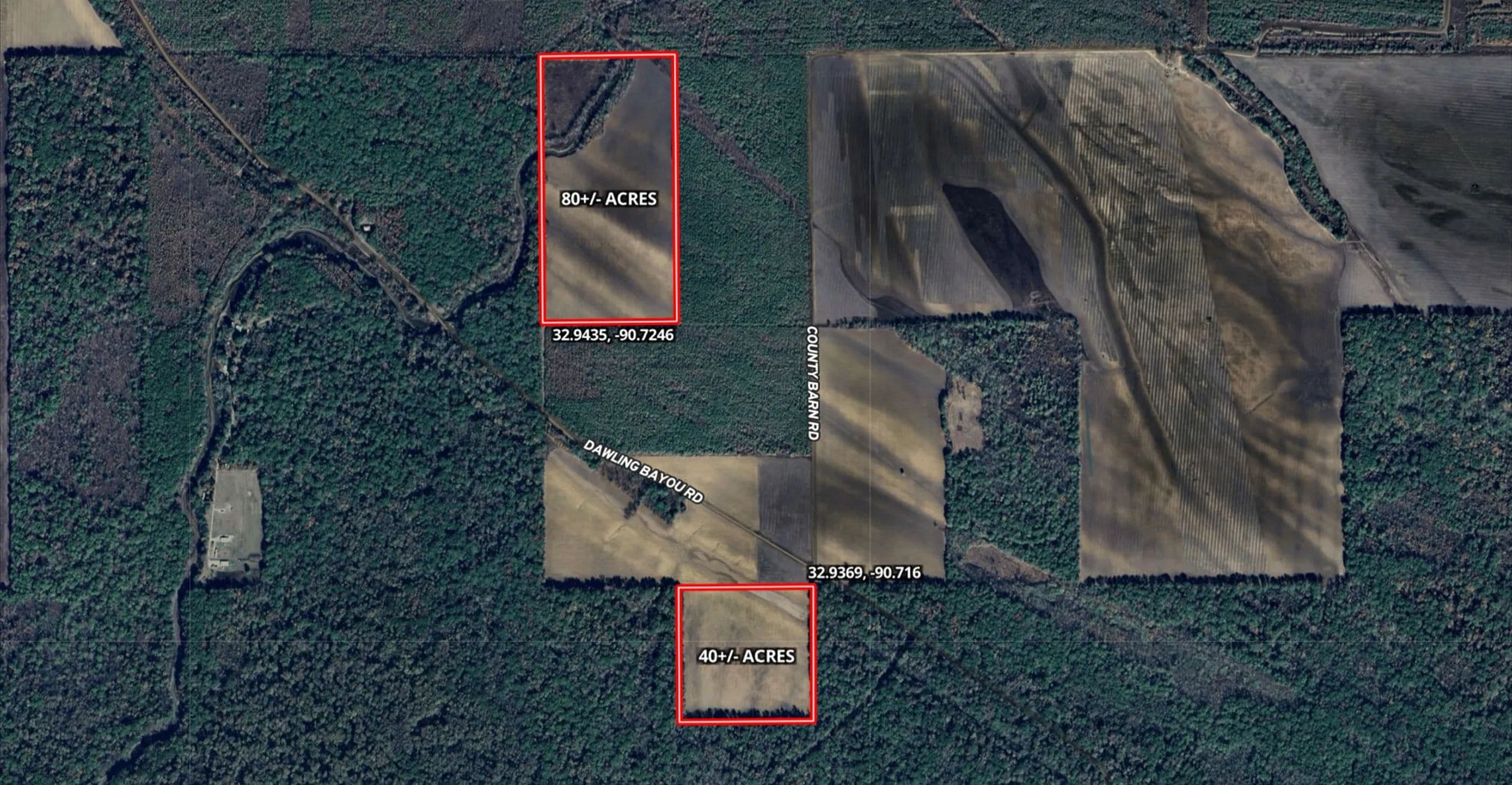 The 80± acre tract is completely surrounded by the National Forest, while the 40± acre tract borders the forest on two sides. Dawling Bayou runs through 10± acres of the northeast portion of the 40± acre tract, creating an additional draw for wildlife and enhancing your hunting opportunities.
