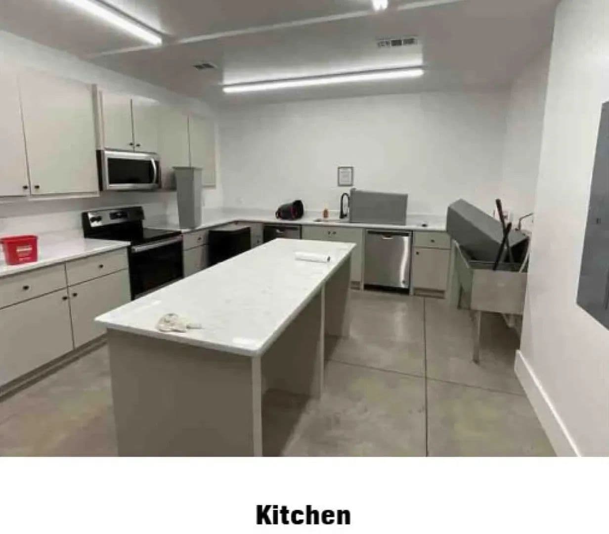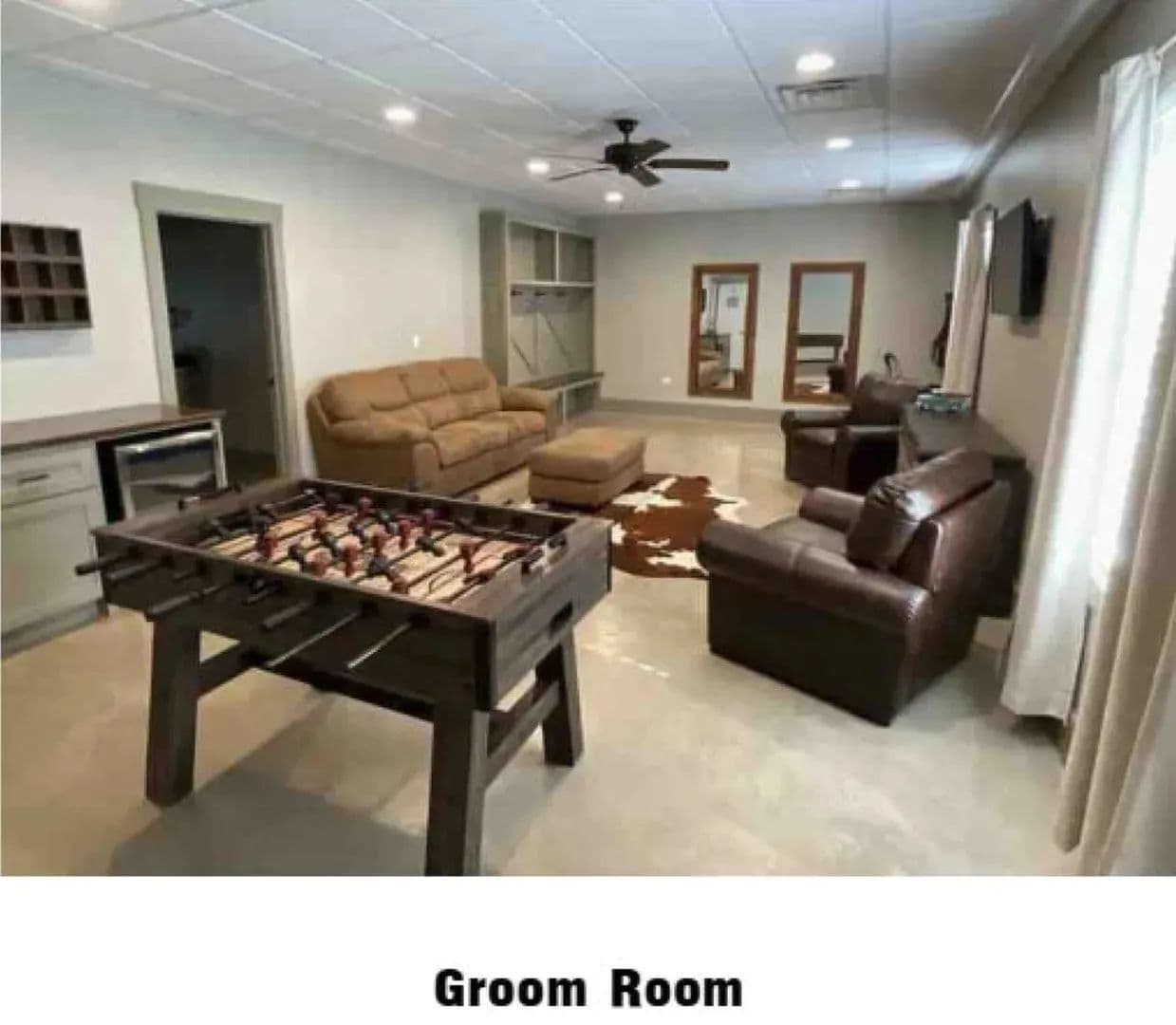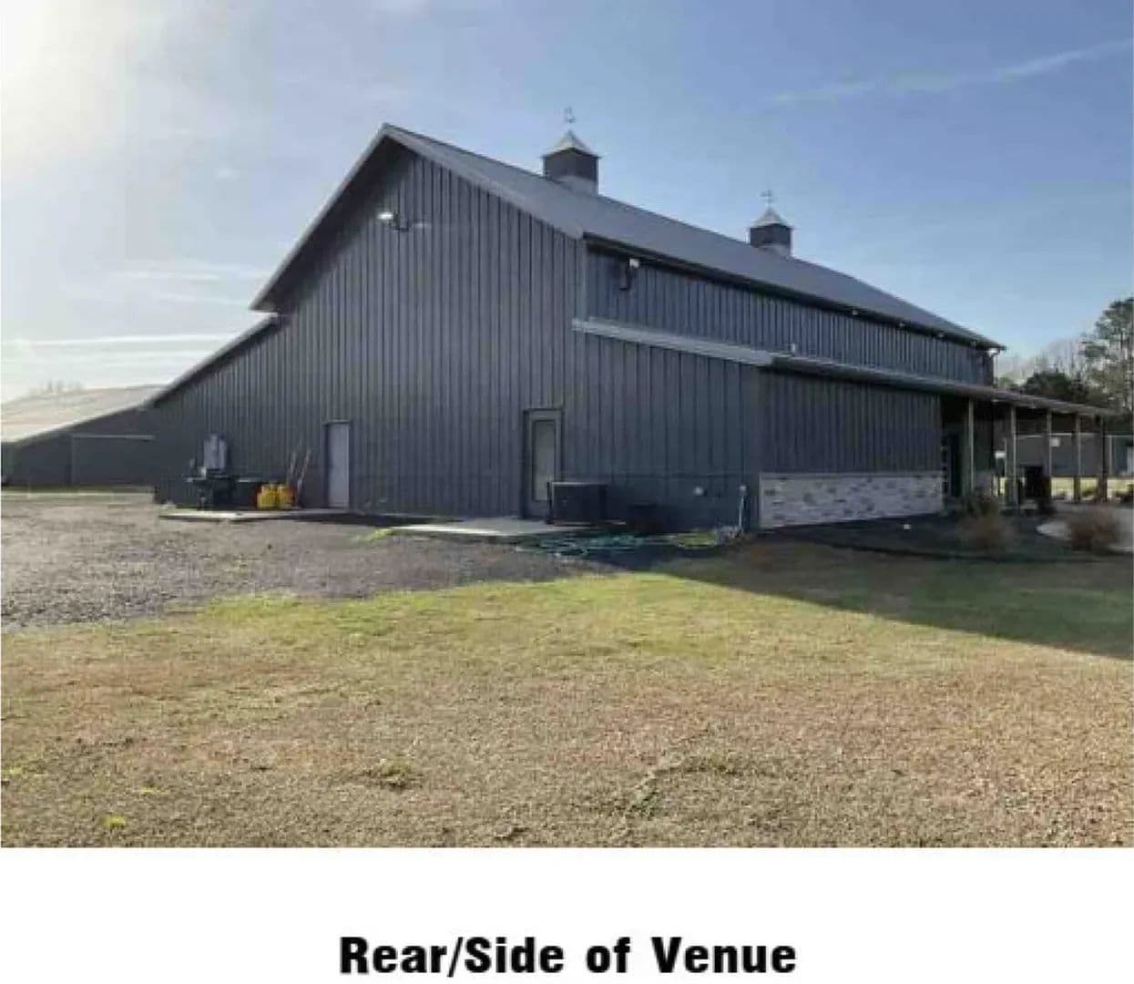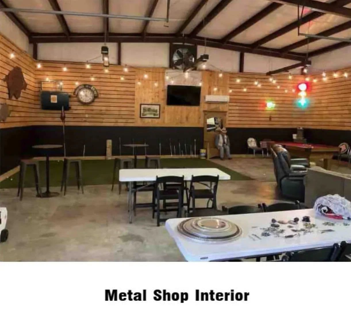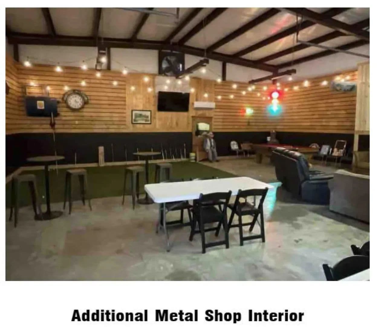 • 2,400 SF metal party barn featuring a bar, small kitchen, golf simulator, and televisions—ideal for private events, watch parties, or corporate retreats