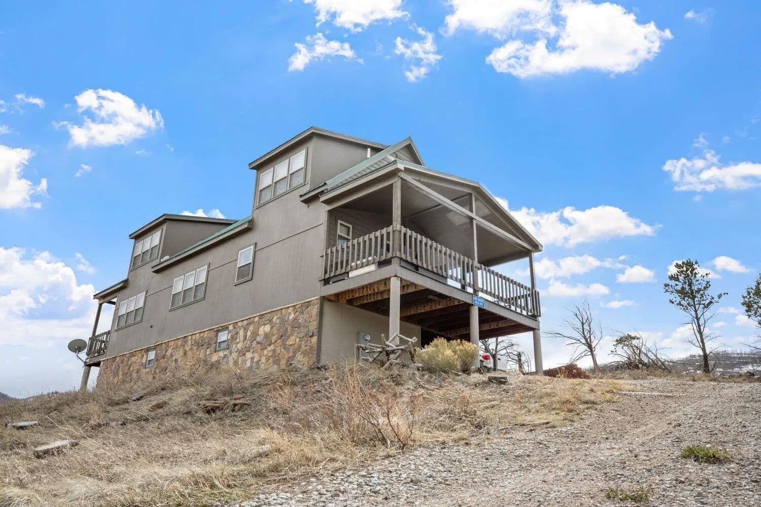 Your perfect retreat awaits in this stunning 2,016 square foot, 3-bedroom, 3-bathroom home, tucked inside a serene and private gated community. This two-story residence showcases breathtaking mountain views, offering the ideal backdrop for tranquility and relaxation. Hardwood floors flow throughout the expansive living spaces, while the kitchen connects seamlessly to the dining room—an entertainer's dream. Gather around the cozy fireplace in the living room, or enjoy the covered front and back decks, perfect for soaking in the wide-open scenery. Here, you'll experience life on the edge of the frontier—close to the spirit of the Wild West—without sacrificing modern amenities like blazing-fast 2.5 GB symmetrical internet from Jade Communications. The property is equipped with its own well and a septic system recently cleaned in 2023. The survey was completed in 2020. With its combination of privacy, stunning views, and modern comforts, this home also has strong potential as a short term rental, offering guests an unforgettable mountain retreat. A rare blend of privacy, comfort, and rugged beauty, this home offers everything you've been searching for.