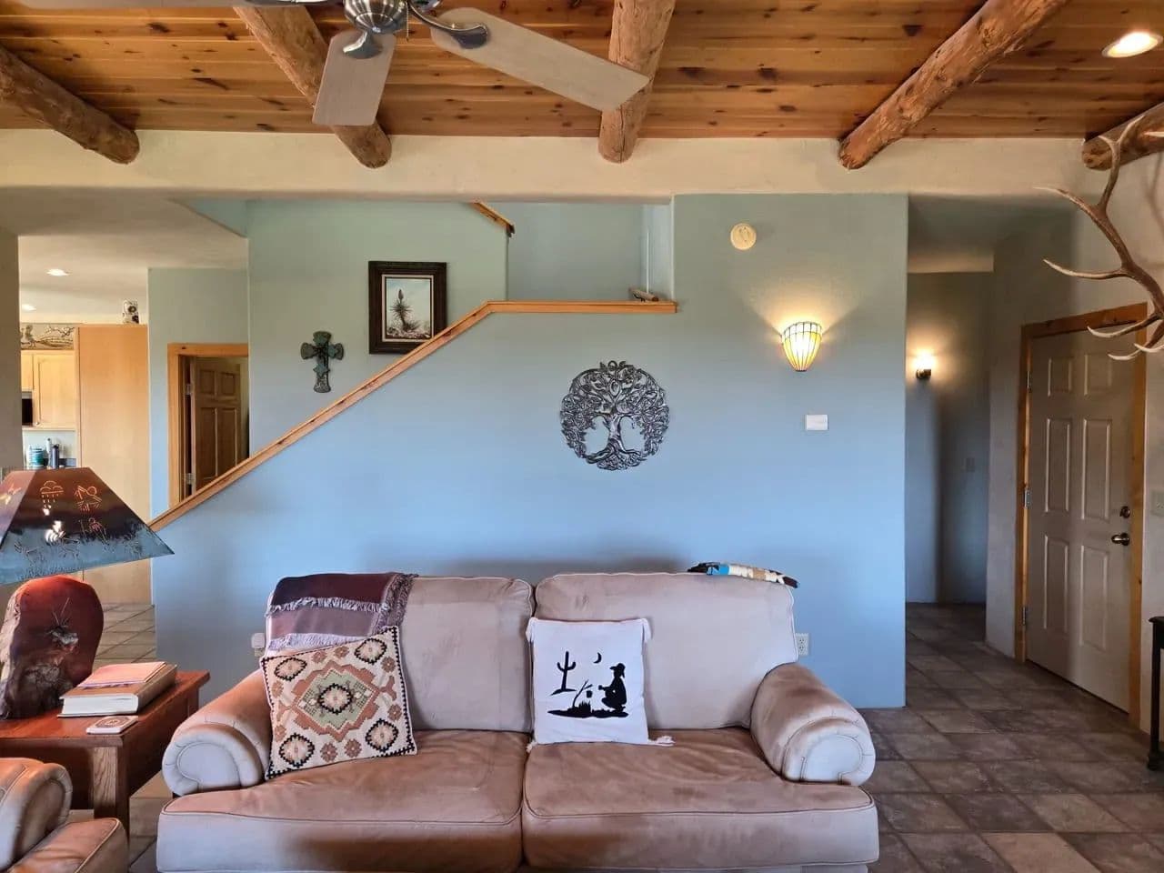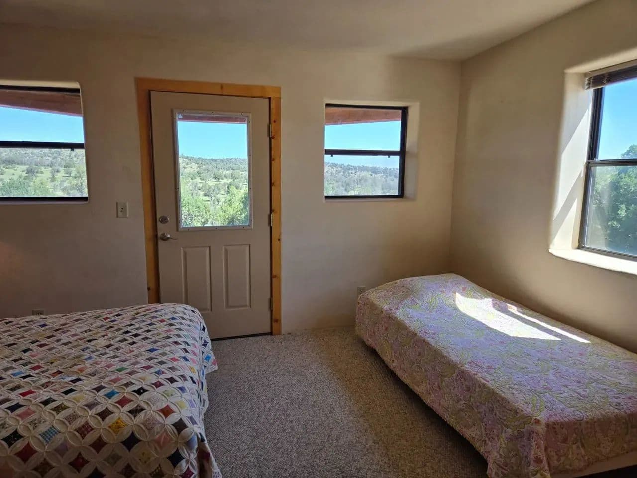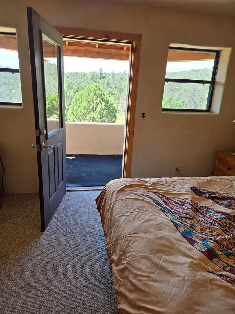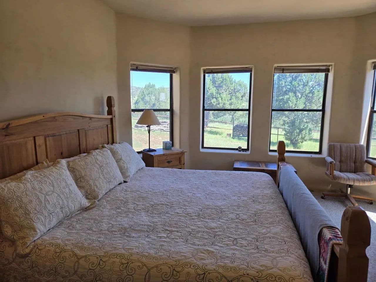 It also features a screened-in porch, as well as a raised garden bed and two upstairs balconies with stunning panoramic views of sun-swept skies. This durable, efficient southwestern villa includes a solid cement foundation, hydronic radiant heat flooring, insulated concrete form(ICF) walls, and custom Southwest cabinetry.