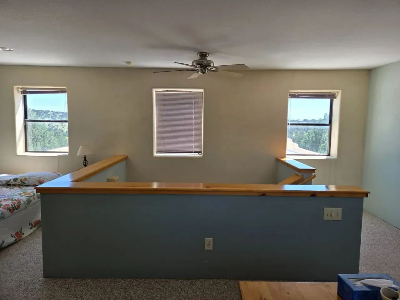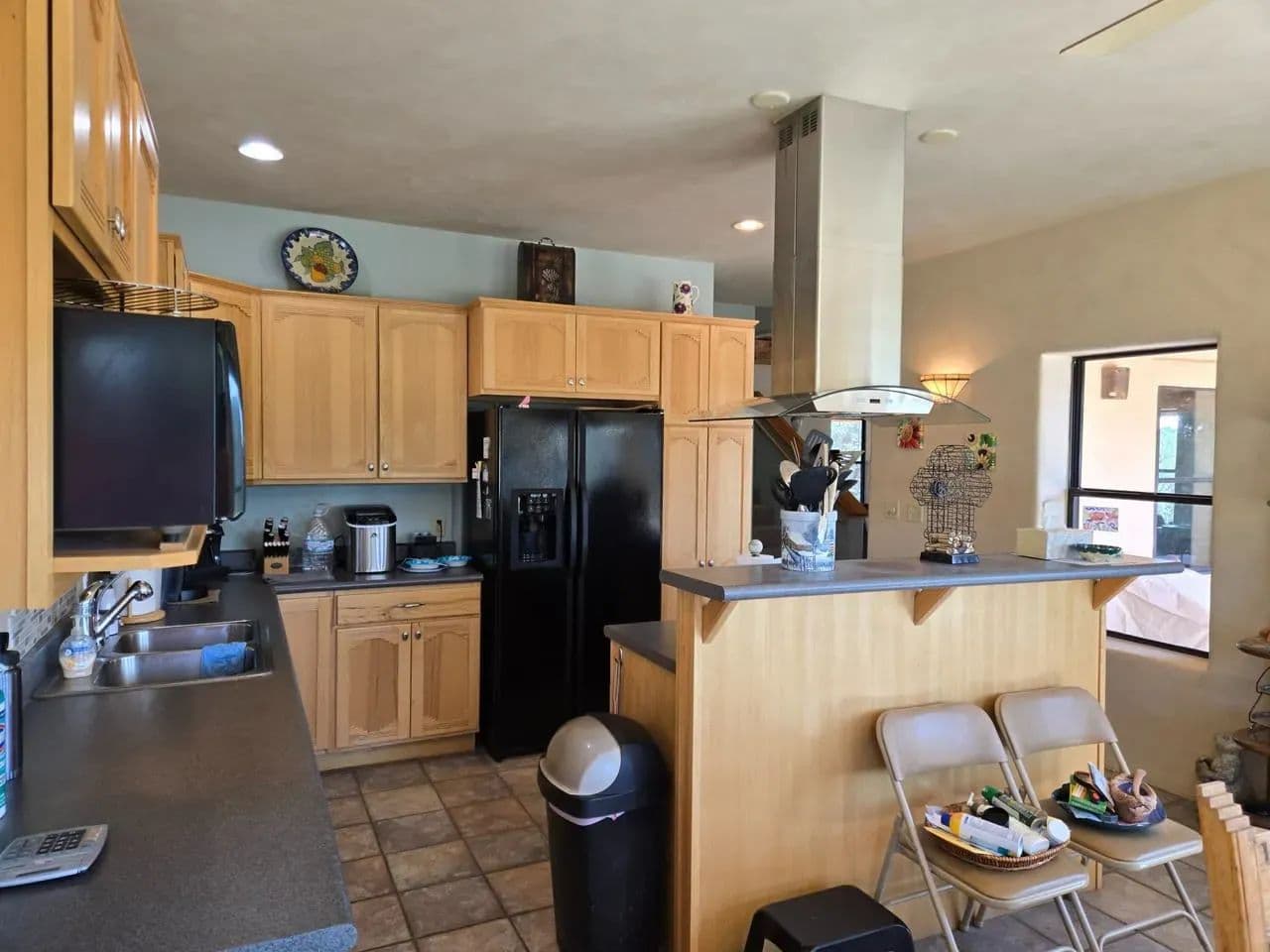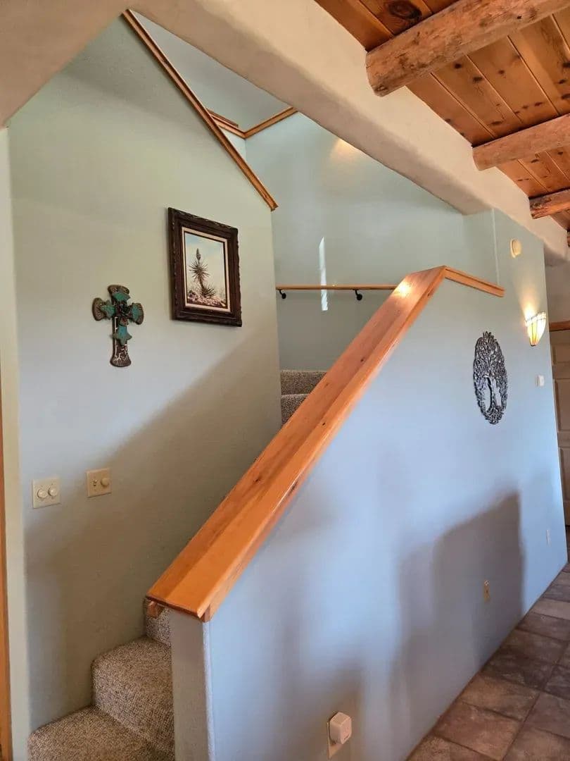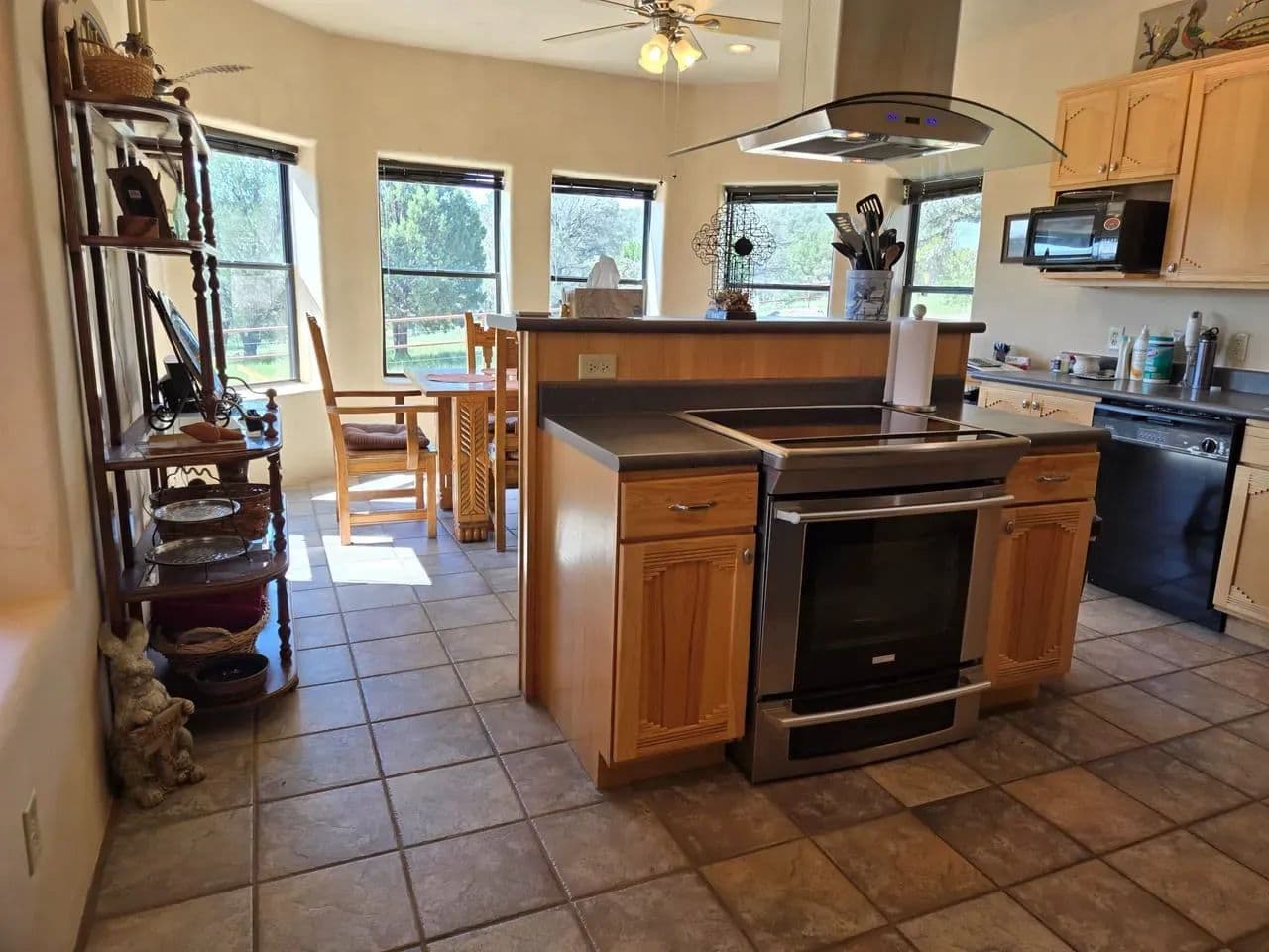 It also features a screened-in porch, as well as a raised garden bed and two upstairs balconies with stunning panoramic views of sun-swept skies. This durable, efficient southwestern villa includes a solid cement foundation, hydronic radiant heat flooring, insulated concrete form(ICF) walls, and custom Southwest cabinetry.