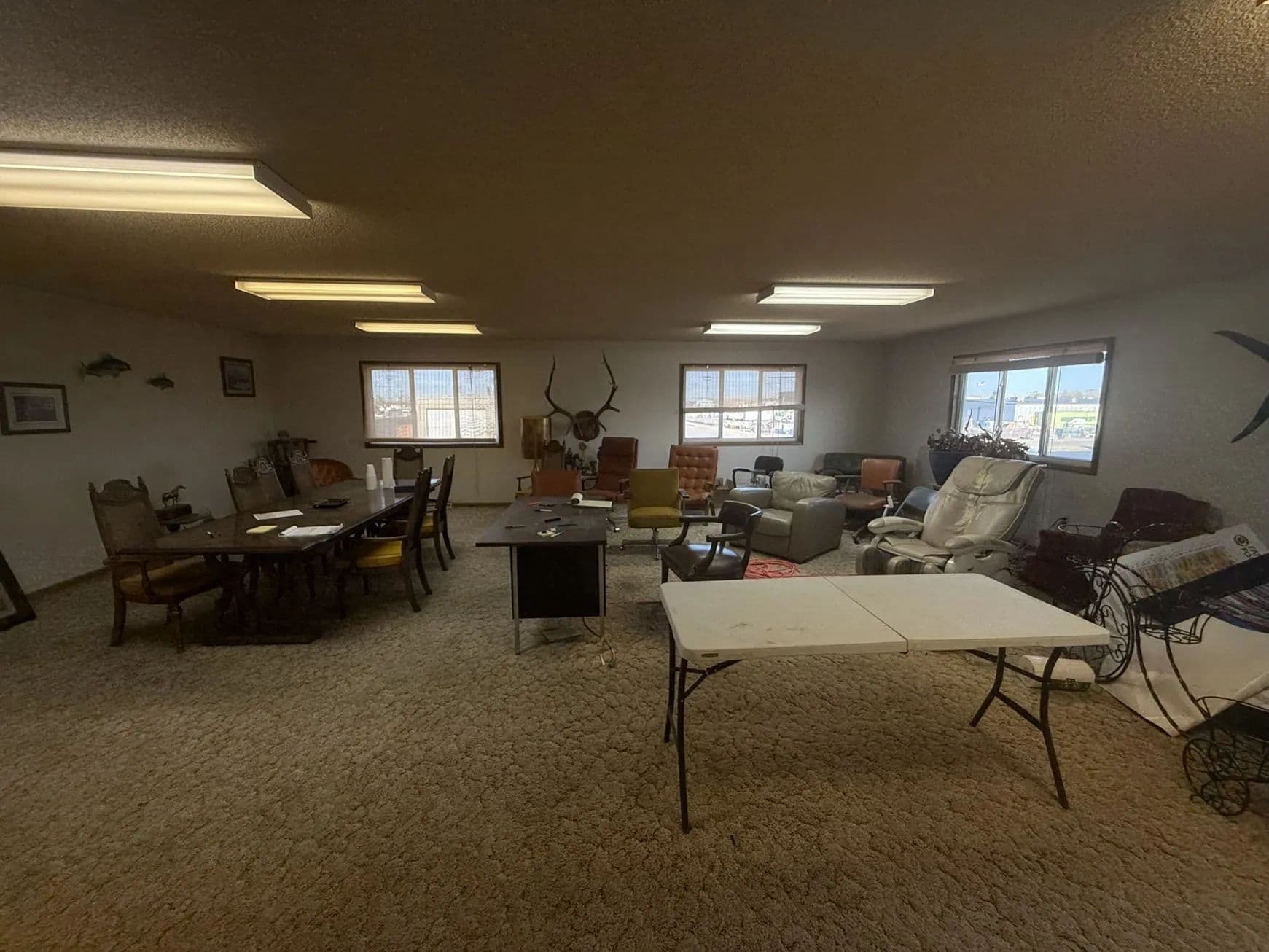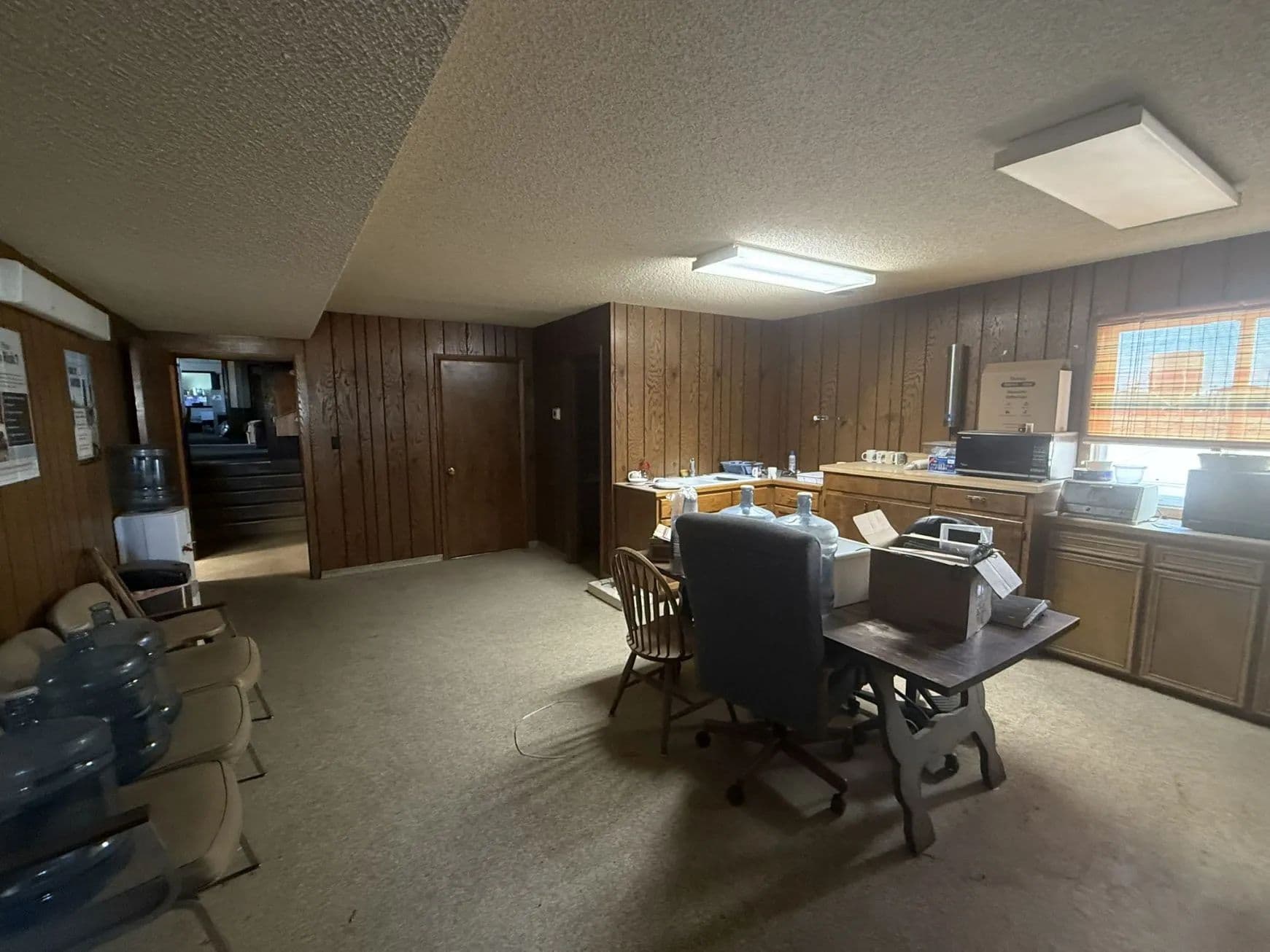 Breakroom with kitchen, offices & reception area, bathrooms on each level, and upper-level meeting room, wet bar, and ¾ bath