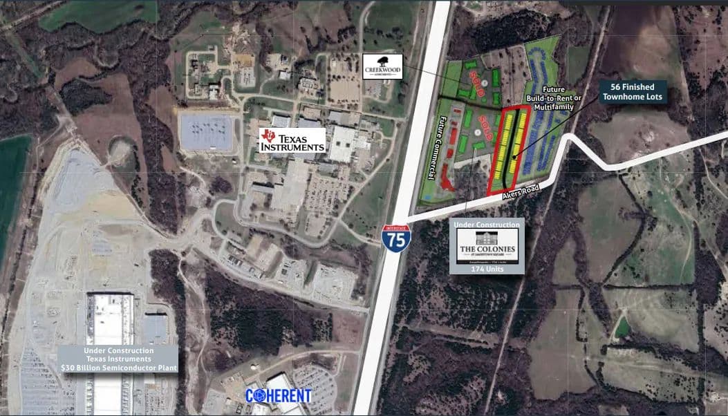 Jamestown Square will also include retail, multifamily, and build-to-rent in addition to the townhomes. The Site is prominently located along US-75 directly across from Texas Instruments and its future $30 billion semiconductor plant that is currently under construction. This represents a great opportunity to acquire finished lots in a prime location within the growing Sherman market.