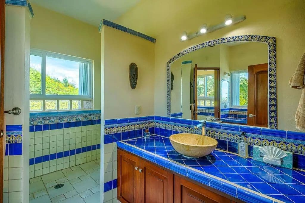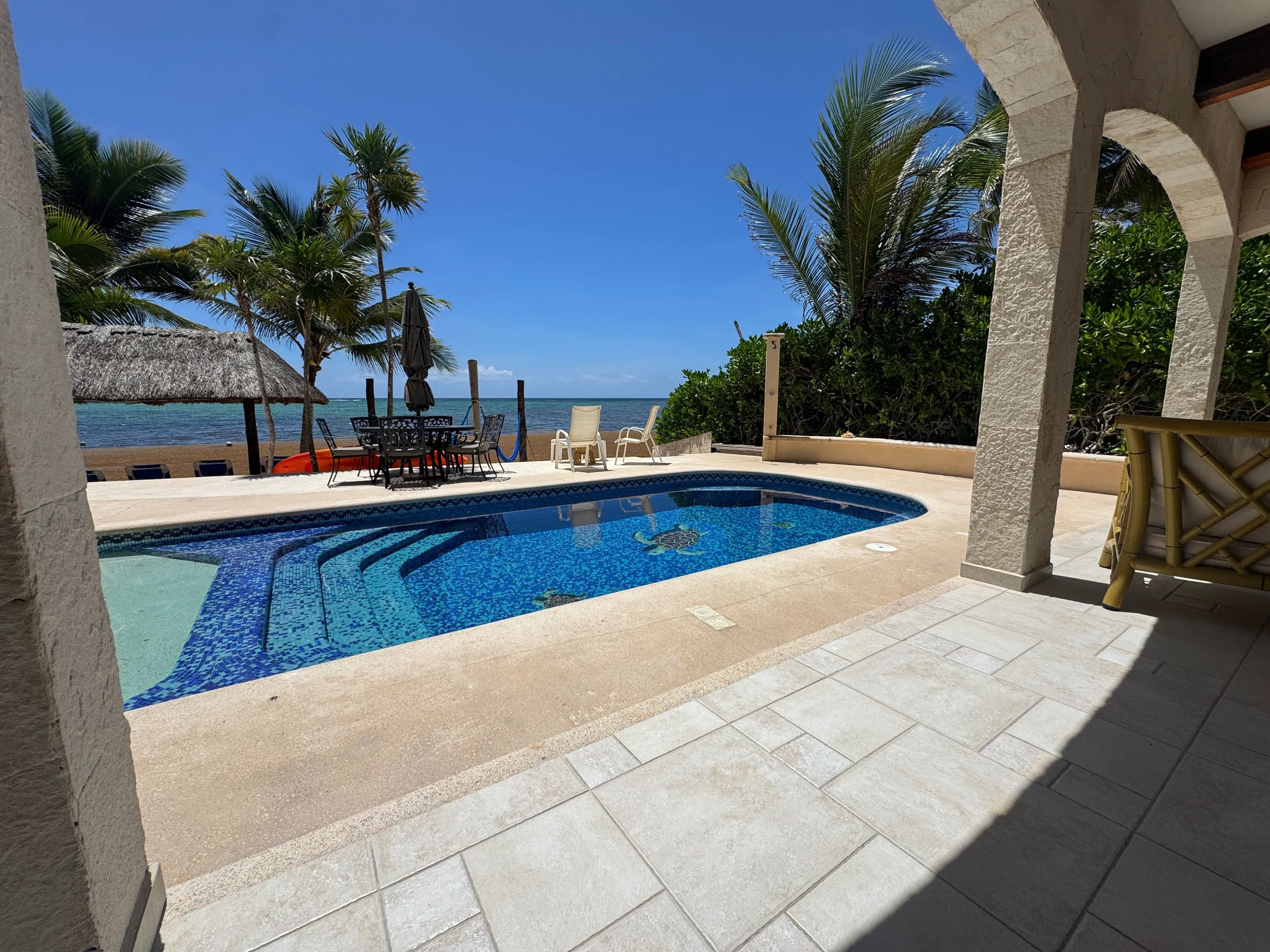 Walk straight onto the shores of Soliman Bay from Margarita Villa, your charming and colorful home away from home. This gorgeous beachfront villa is set against the backdrop of one of the Riviera Maya’s most envied beaches and located just north of Tulum. The property is about .4 acres, consisting of 75 feet of beachfront exposure and additional parking for at least 6 vehicles at the entrance. The entire property is beautifully landscaped with native trees and bushes with an on-site caretaker keeping everything beautiful. The view out to the private bay (no public access) from multiple patios is breathtaking. Many times, you’ll walk a mile on the beach and pass no one. This is the perfect vacation and rental home your family will cherish for generations.