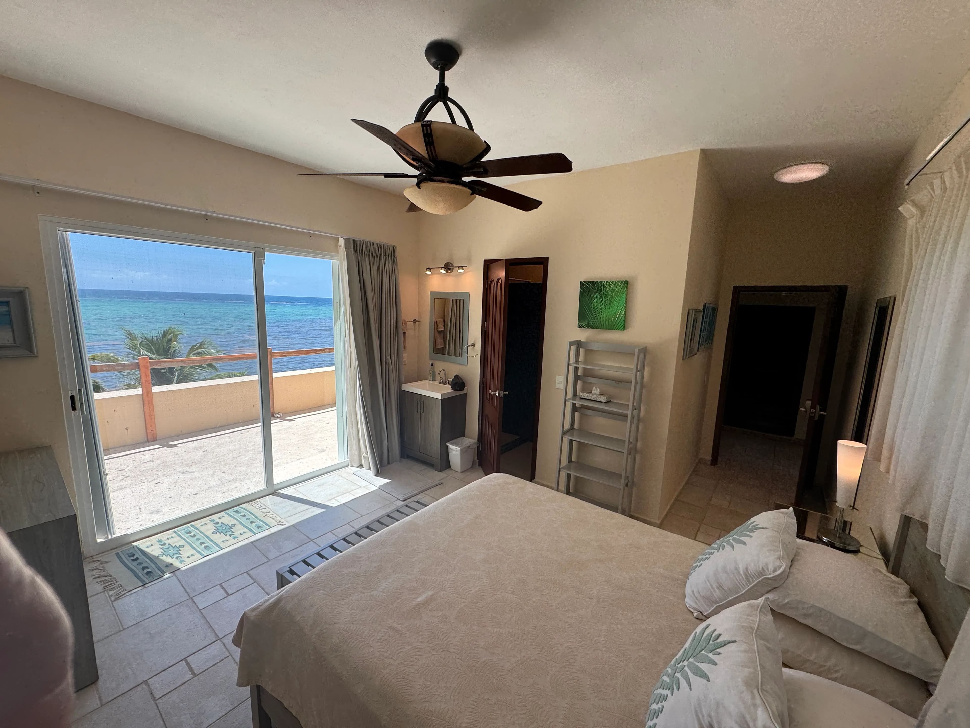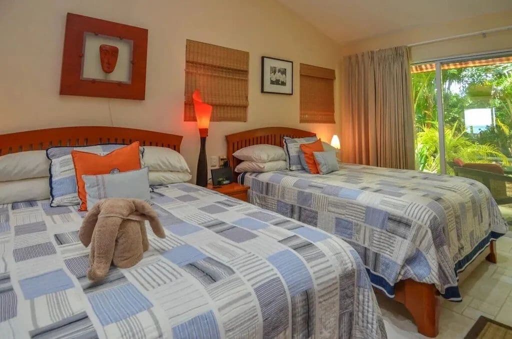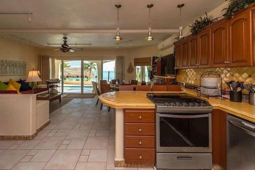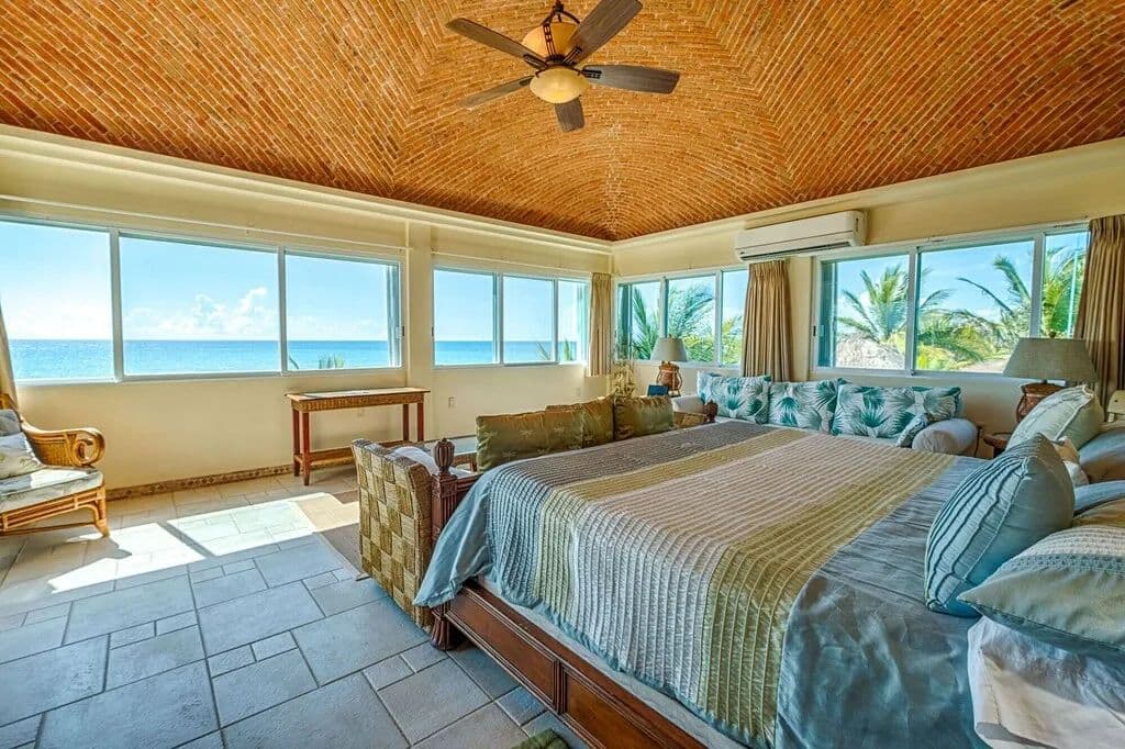 The house has three levels, two bedrooms on each floor, totaling six bedrooms, three with king beds and two of those also have single beds, the remaining rooms have queens. All bedrooms have private bathrooms, air conditioners and glass sliding doors. The only room not facing the ocean is the Garden bedroom, but this room has a washer/dryer and an outside shower, all the kids love this room, it’s close to the pantry! The front door has a huge patio with a refrigerator, freezer and grill. Soliman Bay resembles a residential neighborhood with tight security and very kind neighbors of all ages. There is also a small caretaker’s house, detached garage, storage and beachside palapa. You must come see for yourself because it really is this gorgeous!