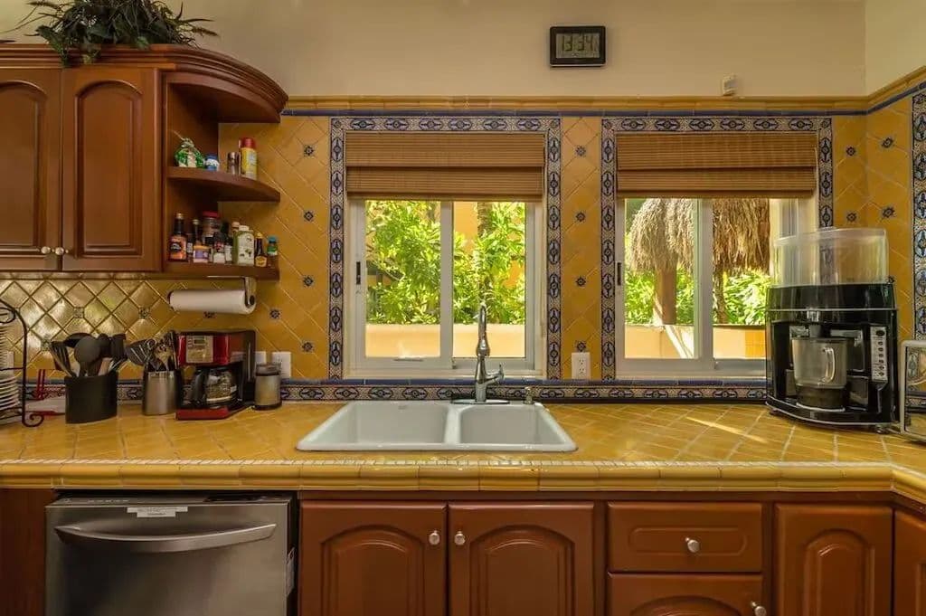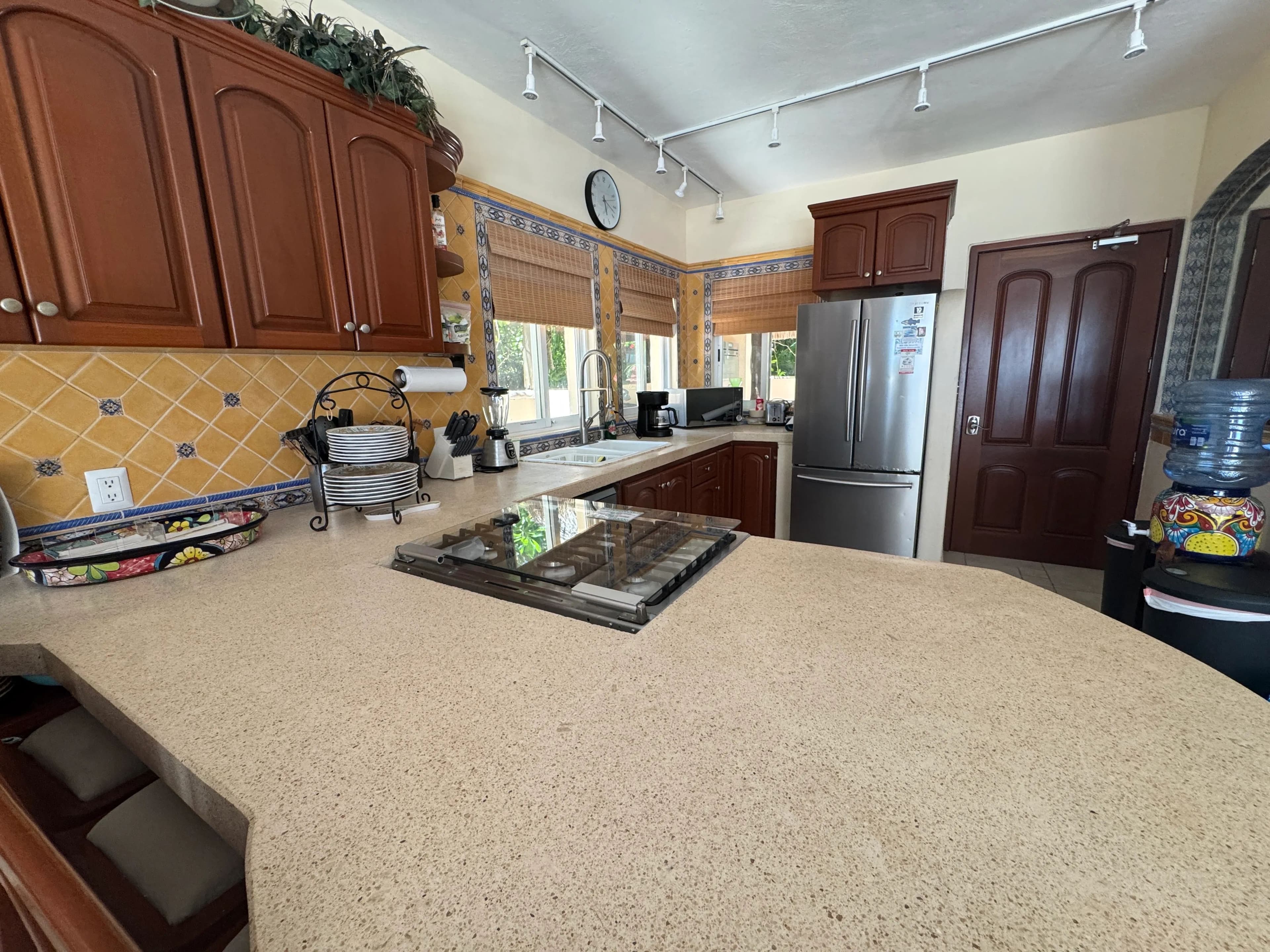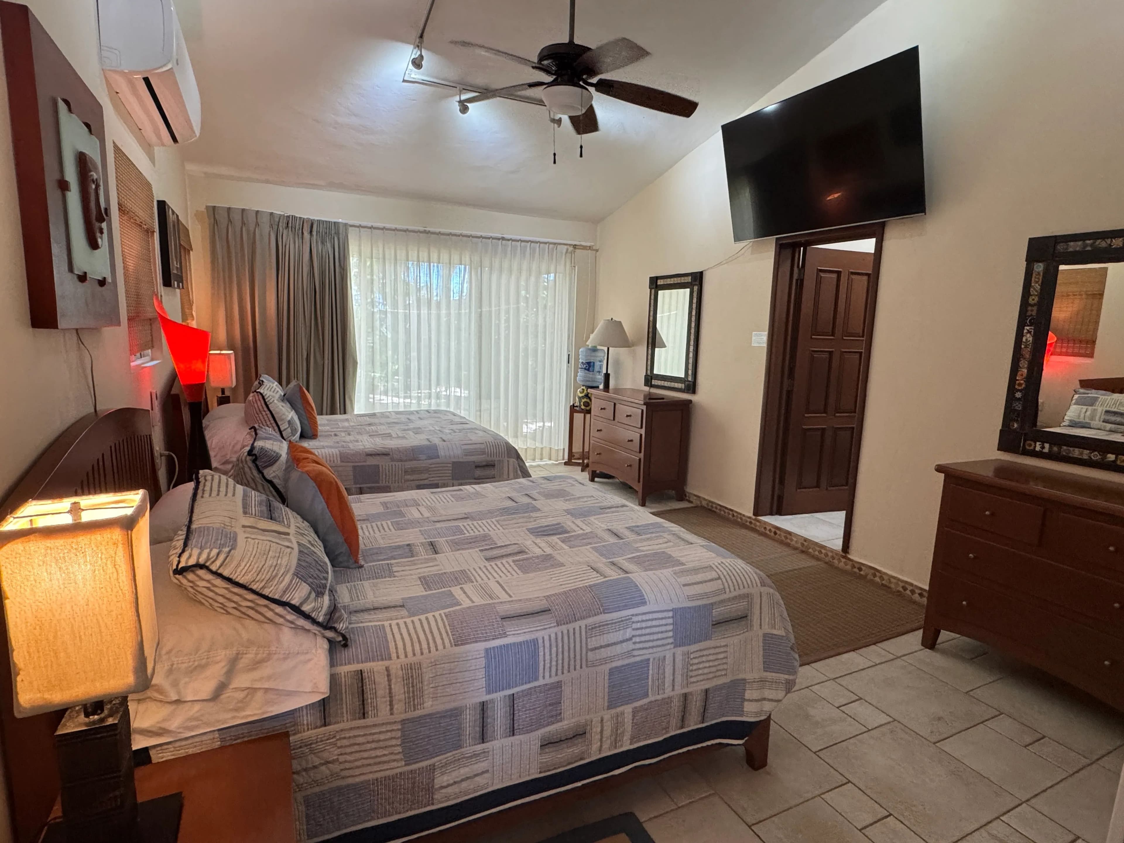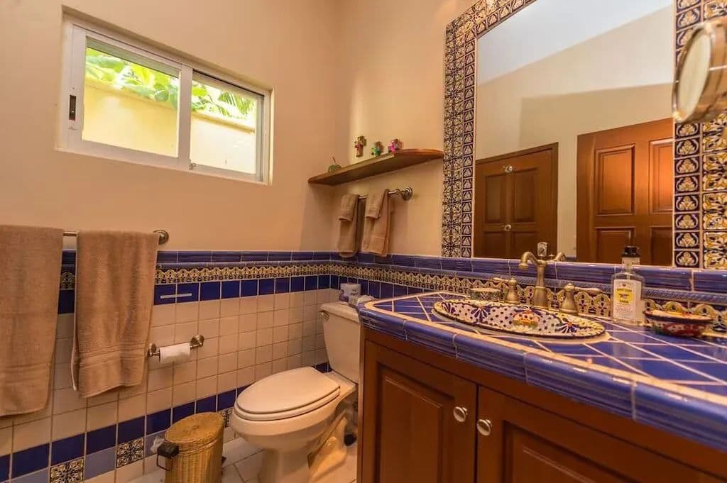 The house has three levels, two bedrooms on each floor, totaling six bedrooms, three with king beds and two of those also have single beds, the remaining rooms have queens. All bedrooms have private bathrooms, air conditioners and glass sliding doors. The only room not facing the ocean is the Garden bedroom, but this room has a washer/dryer and an outside shower, all the kids love this room, it’s close to the pantry! The front door has a huge patio with a refrigerator, freezer and grill. Soliman Bay resembles a residential neighborhood with tight security and very kind neighbors of all ages. There is also a small caretaker’s house, detached garage, storage and beachside palapa. You must come see for yourself because it really is this gorgeous!
