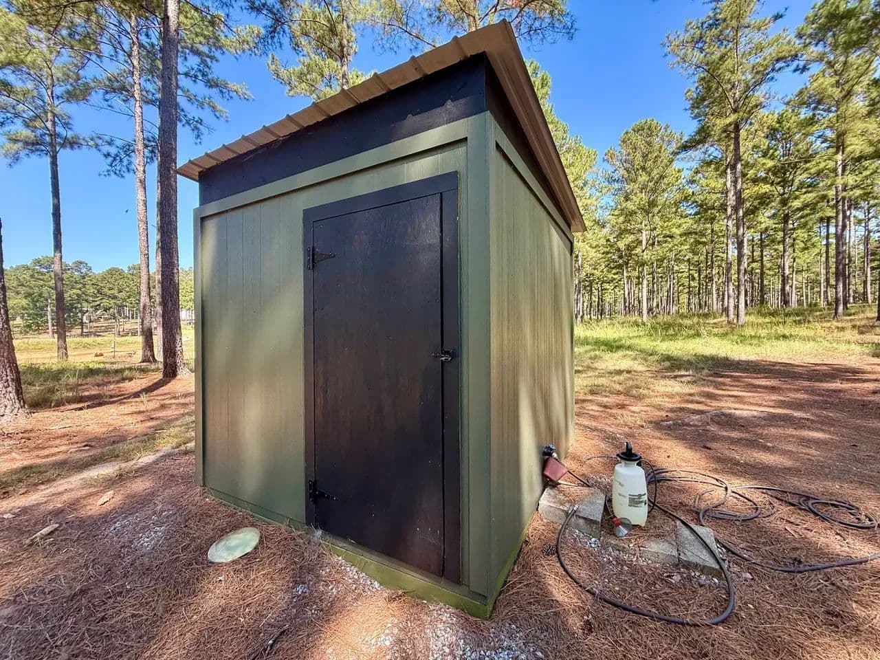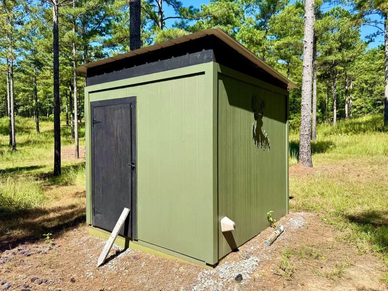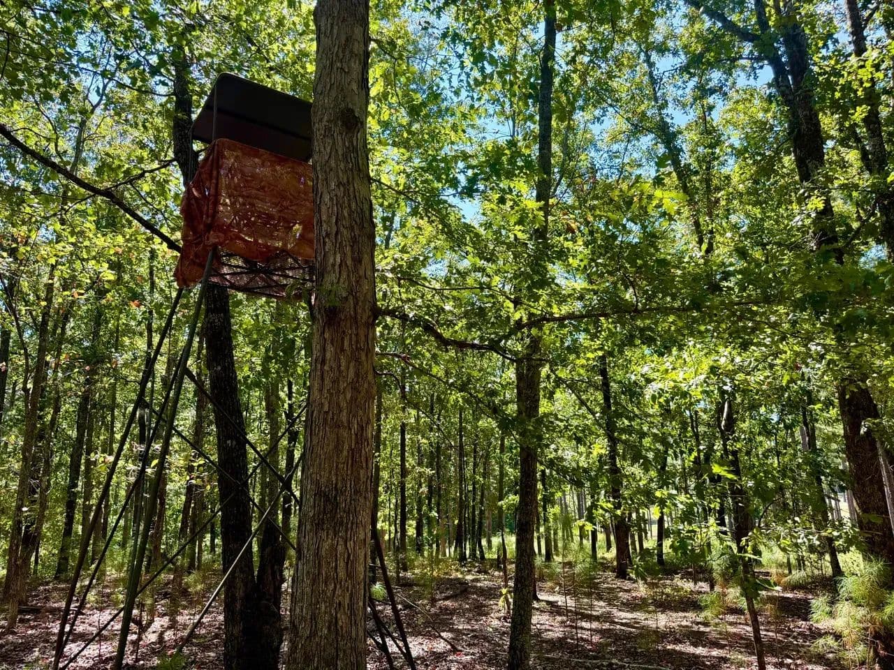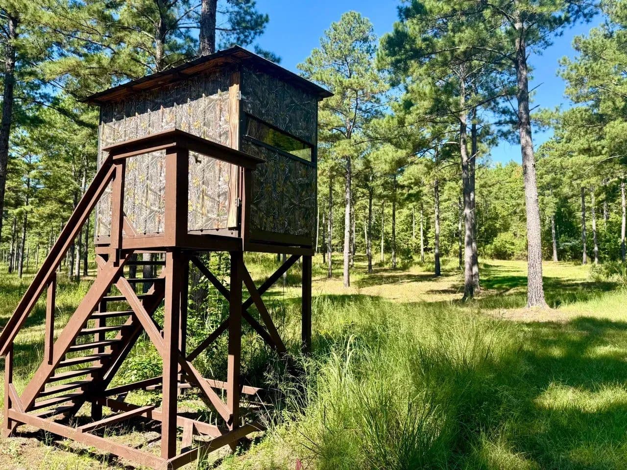 8' tall 5x8 Fat Boy Blind with metal roof, stairway and hand rails purchased in 2022. Feeders, portable deer stands, 2 ground blinds, deer processsing tripod, and trail cameras included.