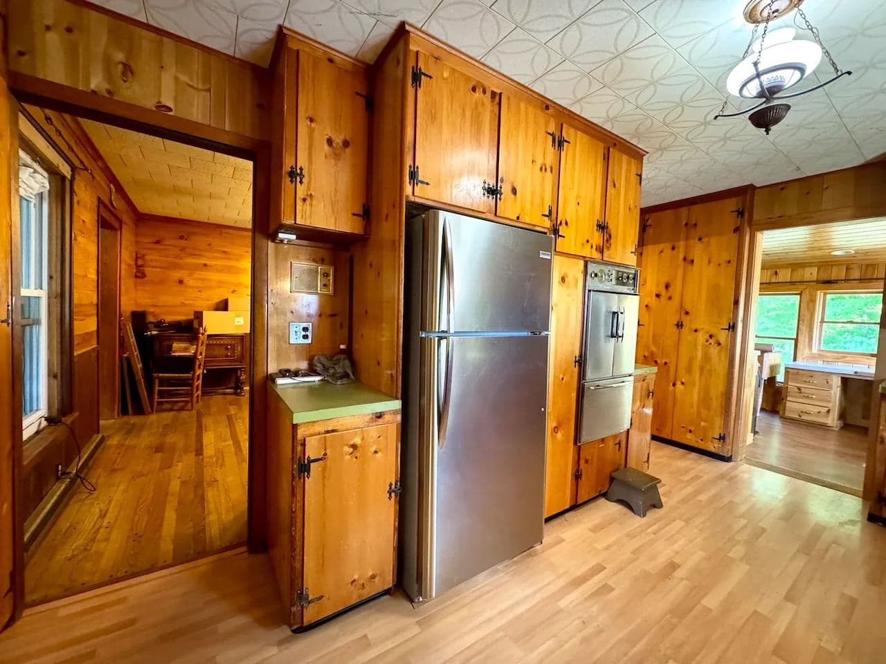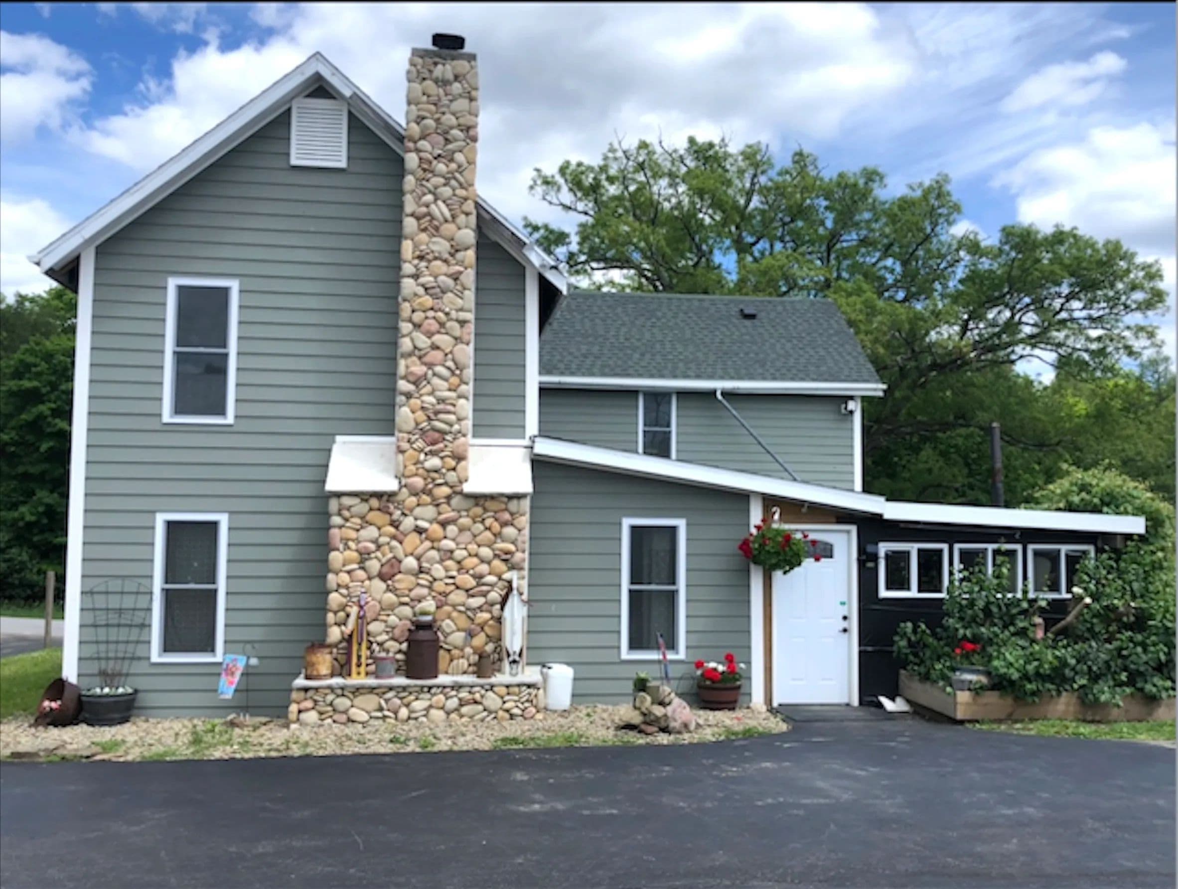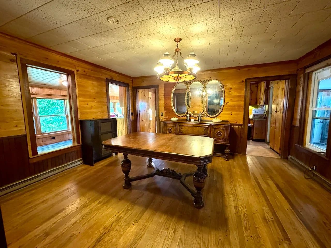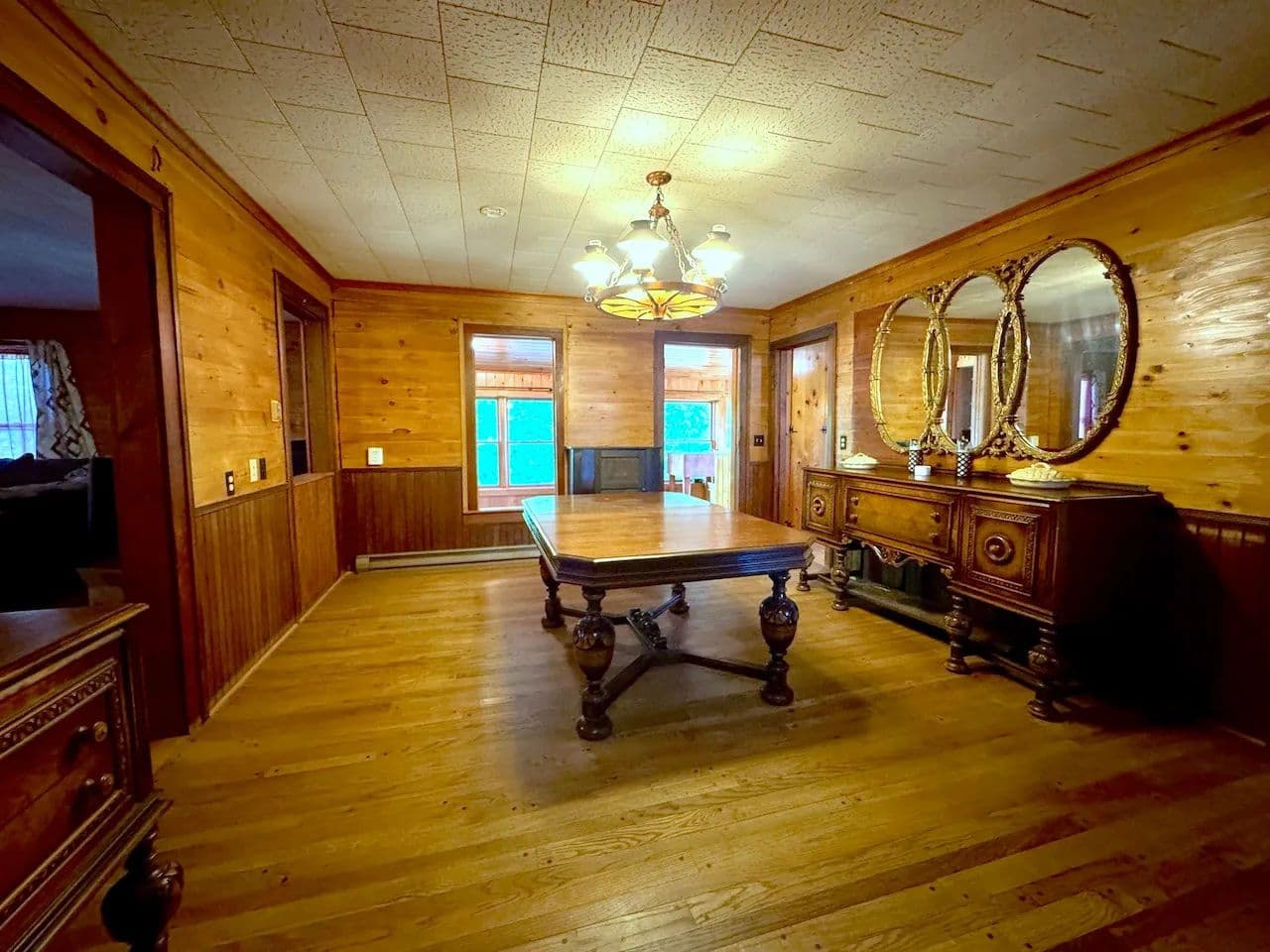 With hardwood floors, knotty pine shiplap walls, and two fireplace inserts, this home exudes rustic charm while providing modern comforts. The country kitchen is full of character featuring custom pine cabinetry and stainless steel appliances. Just off the kitchen, you’ll find a bright four-season room lined with windows and counter space perfect as a hobby room, office, or art studio. The open formal dining room is spacious enough for entertaining, while the living room centers around a charming fireplace insert for a relaxing atmosphere.