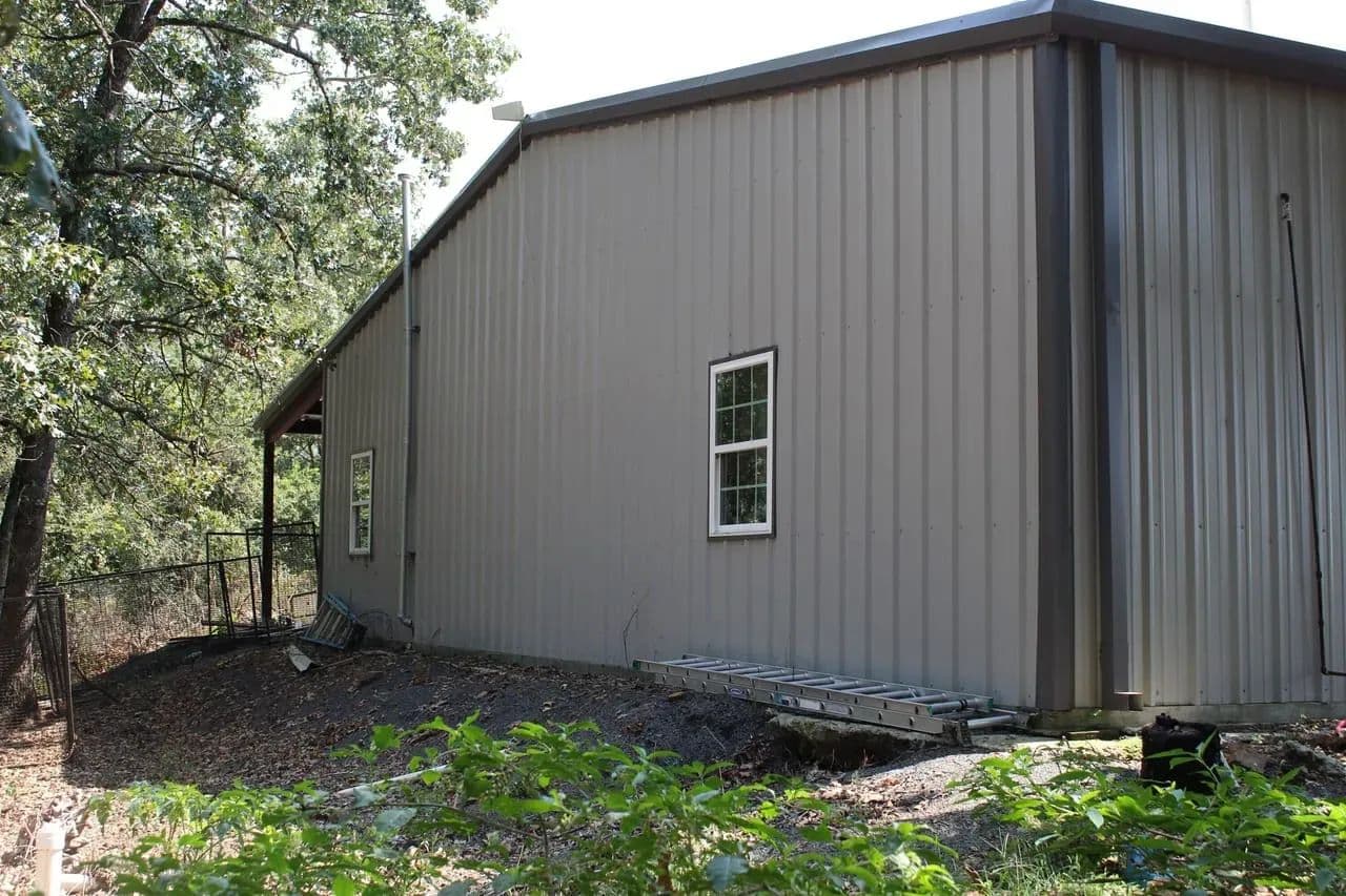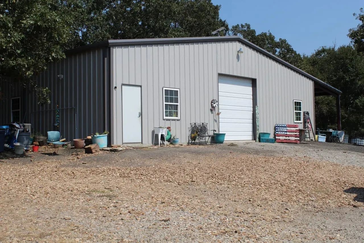 The property boasts a charming 2,000 sq ft shop house, also known as a barndo, complete with a 12 ft lean-to. Inside, you'll find a comfortable 2-bedroom, 1-bath living space with a dedicated laundry room. The open floor plan showcases polished concrete floors and a gorgeous, rustic kitchen, featuring a tin backsplash, butcher-block-style counters, and elegantly antiqued white cabinets. The concrete floors are easy to maintain and gleam with minimal effort. The spacious open area is perfect for family gatherings and entertaining. A pellet stove provides efficient heating, while central AC/heat ensures year-round comfort. This property is a perfect blend of functionality and rustic charm! A well on the property provides the water.