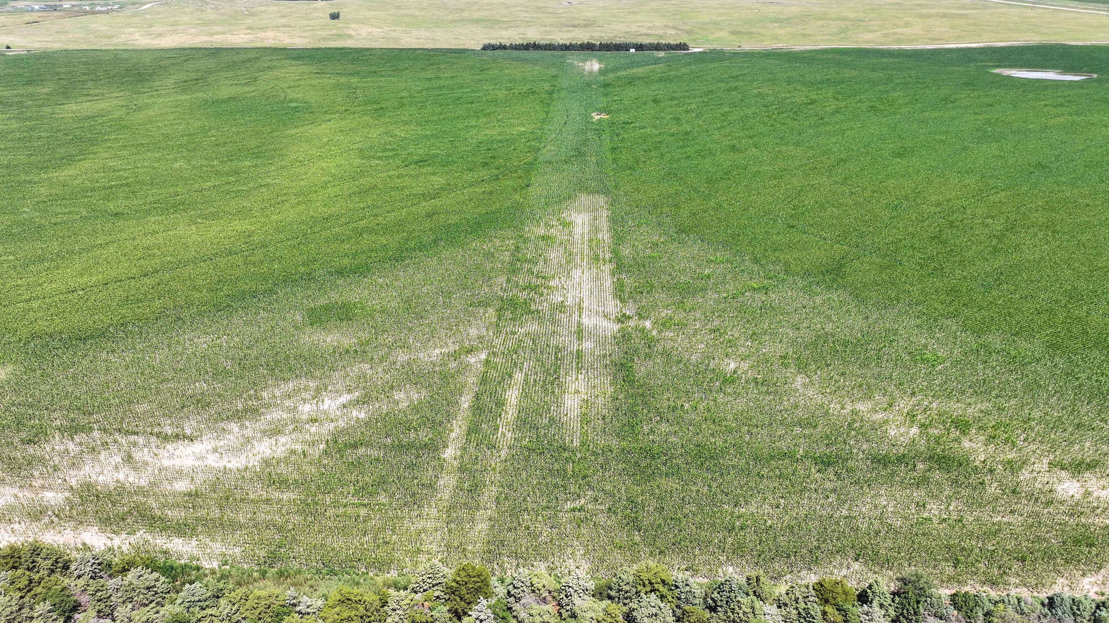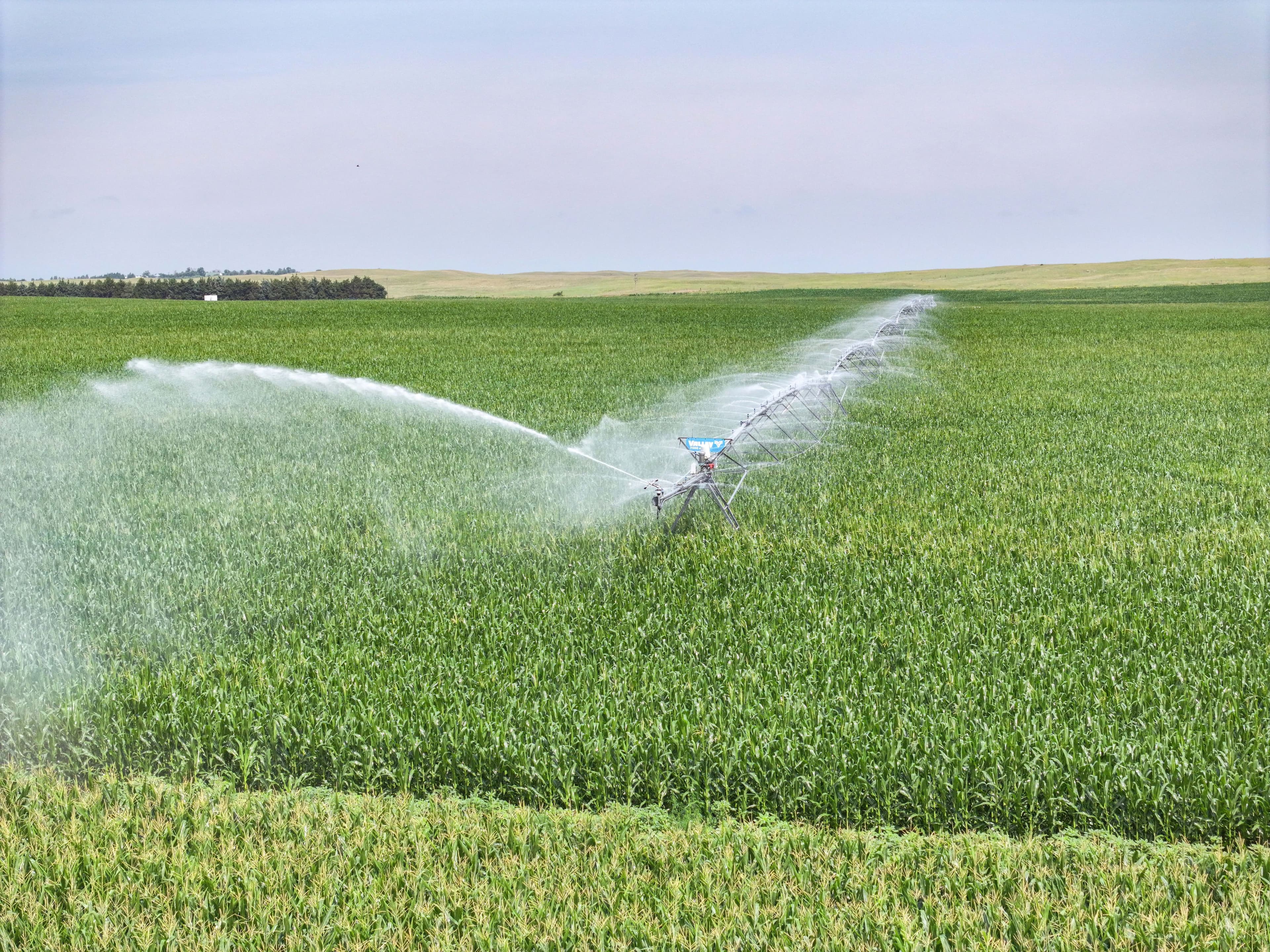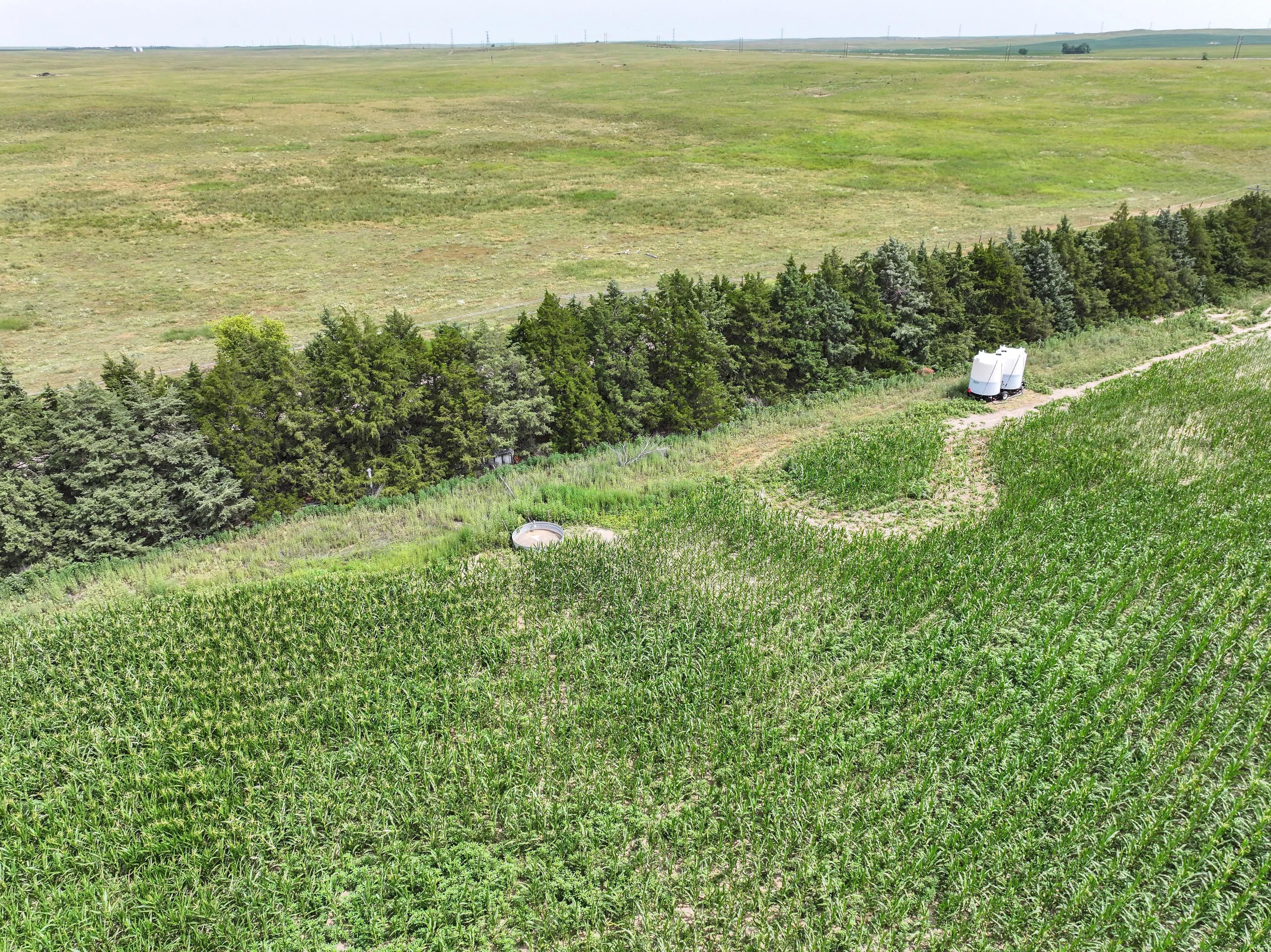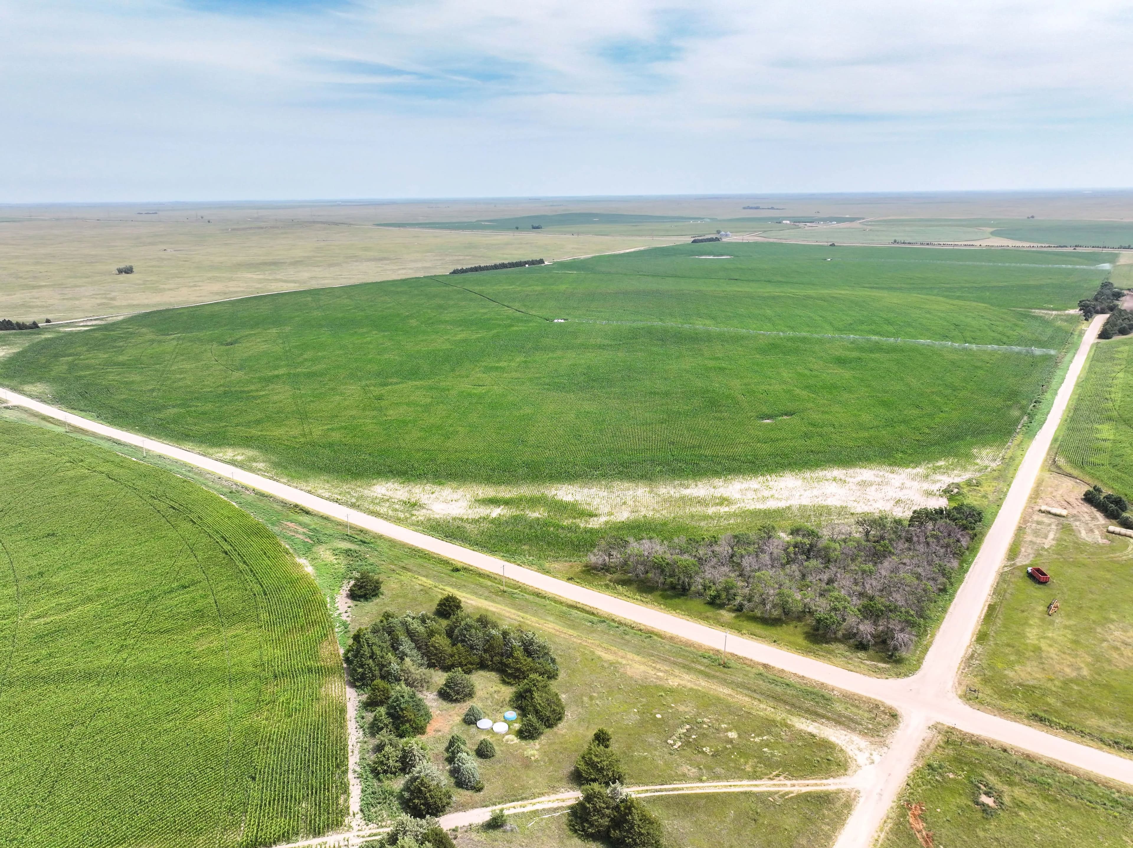 Primarily irrigated cropland with dry cropland corners and a small tract of grass/trees.
