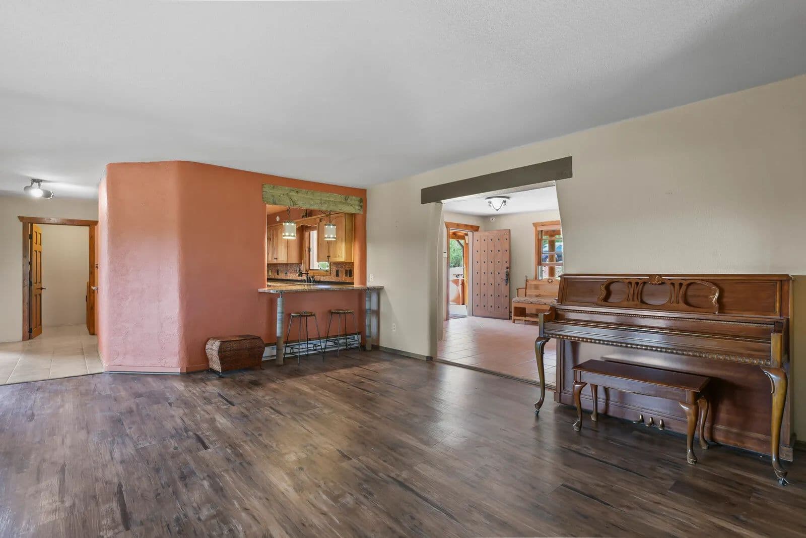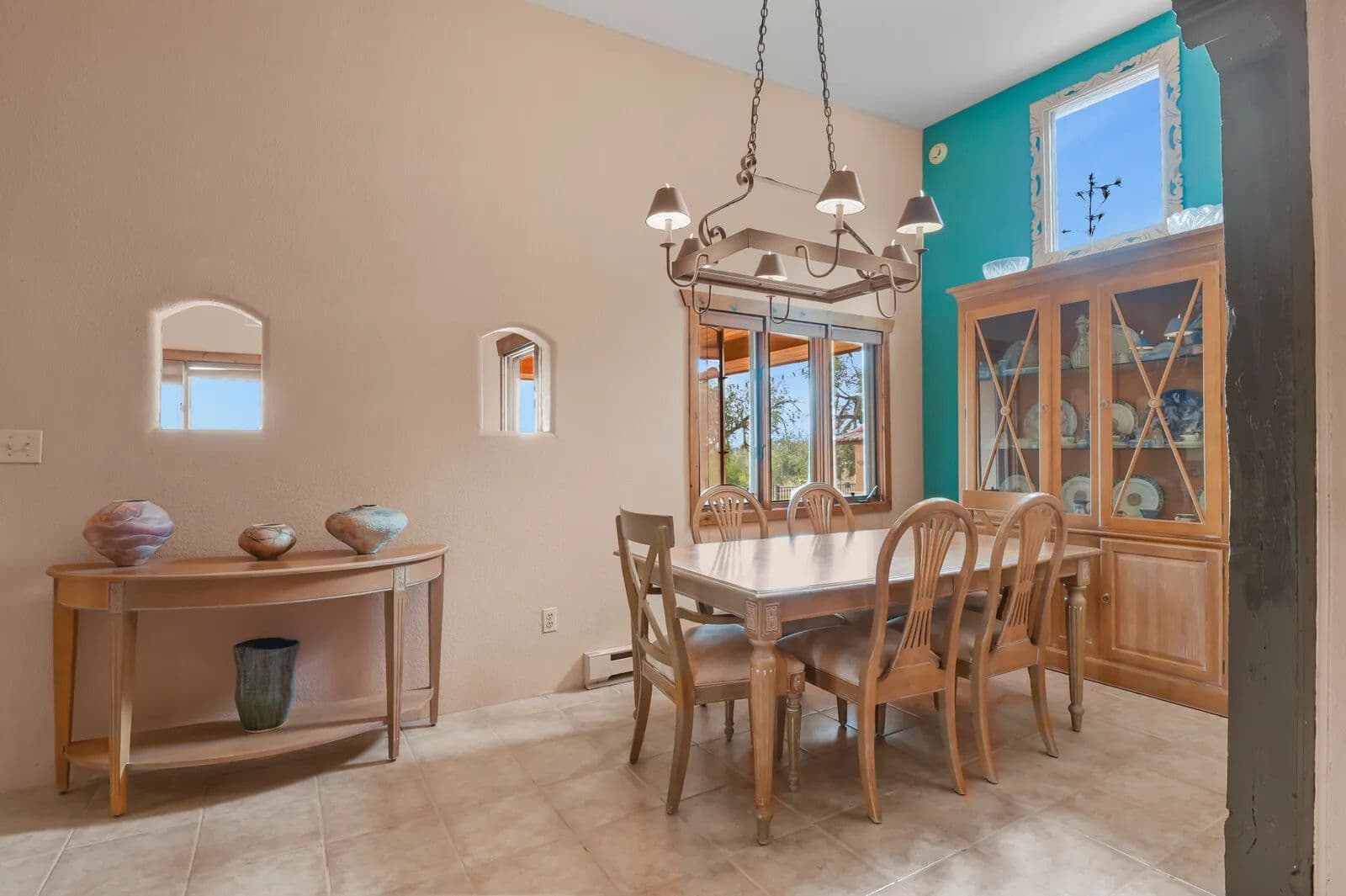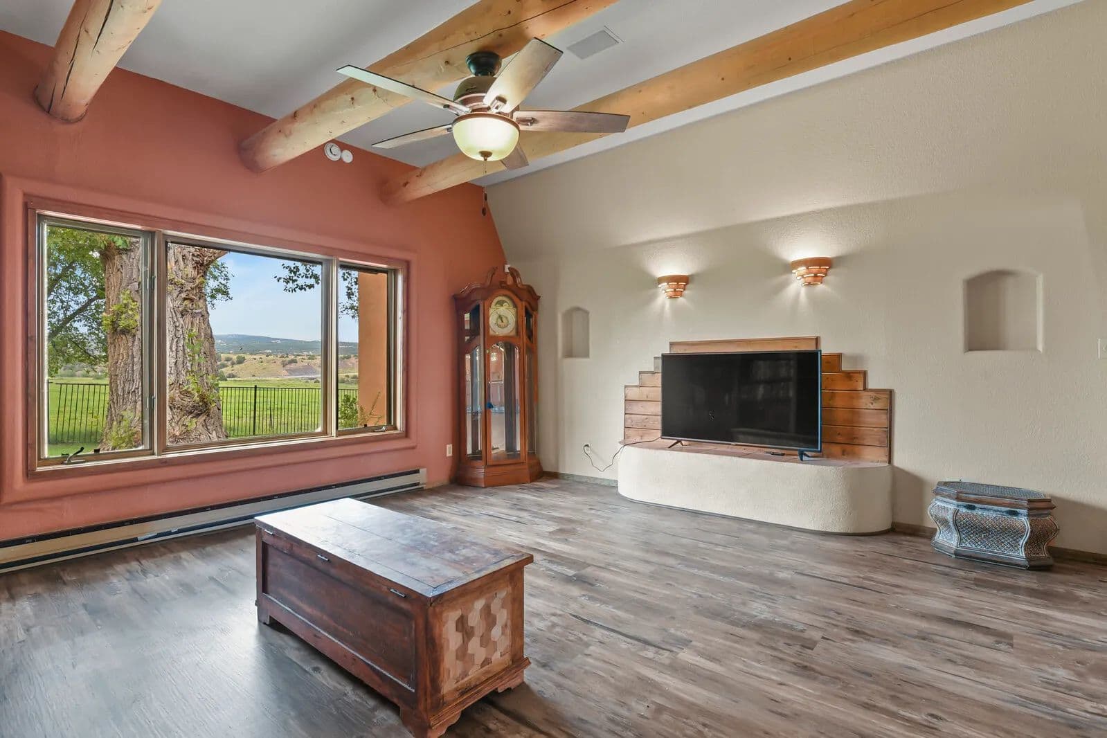 The main residence is a charming 2,915± square-foot Spanish-style adobe home, showcasing classic adobe character with exposed wood beams, luxury vinyl plank flooring, and tile throughout the main level. This level features a large family room, separate living room, dining room, laundry room, and a kitchen with a spacious walk-in pantry. Upstairs, a third bedroom and full bathroom with a private outdoor entry provide excellent flexibility—ideal for guests, a rental unit, multigenerational living, or an office/studio. The home is largely self-sufficient, powered in part by a 72-panel solar array.