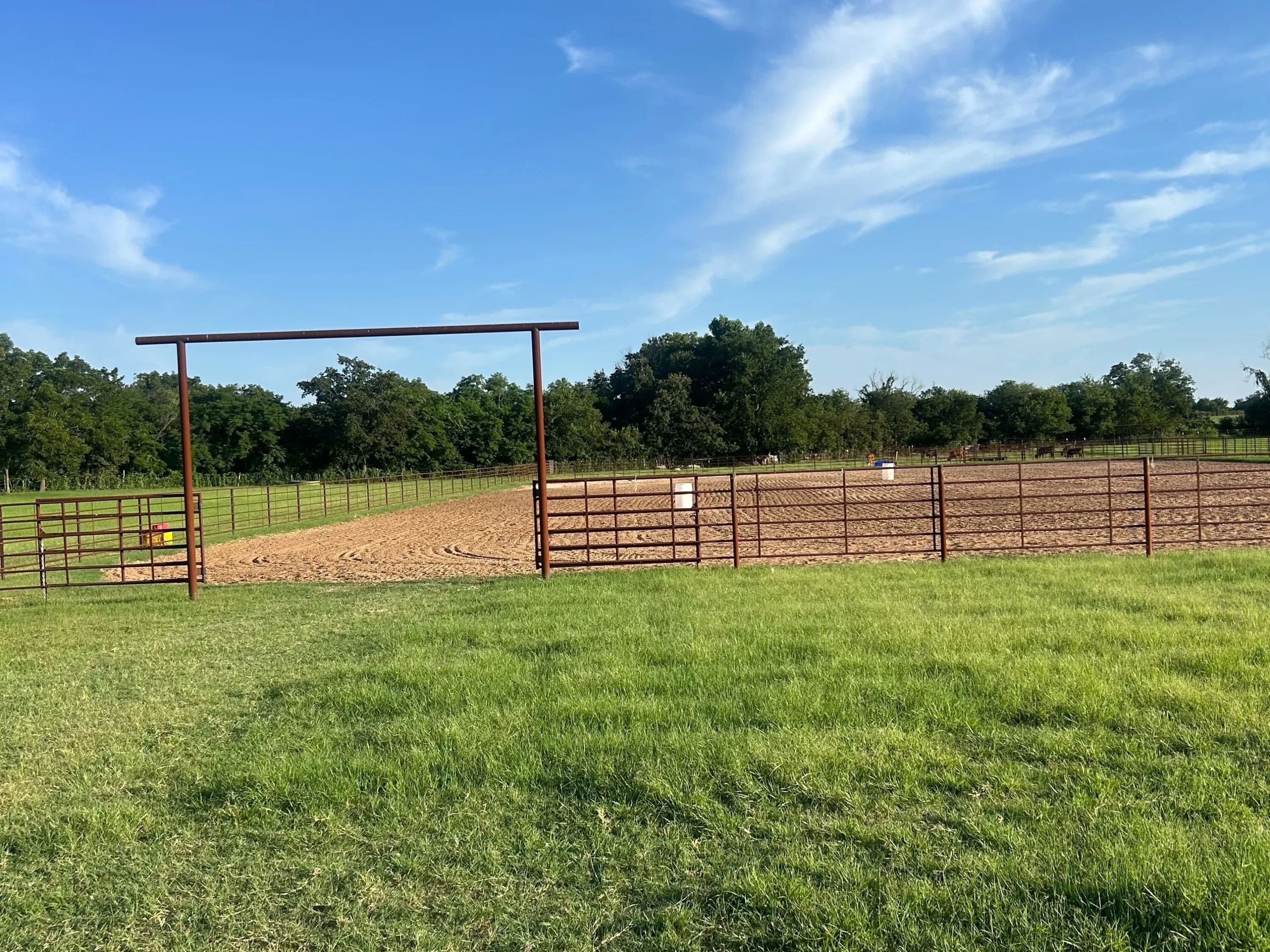Brand-new 155' x 260' pipe Roping/Riding Arena with excellent footing, adjustable boxes, and a Priefert solar chute