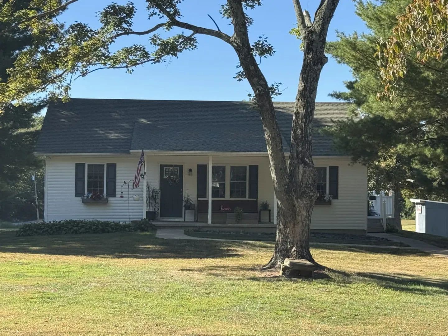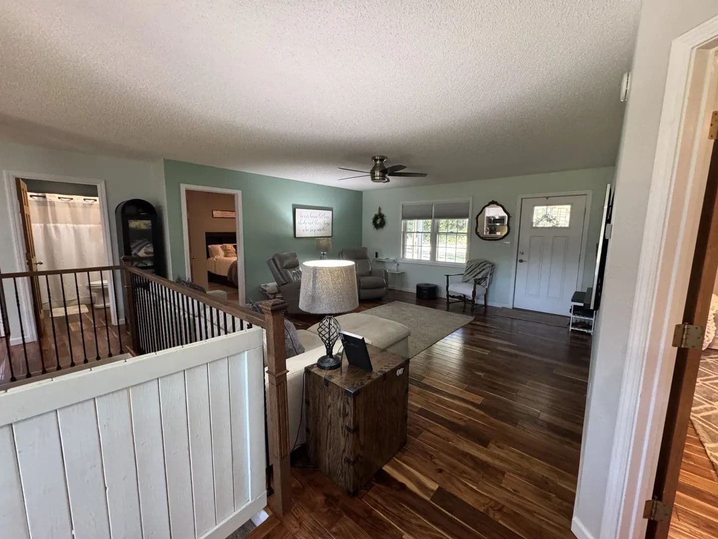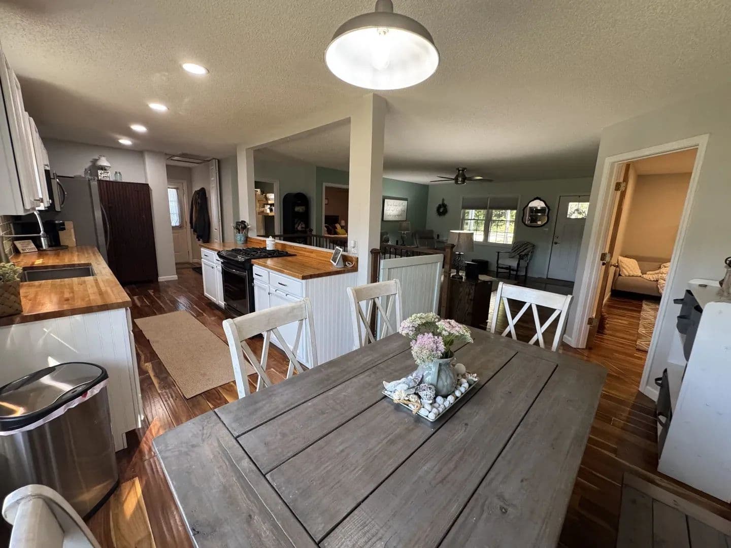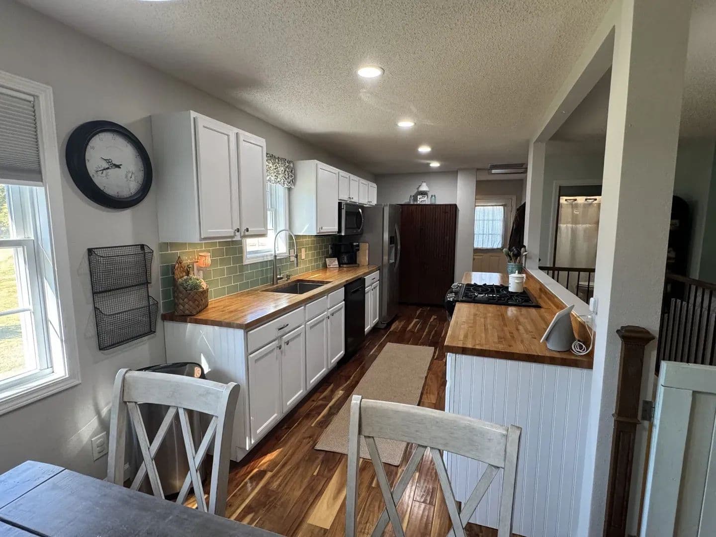 Country Living Close to Town! Enjoy the best of both worlds with this 3-bedroom, 2-bath home on 8.23 + /- acres—just minutes from all the amenities of Mt. Vernon. Step inside and you’ll feel right at home with the open-concept living, dining, and galley kitchen featuring custom cabinetry, a farmhouse sink, and butcher block countertops. Hardwood floors run through most of the home, with cozy carpet in one upstairs bedroom. The home has 2 bedrooms upstairs with a ensuite master