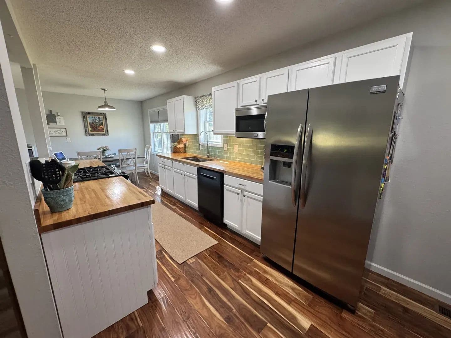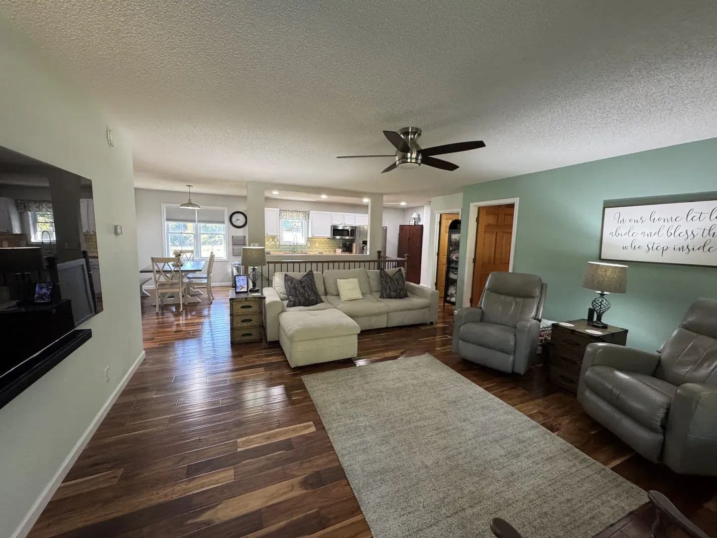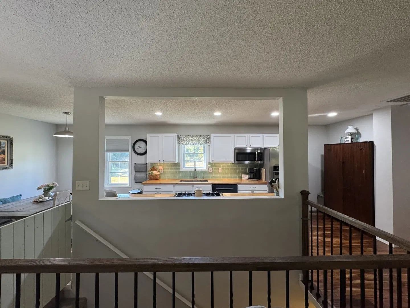 Country Living Close to Town! Enjoy the best of both worlds with this 3-bedroom, 2-bath home on 8.23 + /- acres—just minutes from all the amenities of Mt. Vernon. Step inside and you’ll feel right at home with the open-concept living, dining, and galley kitchen featuring custom cabinetry, a farmhouse sink, and butcher block countertops. Hardwood floors run through most of the home, with cozy carpet in one upstairs bedroom. The home has 2 bedrooms upstairs with a ensuite master