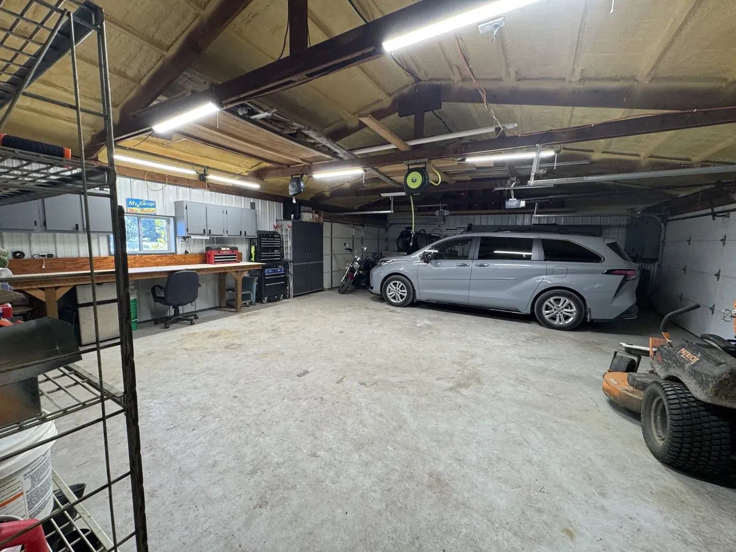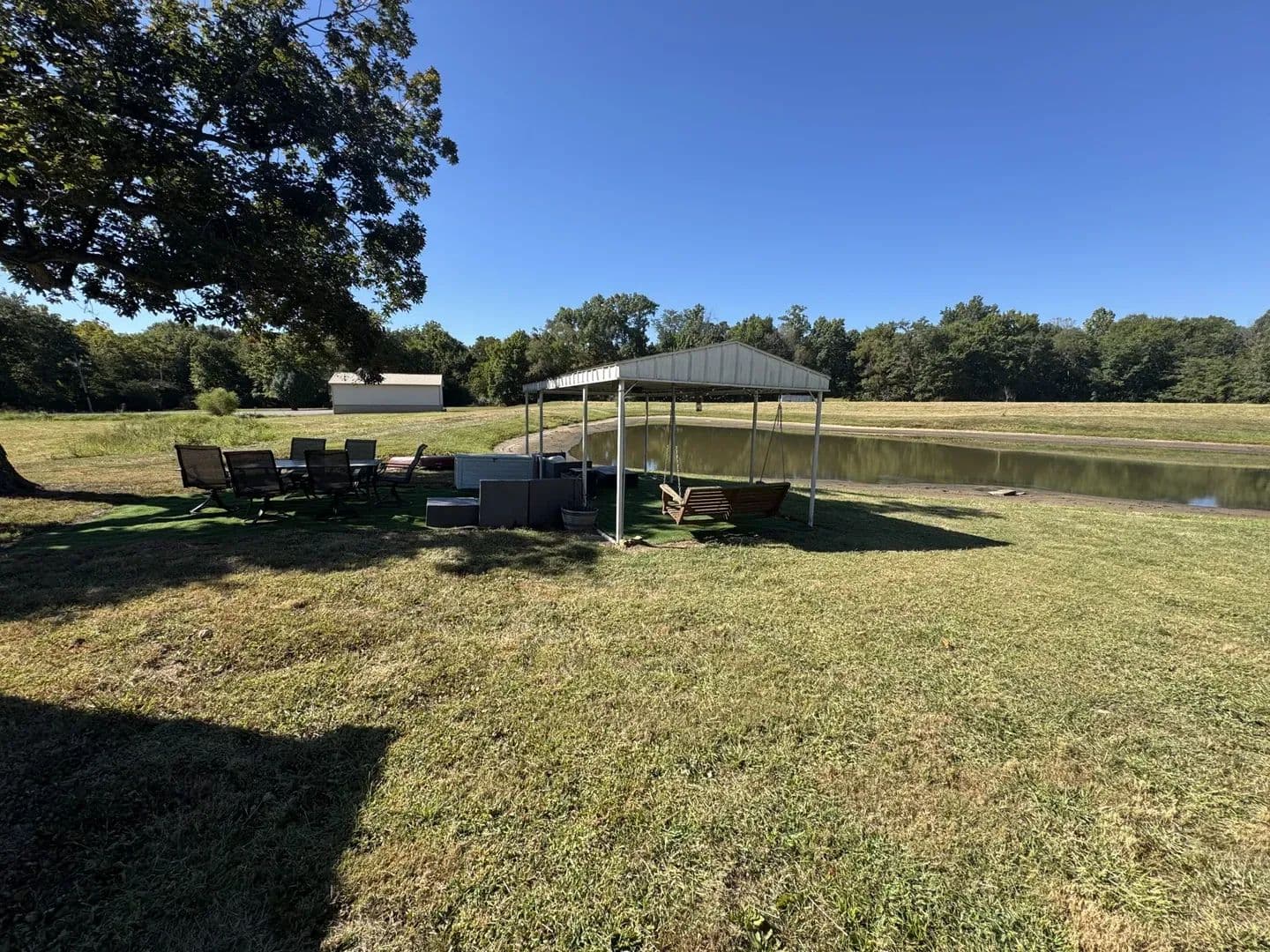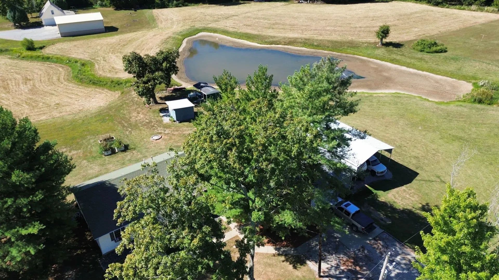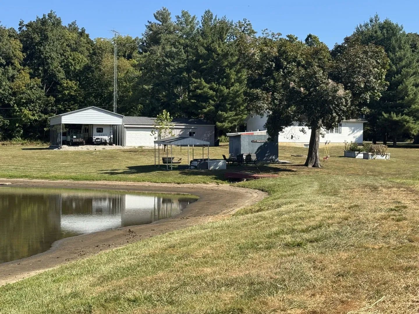 bedroom with a large bathroom & walk in closet. The partially finished basement offers a spacious family room complete with a kitchenette, perfect for entertaining. You’ll also find a bedroom and quiet sitting area—ideal for guests or a private retreat. Outdoors, this property shines! The drive-through heated garage is every hobbyist’s dream, fully spray-foam insulated with metal-finished walls. A large carport provides additional covered parking. By the pond, you’ll enjoy a covered pavilion with a fire pit