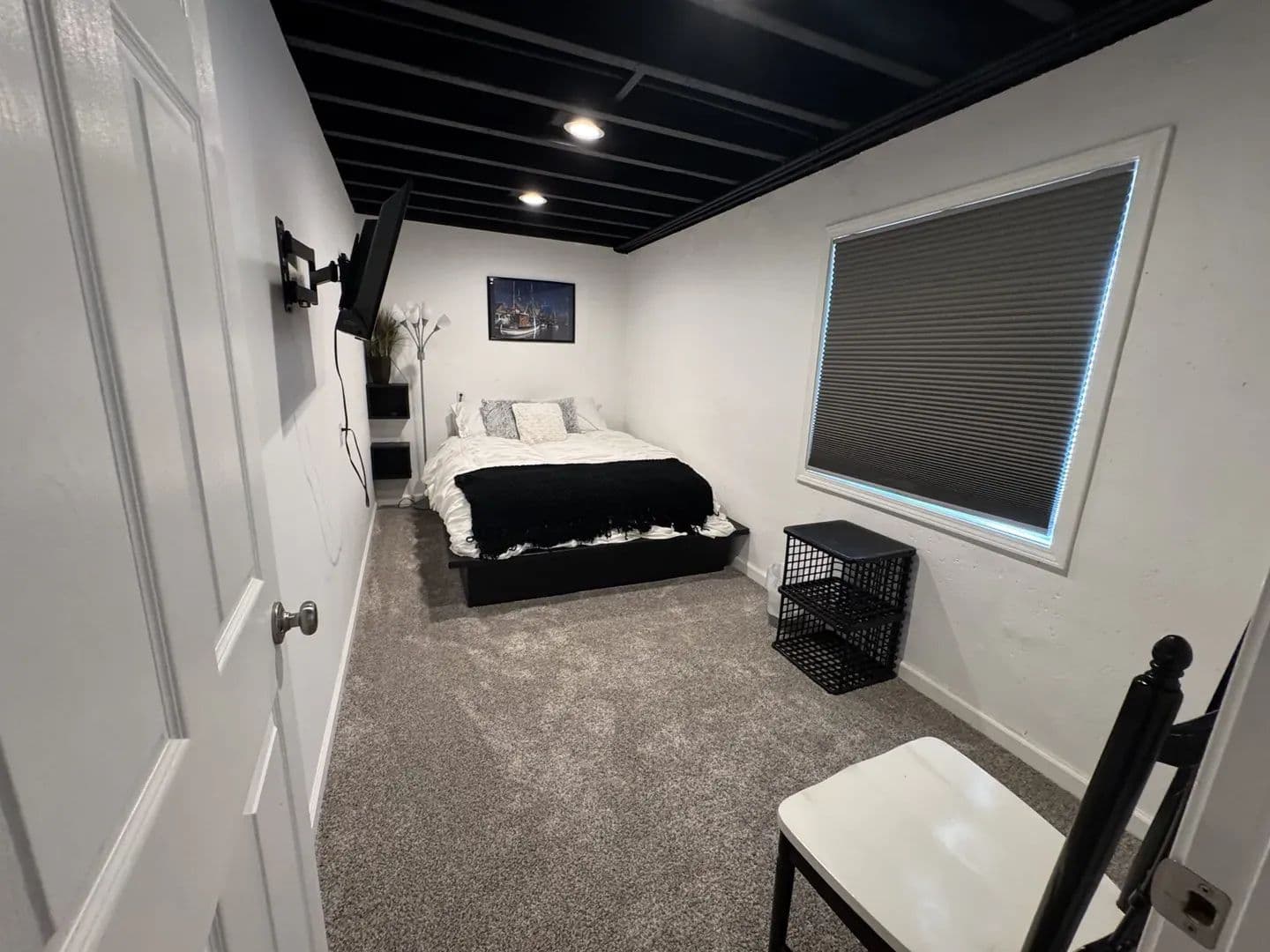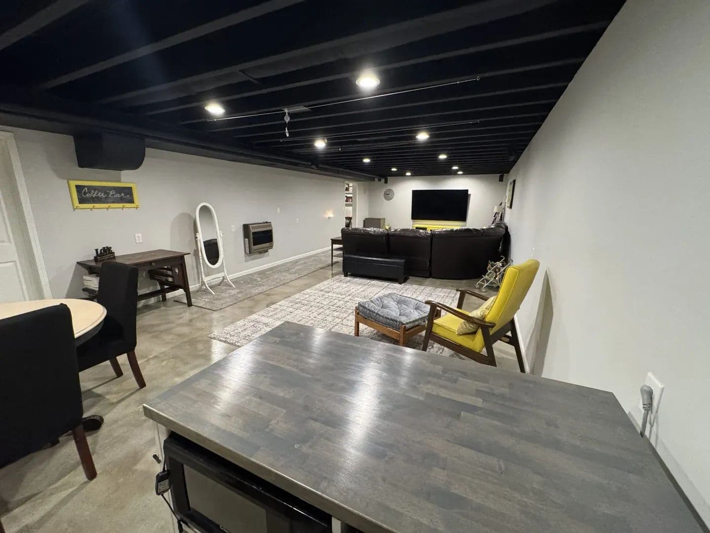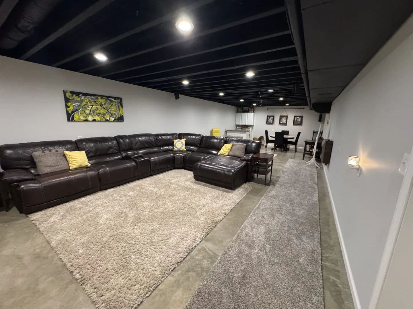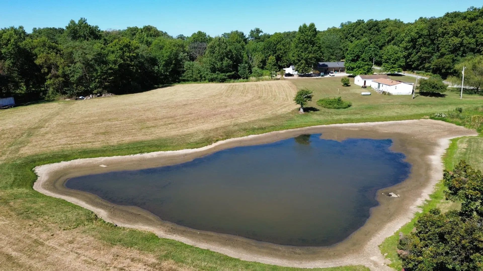 bedroom with a large bathroom & walk in closet. The partially finished basement offers a spacious family room complete with a kitchenette, perfect for entertaining. You’ll also find a bedroom and quiet sitting area—ideal for guests or a private retreat. Outdoors, this property shines! The drive-through heated garage is every hobbyist’s dream, fully spray-foam insulated with metal-finished walls. A large carport provides additional covered parking. By the pond, you’ll enjoy a covered pavilion with a fire pit