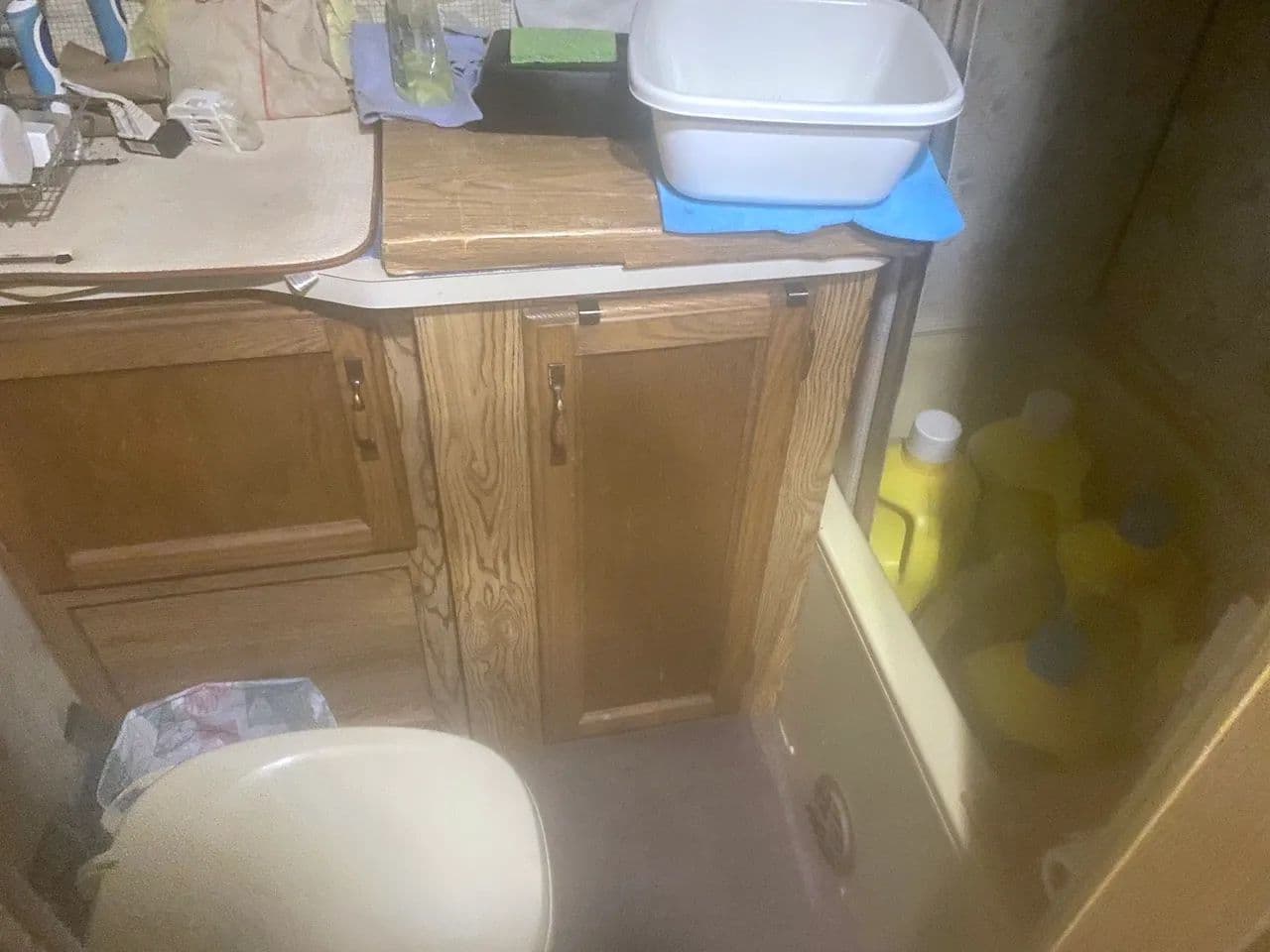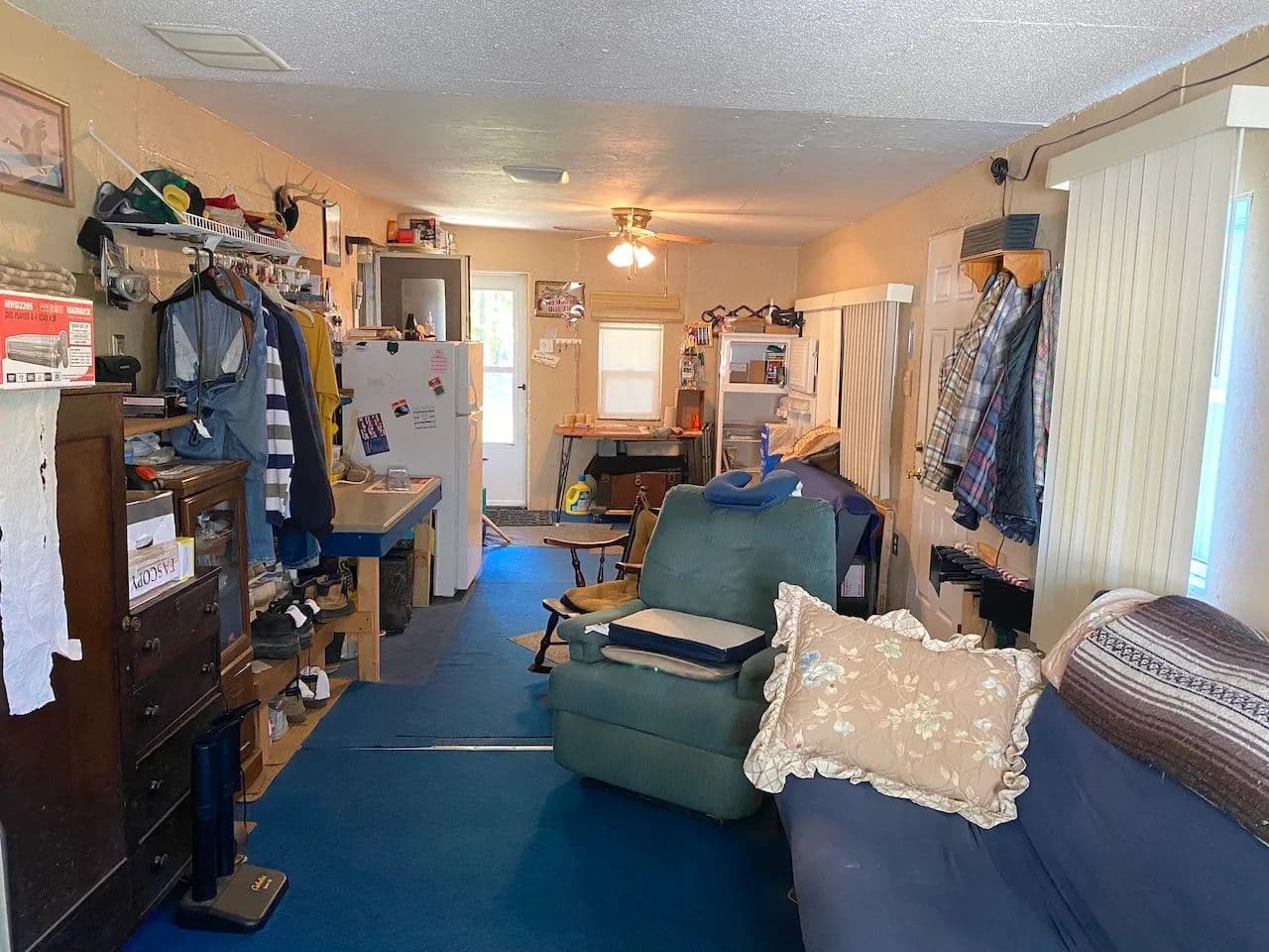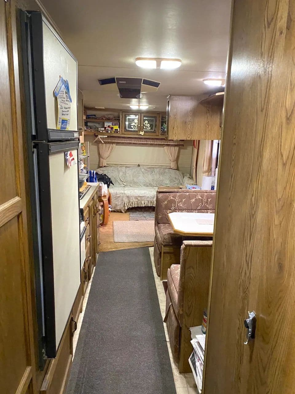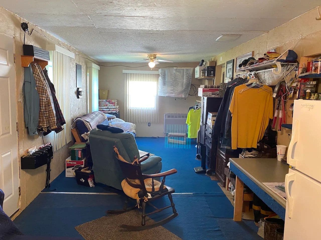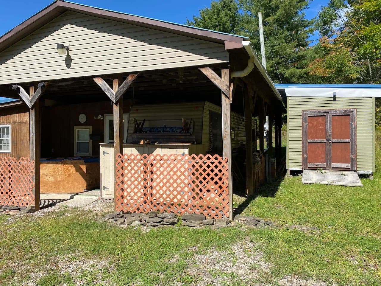 The camp is a comfortable combination of a travel trailer with a large, attached living room addition, plus a practical mudroom and storage area. The travel trailer itself is protected by a sturdy wooden structure with a roof built over it for year-round use. Inside, you’ll find cozy living accommodations with a kitchen, sleeping quarters, and a bathroom making it a convenient base camp. The valley views surrounding the property are stunning, and the fall season brings vibrant leaf colors that enhance the peaceful setting.