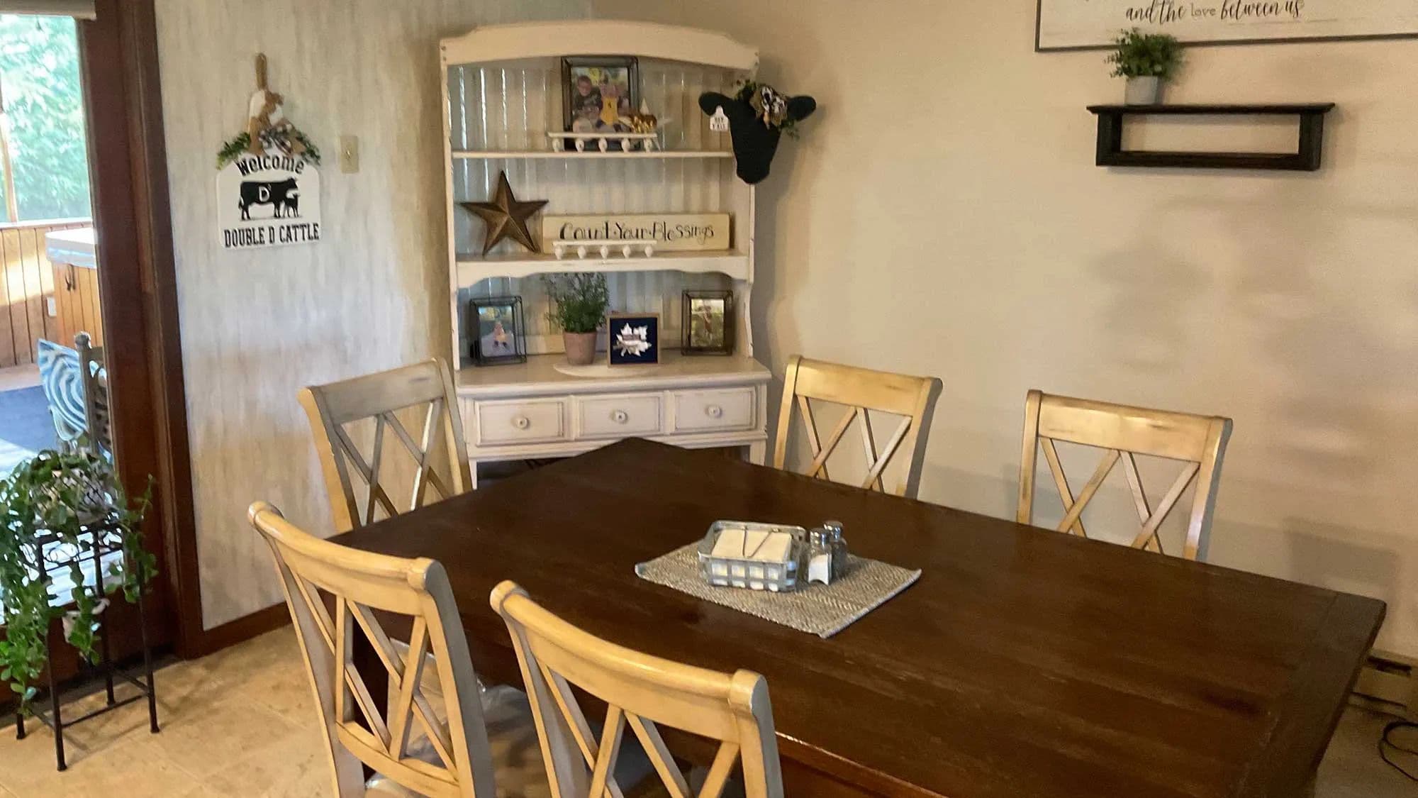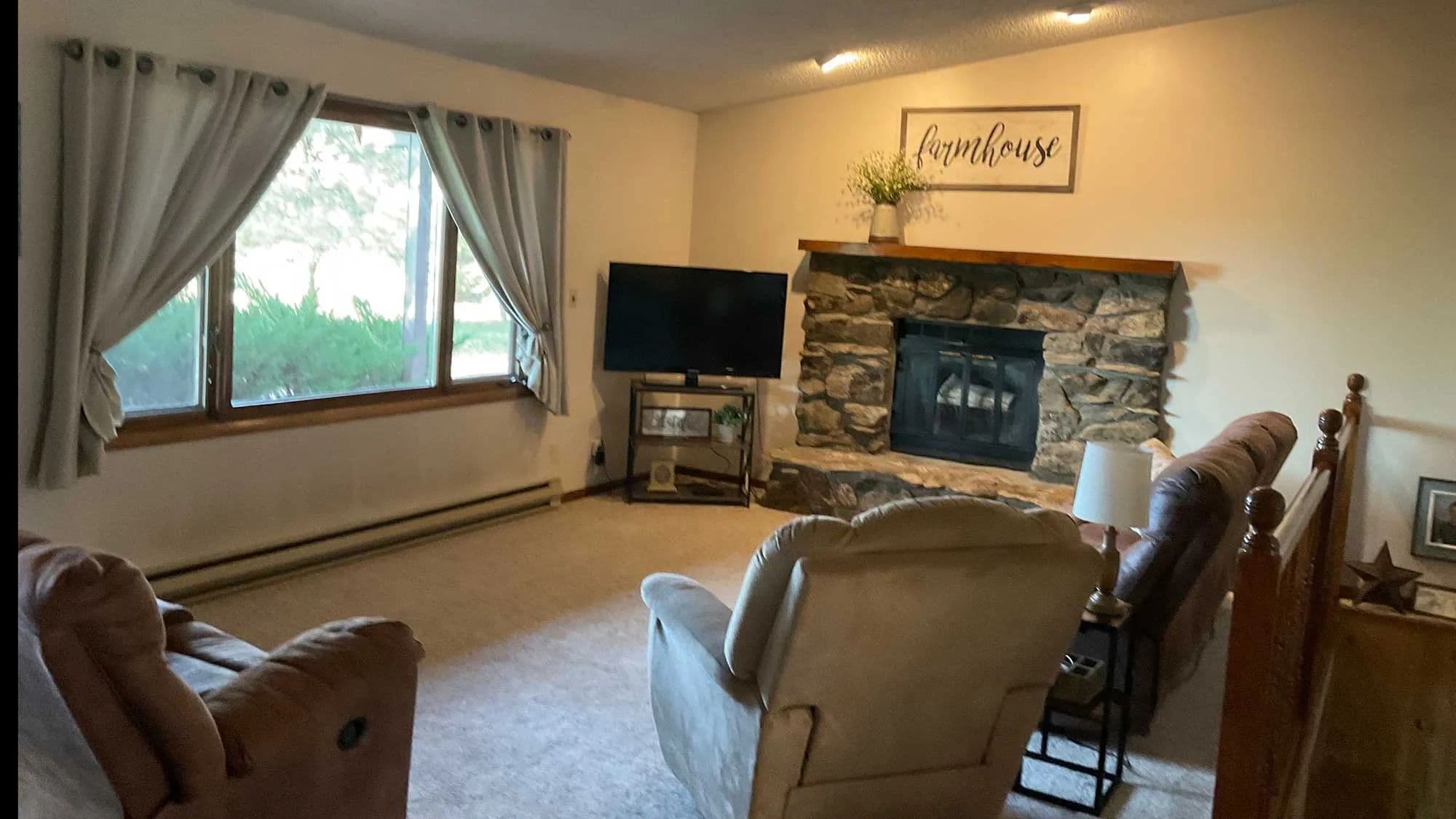 The 2,500 sq. ft. home features 3 bedrooms and 2 recently remodeled bathrooms. One is within the master bedroom. The main level living room includes a rock fireplace, while the basement family room offers a cozy woodstove. An open kitchen filled with natural light flows into the dining area, which opens onto an enclosed back porch complete with a hot tub. Additional amenities include an attached two-car garage, an underground sprinkler system, and over 800 mature trees providing shade and privacy. The property is serviced by a private well and septic system.