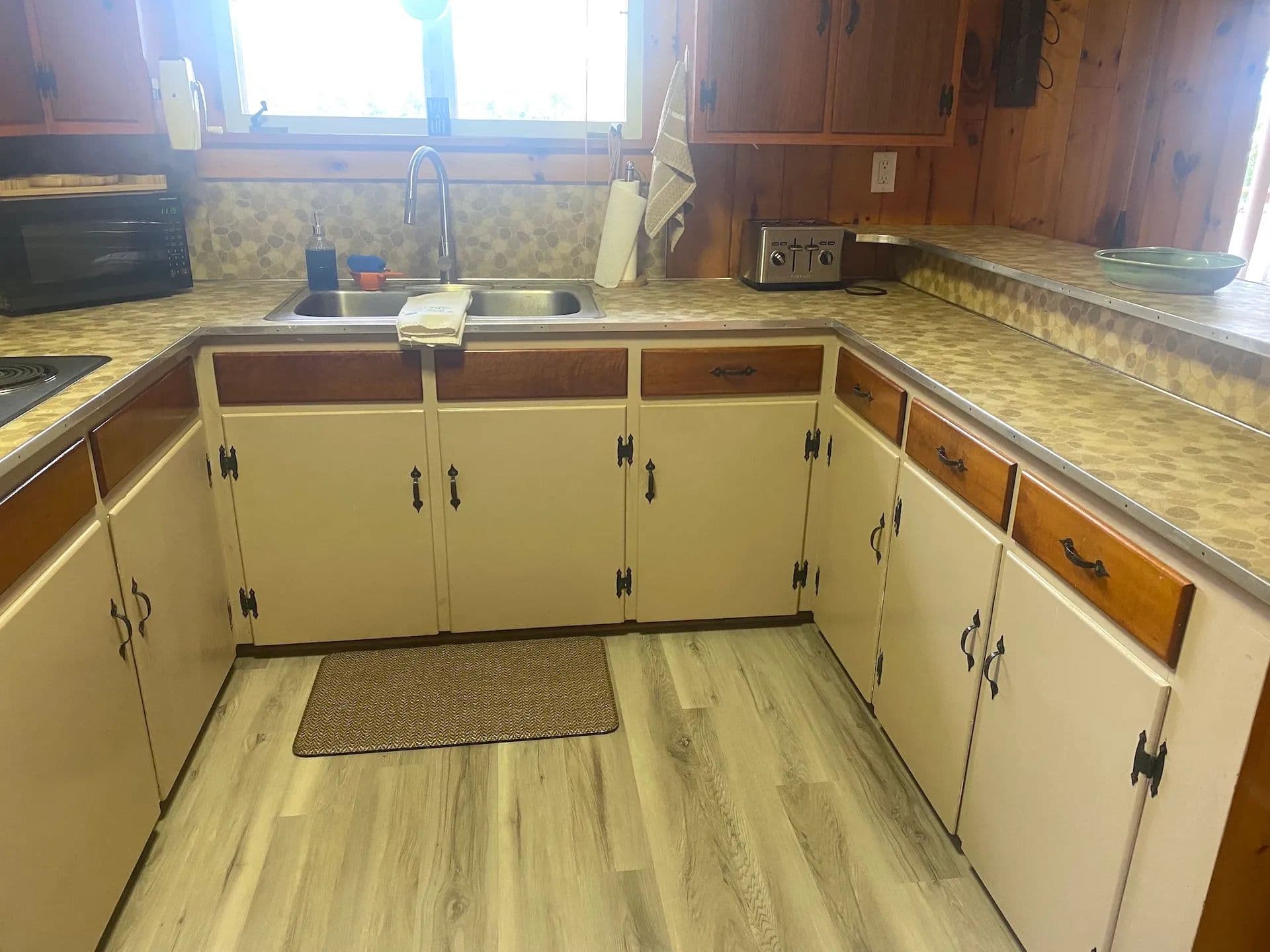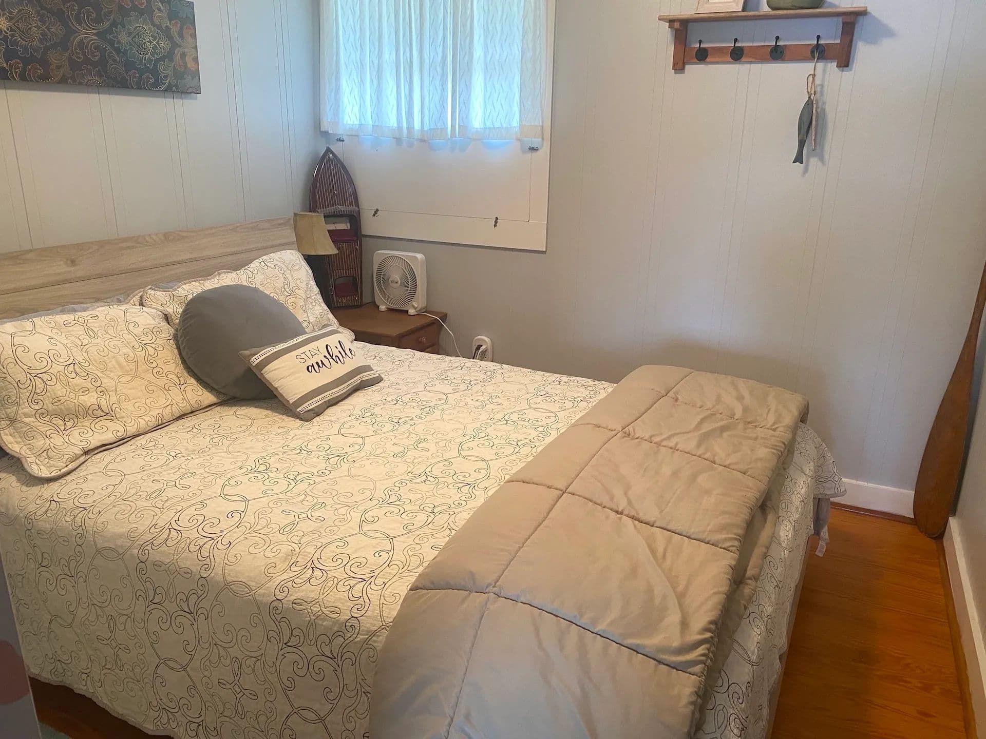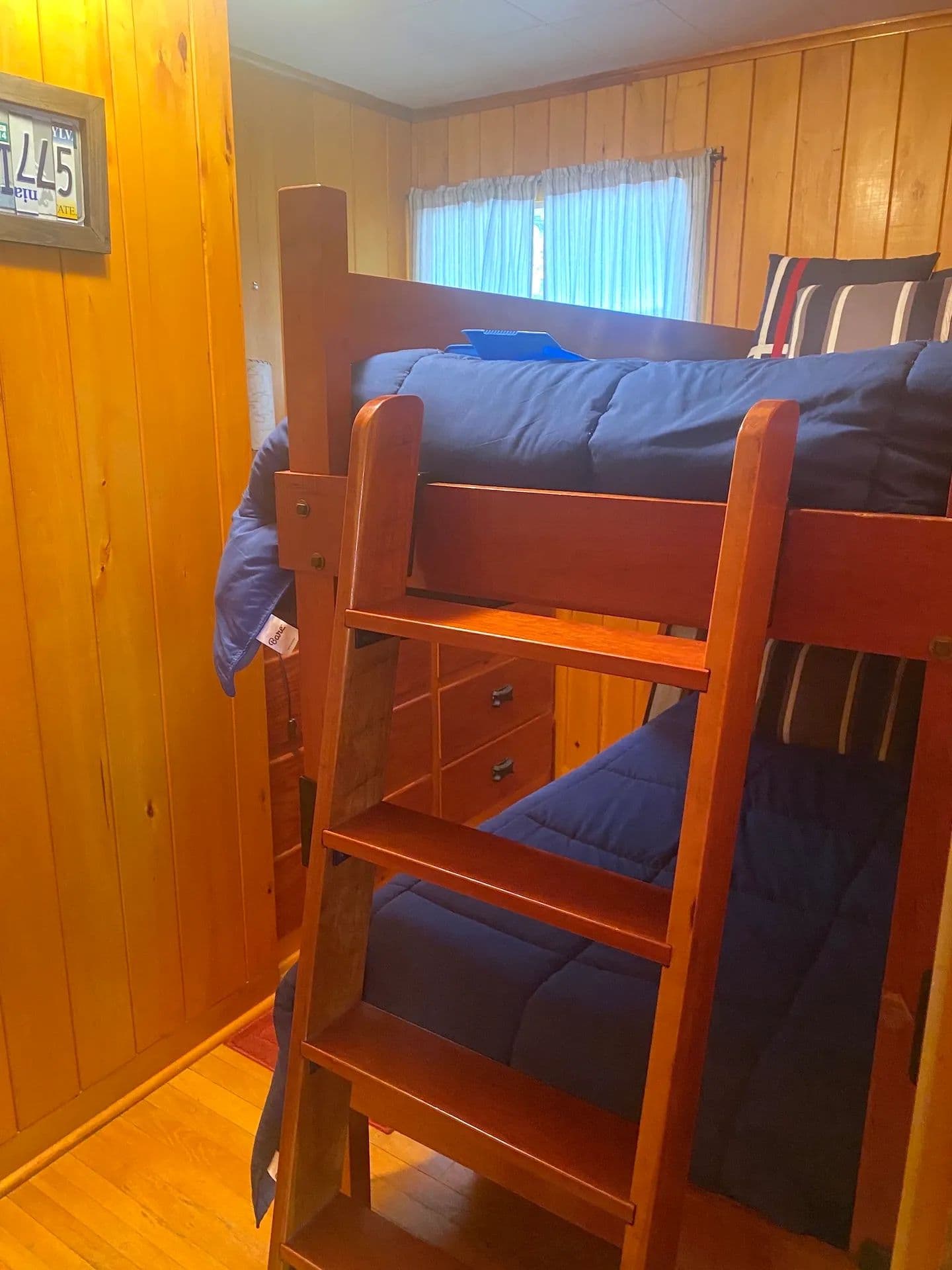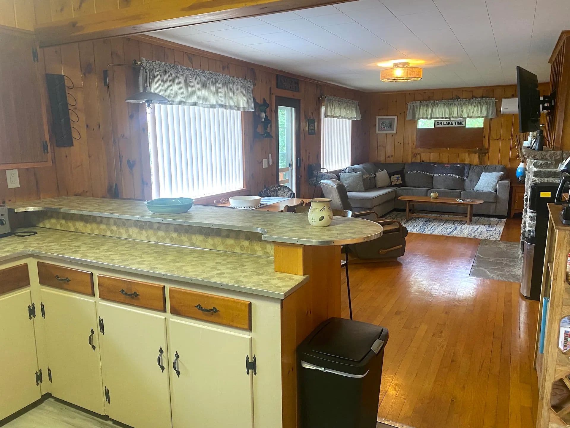 Inside, you’ll find stunning hardwood floors throughout and cozy knotty pine walls giving the cottage a warm and inviting feel. The spacious living area is anchored by a beautiful stone-laid fireplace ideal for keeping the cottage toasty on cooler days, while a new mini-split system provides extra heat and air conditioning year-round. Large windows allow abundant natural light to stream through. The kitchen offers plenty of countertop space, a breakfast bar, and new vinyl laminate floors. Three sizable bedrooms, some with built-in dressers, provide ample space for family and guests. The home also includes one full bathroom. The home has been freshly painted throughout making it truly move-in ready.