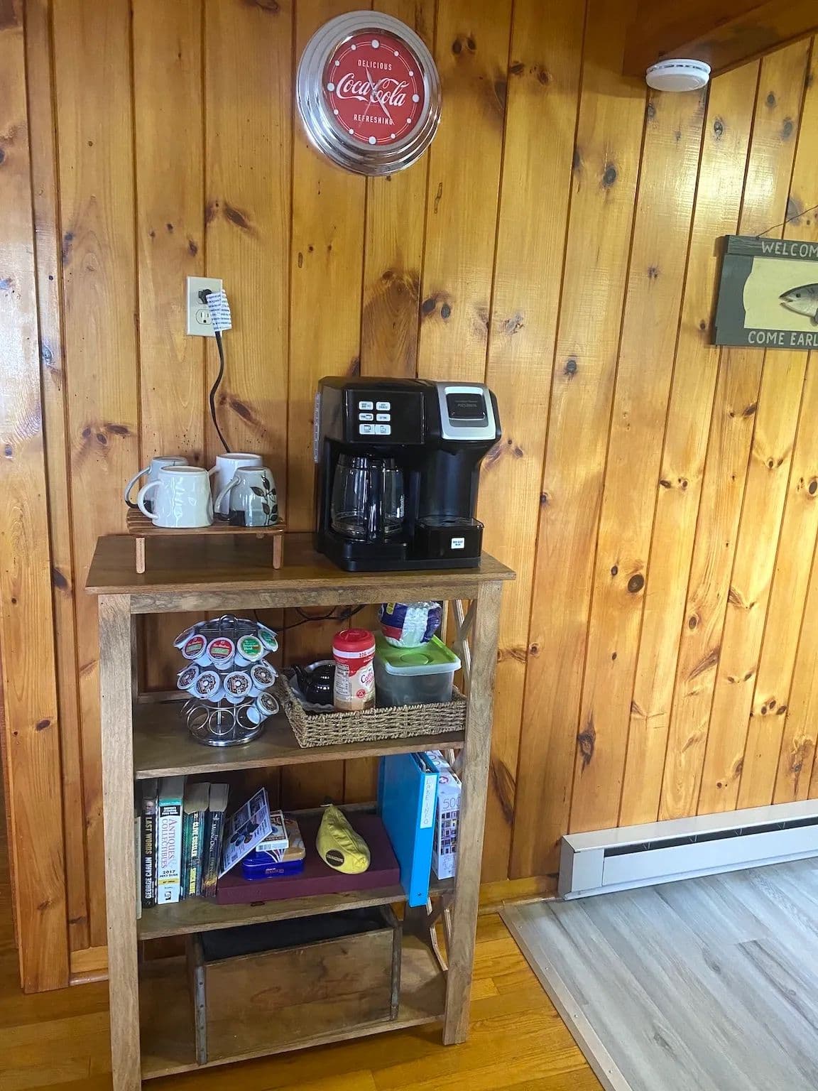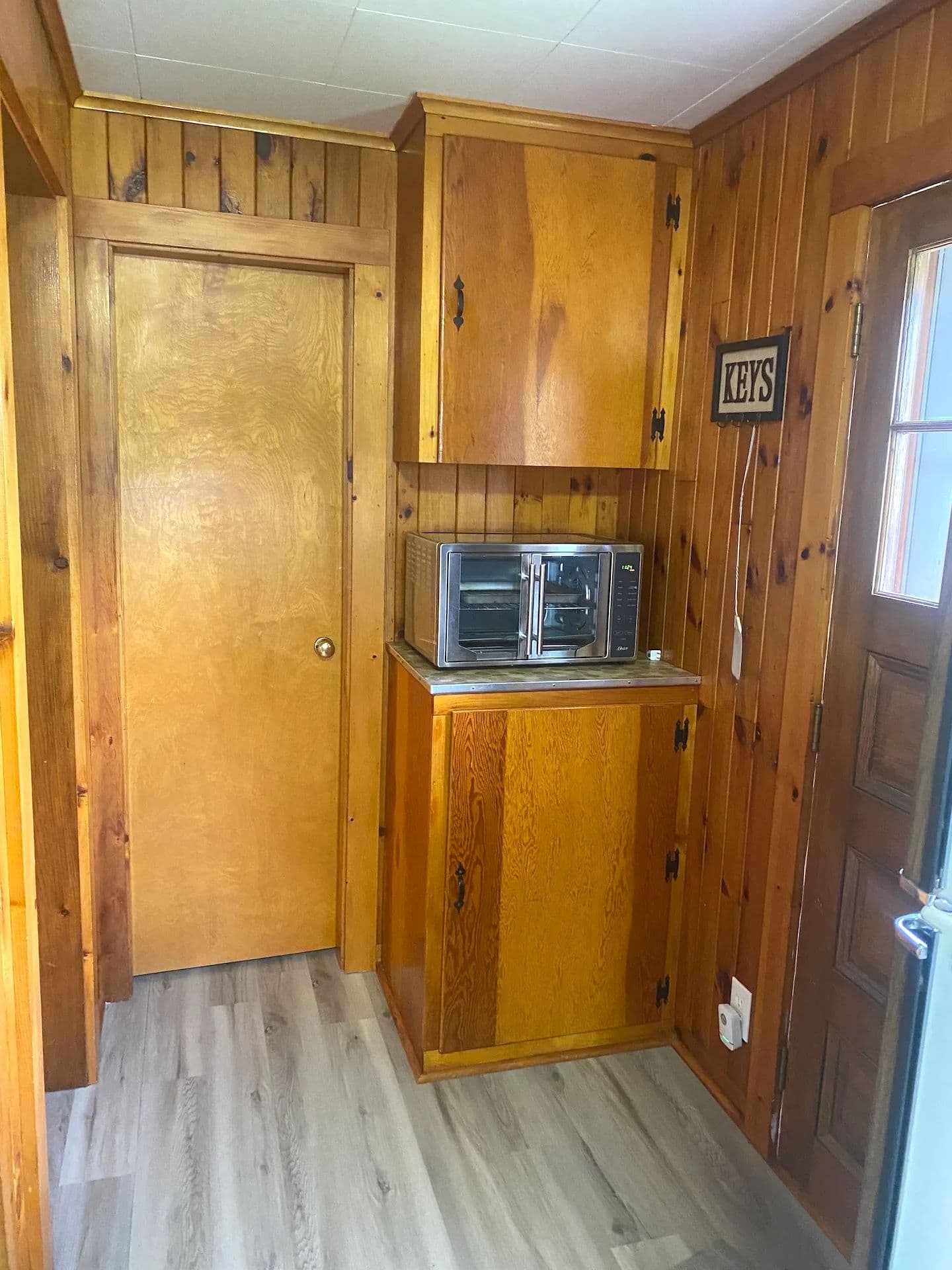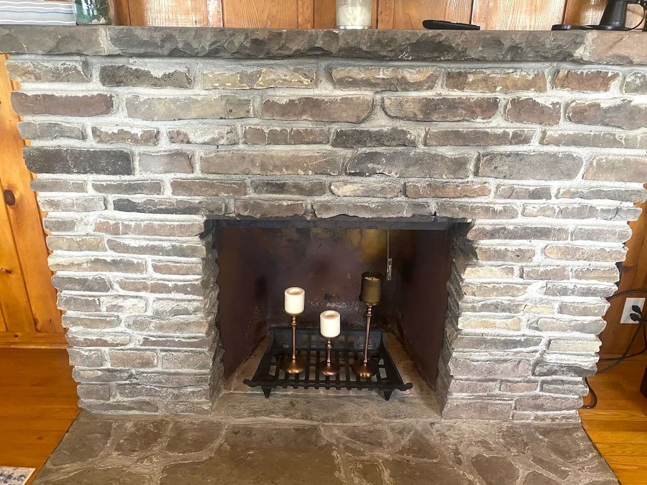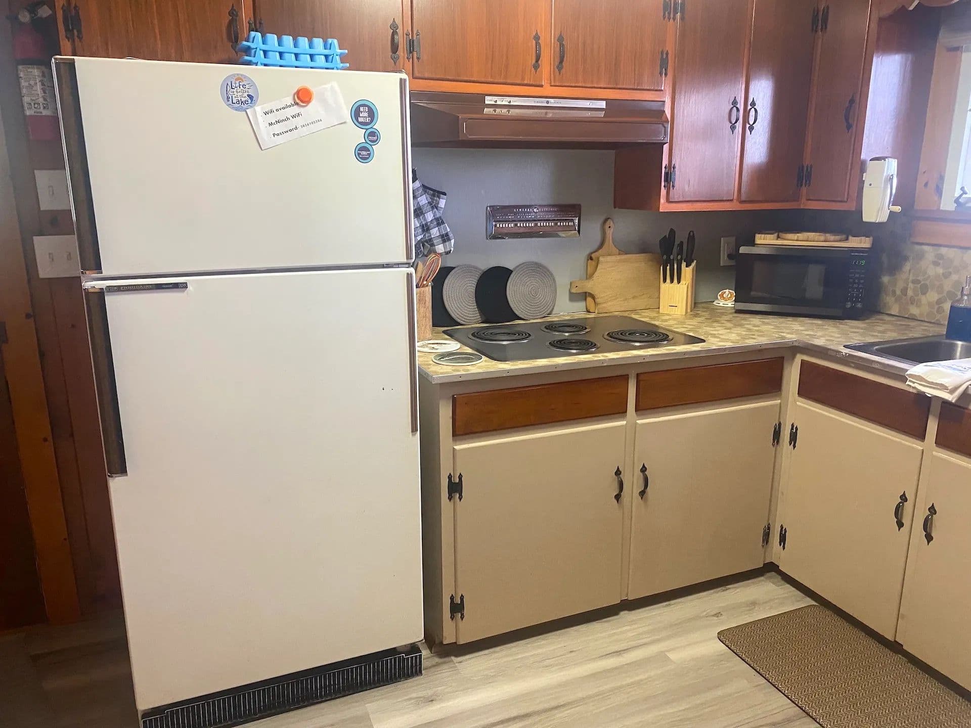 Inside, you’ll find stunning hardwood floors throughout and cozy knotty pine walls giving the cottage a warm and inviting feel. The spacious living area is anchored by a beautiful stone-laid fireplace ideal for keeping the cottage toasty on cooler days, while a new mini-split system provides extra heat and air conditioning year-round. Large windows allow abundant natural light to stream through. The kitchen offers plenty of countertop space, a breakfast bar, and new vinyl laminate floors. Three sizable bedrooms, some with built-in dressers, provide ample space for family and guests. The home also includes one full bathroom. The home has been freshly painted throughout making it truly move-in ready.