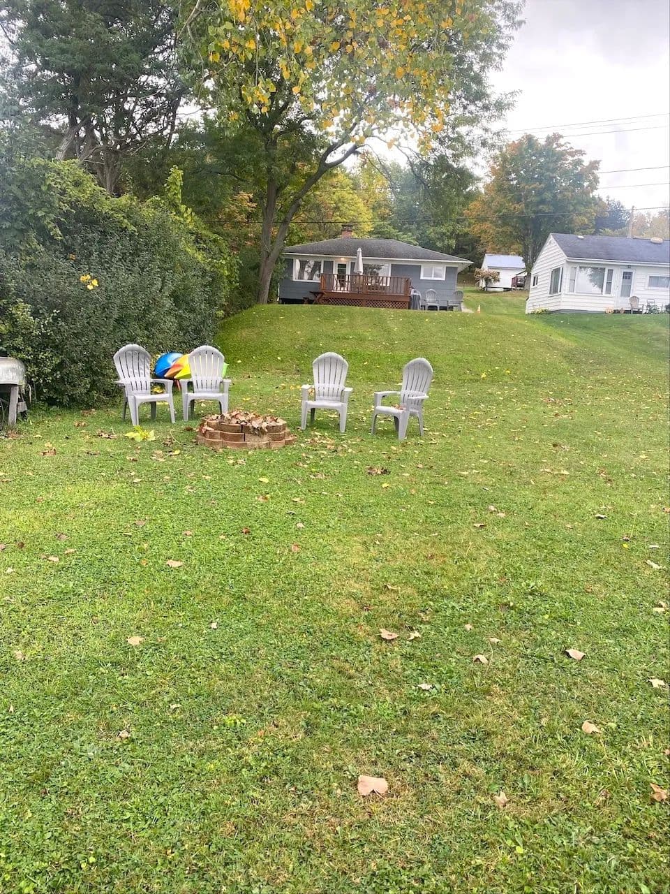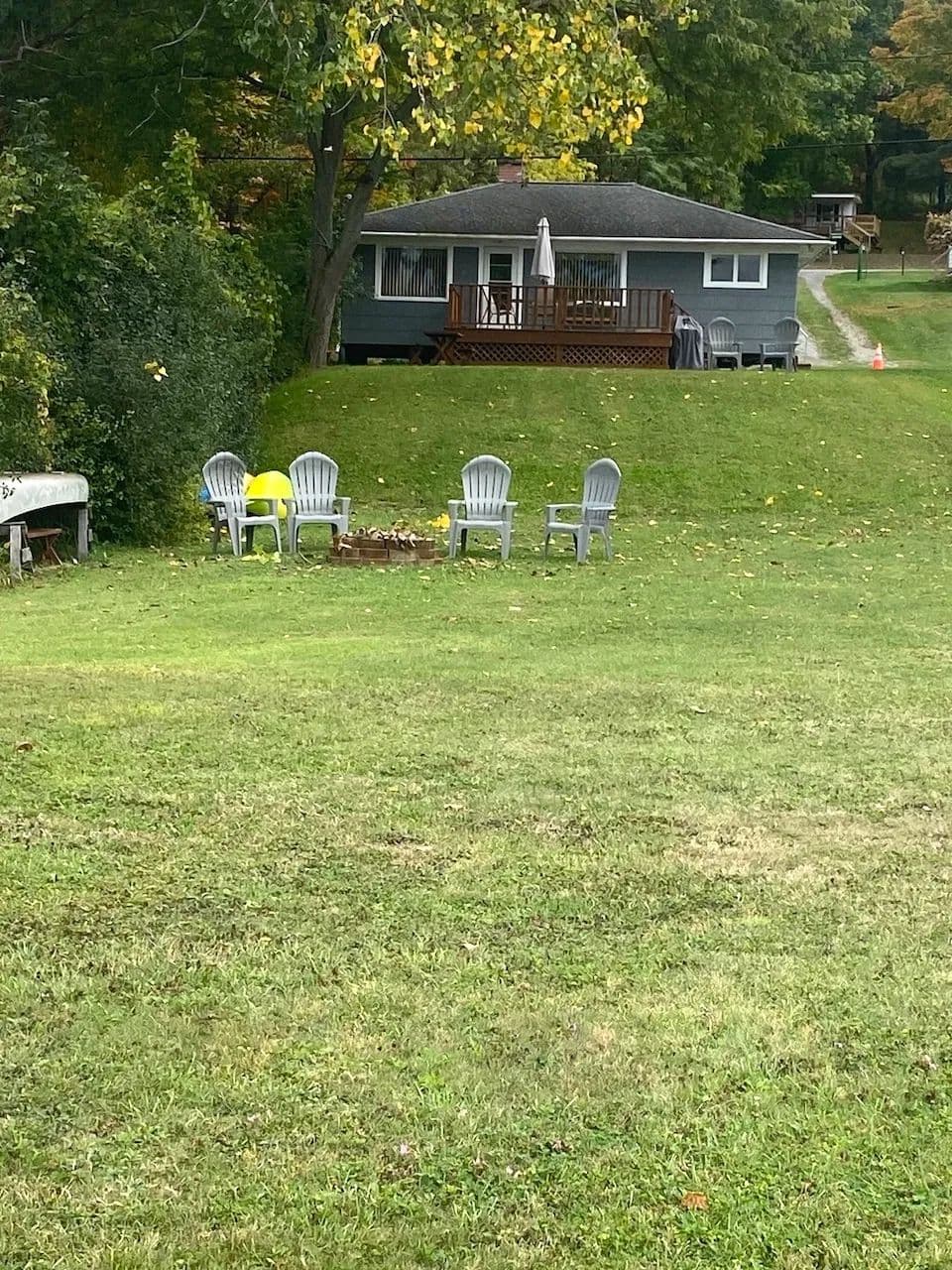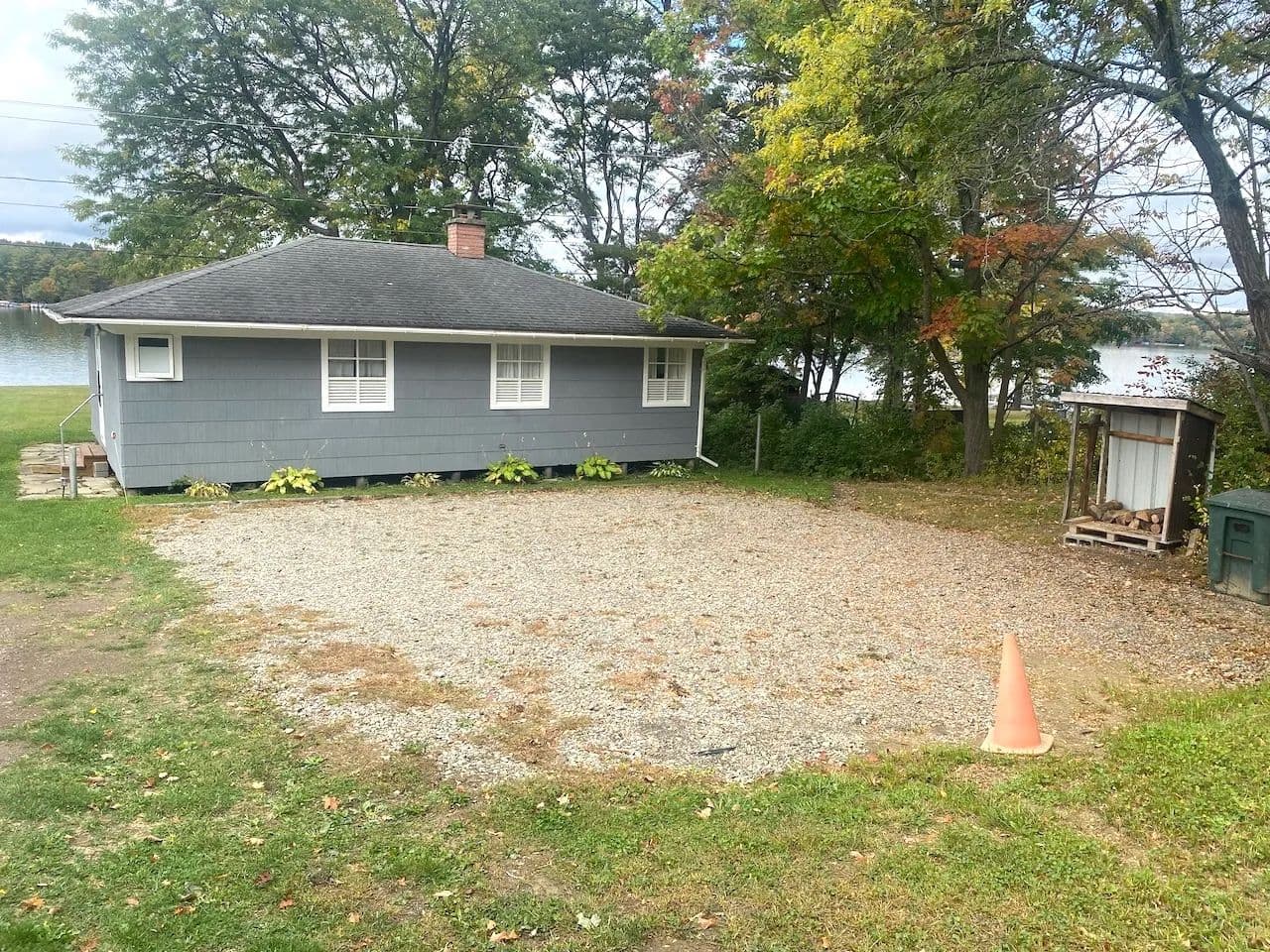 A gravel driveway welcomes you with plenty of space for parking for family and friends, along with a designated gravel pad next to the cottage and room for a future garage or an additional cottage. Enjoy the spacious backyard. An inviting deck greets you at the entrance of the home providing a warm welcome and a space to enjoy views of the surrounding hills and sparkling water.