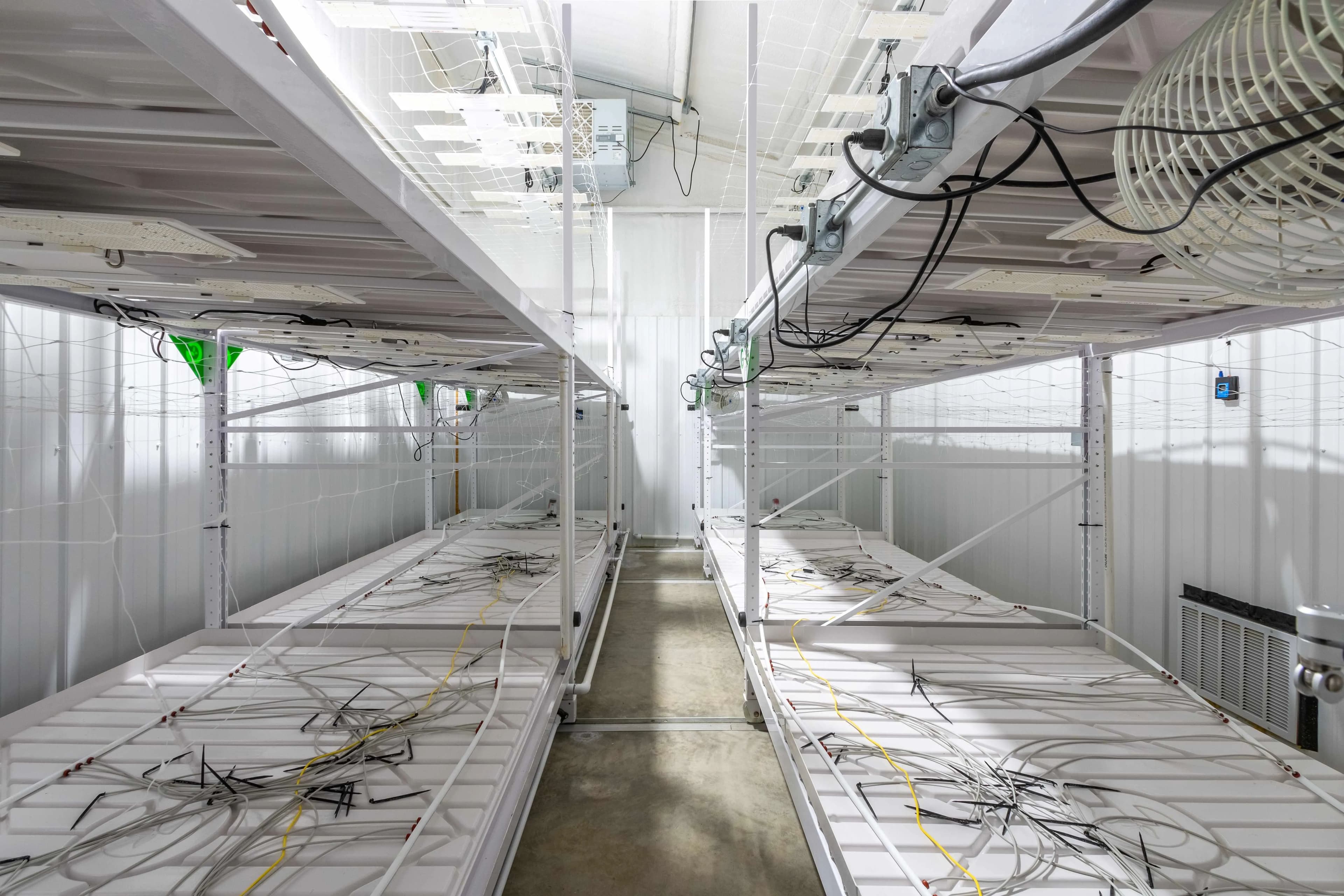 The irrigation room features a 2,500 GPD reverse osmosis system, a 2,500-gallon storage tank, a Hanna Instruments HI 10000 Fertigator, and multiple nutrient tanks, ensuring the production of pure water and precise feeding. A specialized dry room maintains harvest security with precise temperature and humidity control.