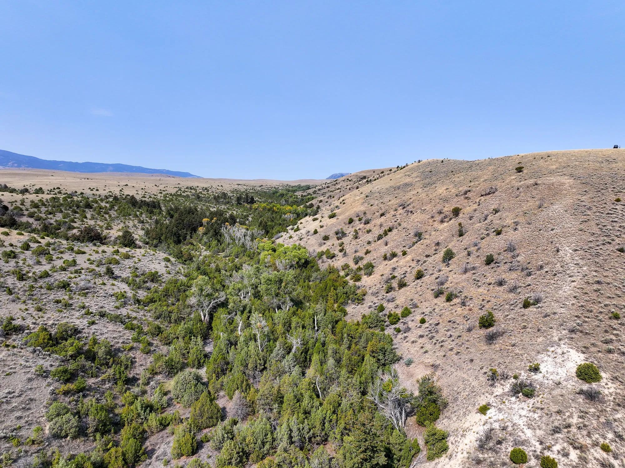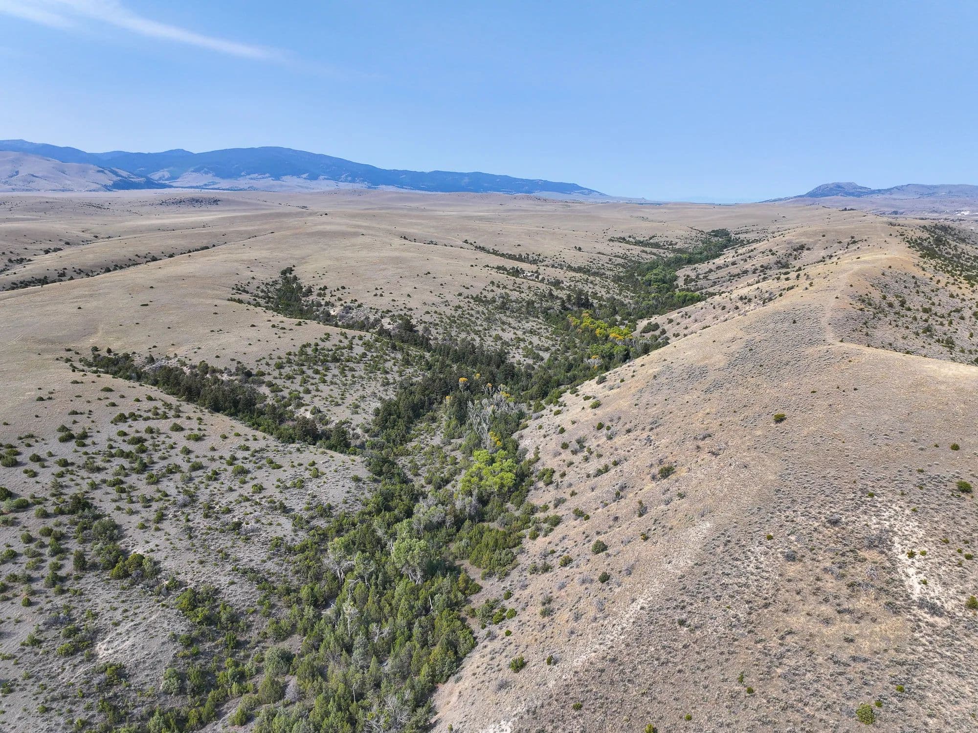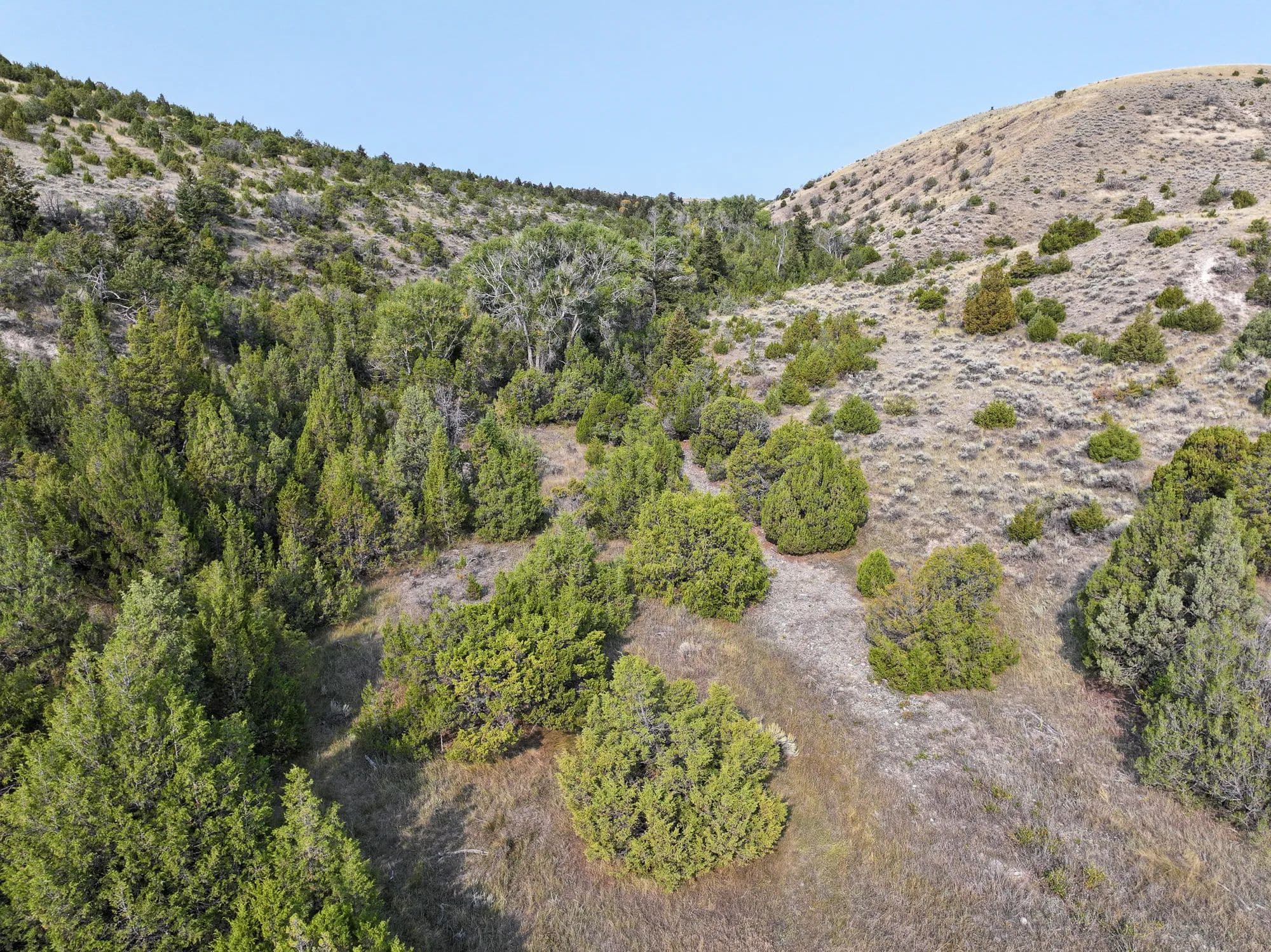 The terrain consists of well-defined native grasslands dotted with junipers and sagebrush across gently rolling to moderately steep topography. Several ridgelines cut through the property, creating deep drainages filled with conifers, cottonwoods, and deciduous trees that provide natural shade and shelter. This diverse landscape has historically supported cattle grazing under lease agreements and serves as prime habitat for local wildlife, particularly antelope.