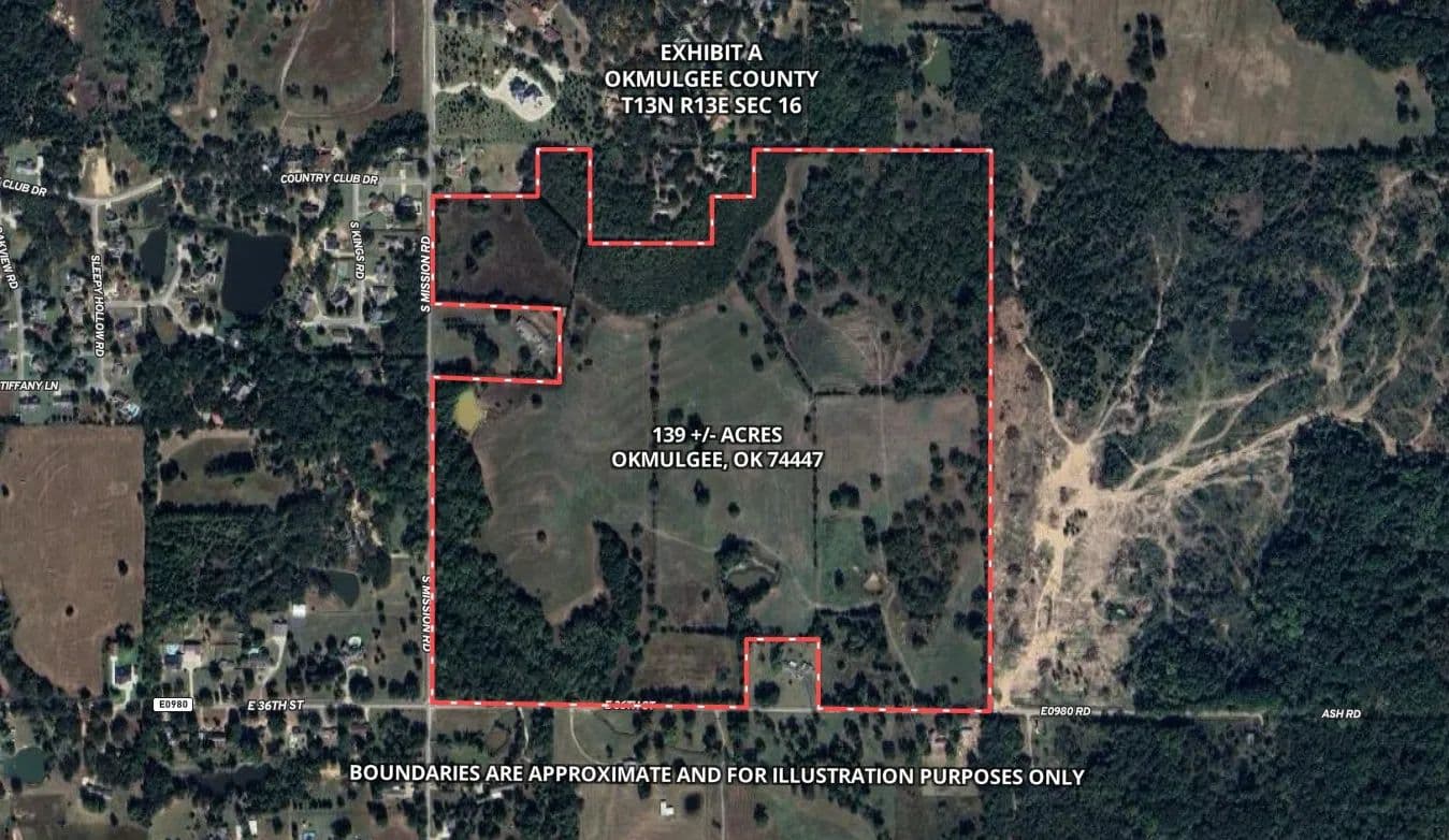 139 +/- ACRES WITH MULTIPLE PONDS AND DEVELOPMENT POTENTIAL IN OKMULGEE CITY LIMITS! This 139 +/- acre property offers a rare combination of size, location, utilities, and history. Owned by the same family since 1968, the land is fully fenced, carries its original abstract, and provides opportunities that range from agricultural use and income production to residential or commercial development. The land itself is a blend of open, flat pastures and clusters of mature trees, creating a setting that works equally well for baling hay, livestock, recreation, or long-term investment. Multiple ponds are scattered throughout, including one within a large pecan grove in the northeast corner. With proper care, the established pecan trees could be pruned back into production, and the property once boasted the third largest pecan tree in Oklahoma. Infrastructure and utilities are already in place to support a wide range of uses. City water, sewer, and electric are available, with high-pressure sewer lines on the west and south sides, a lift station at the southeast corner, and high-pressure gas running through the property. The location is unmatched for convenience, sitting just 1.5 miles from Hwy 75, 2 miles from Walmart and the Indian Hospital, and 2.5 miles from OSU-IT. The property directly adjoins the country club on its northern side, and future development could easily be tied in. Currently, the land produces income through both hay and hunting leases, generating approximately $1,400 annually, with 40% of the hay yield being Prairie Hay. Whether you’re an investor, developer, farmer, or family looking for a legacy property, this acreage delivers rare potential inside city limits.