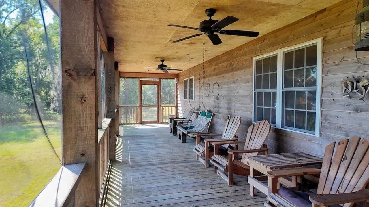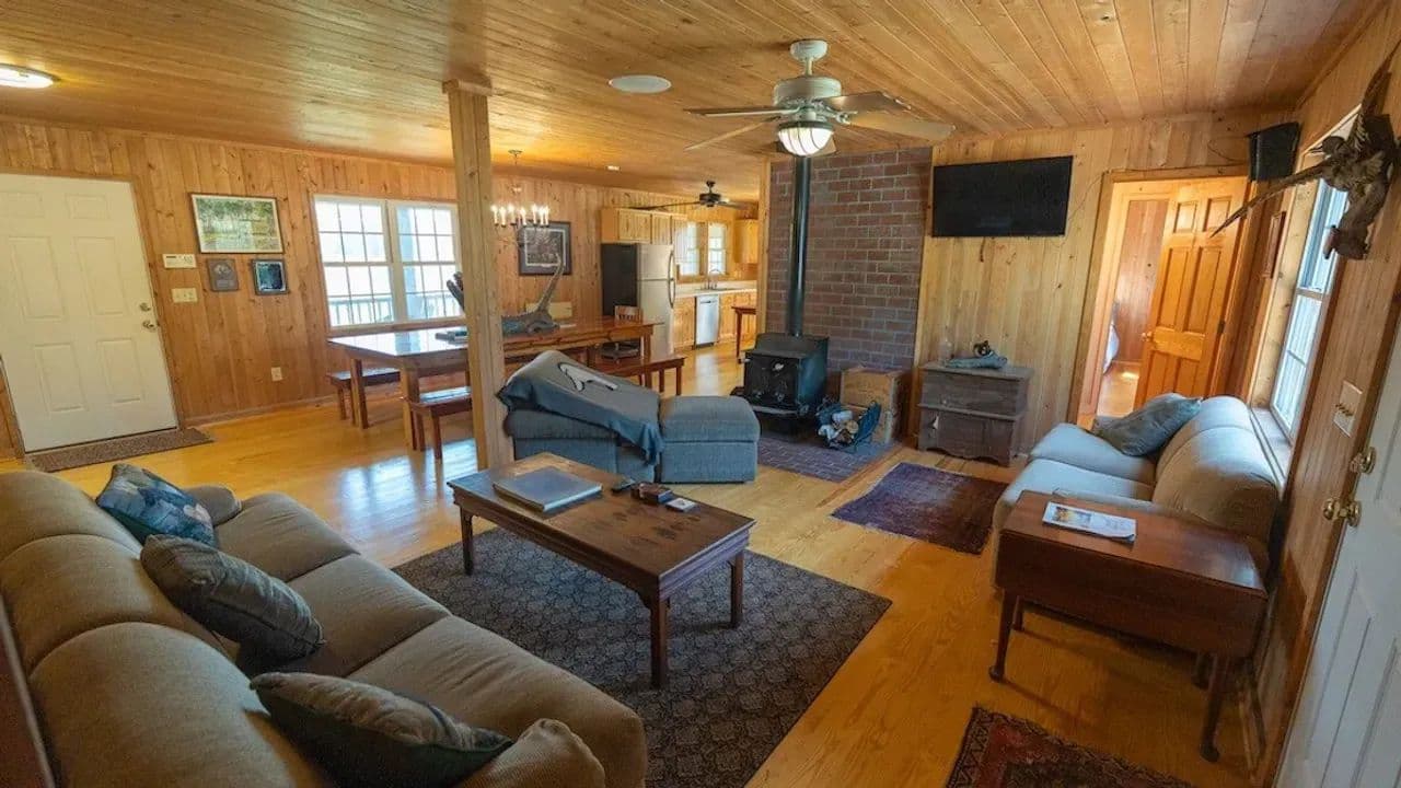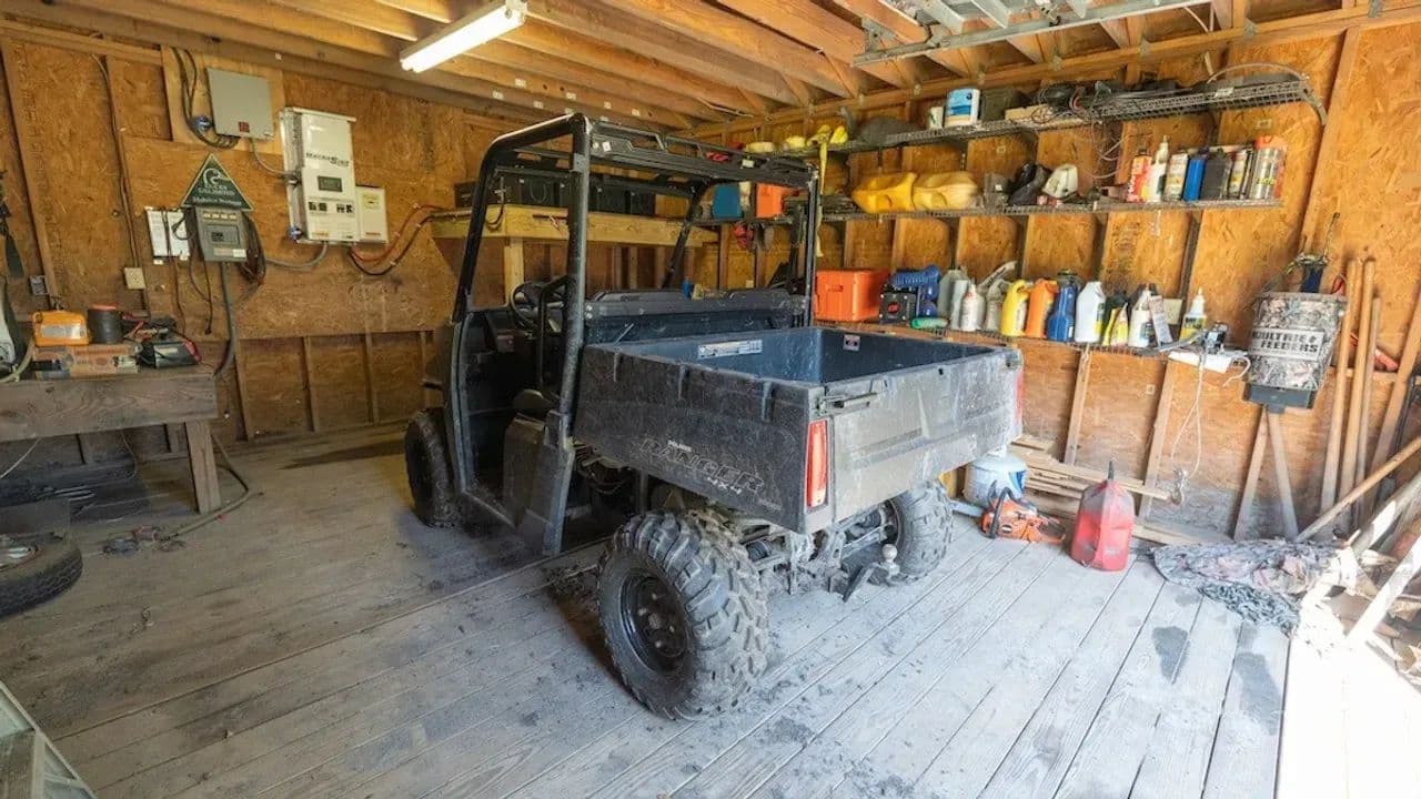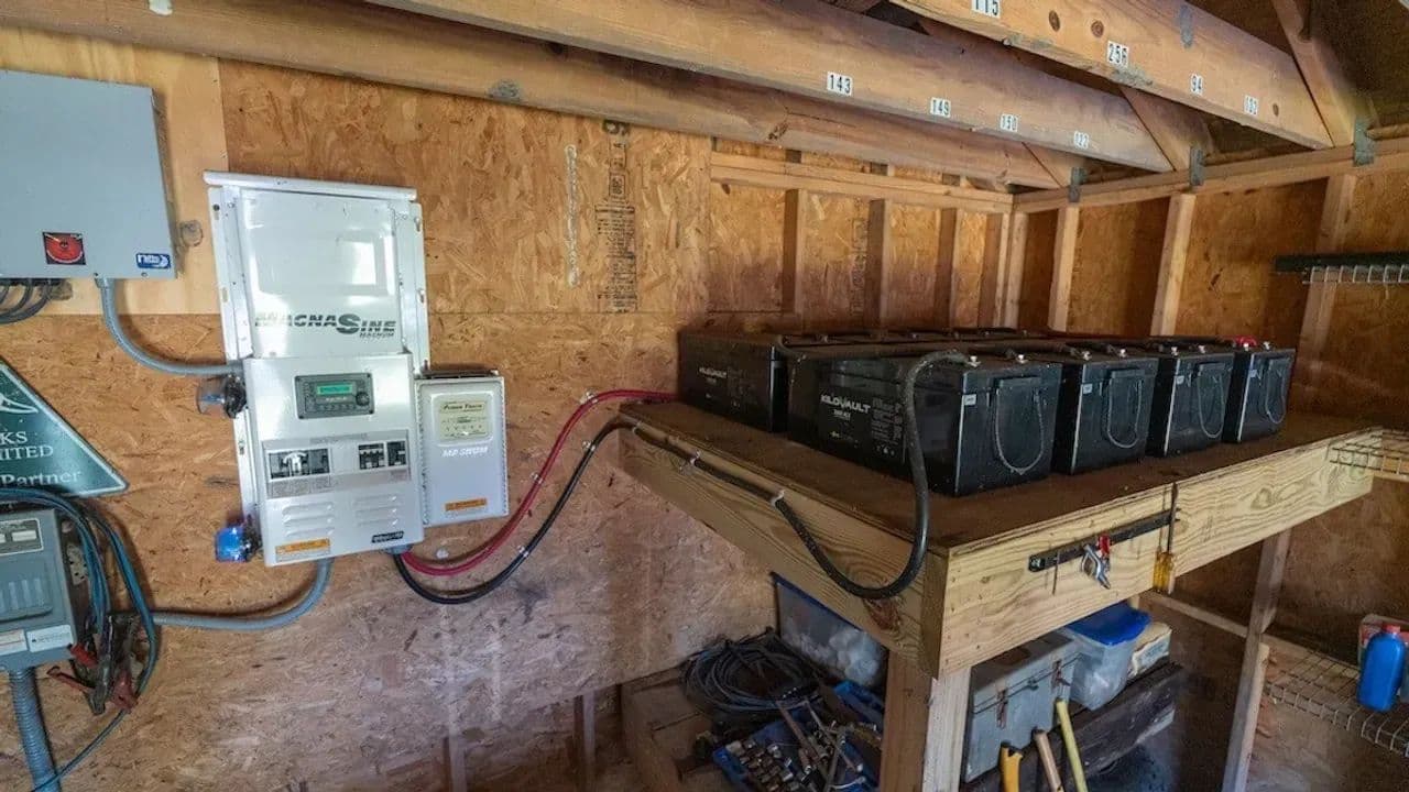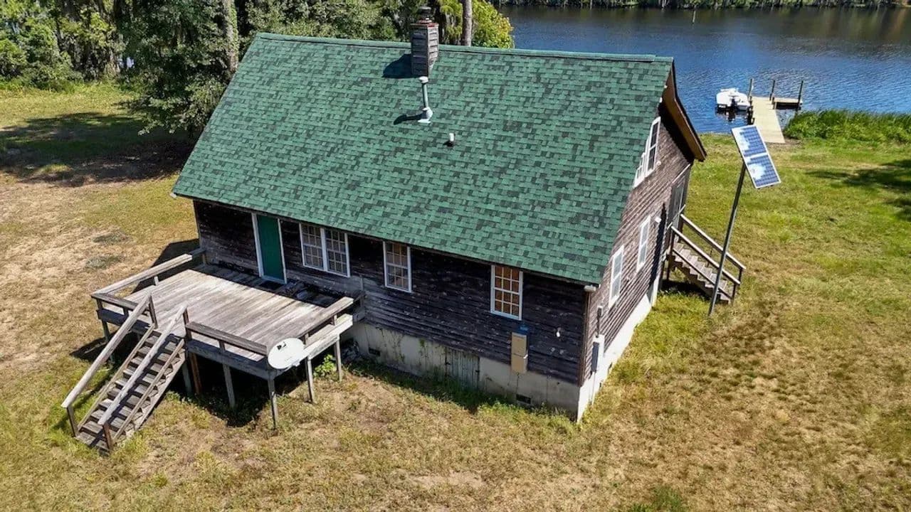 Improvements include a thoughtfully placed residence built in 1998, situated to capture prevailing breezes and designed with a screened porch overlooking the Neuse River and private dock. The interior offers an open layout with rare white juniper finishes, multiple bedrooms, and modern amenities, while a 5 kW solar array, updated lithium batteries, inverter, and a permitted well provide reliable off-grid living. Additional structures include a large shed for equipment and tractor storage, supporting the property’s recreational and practical uses.