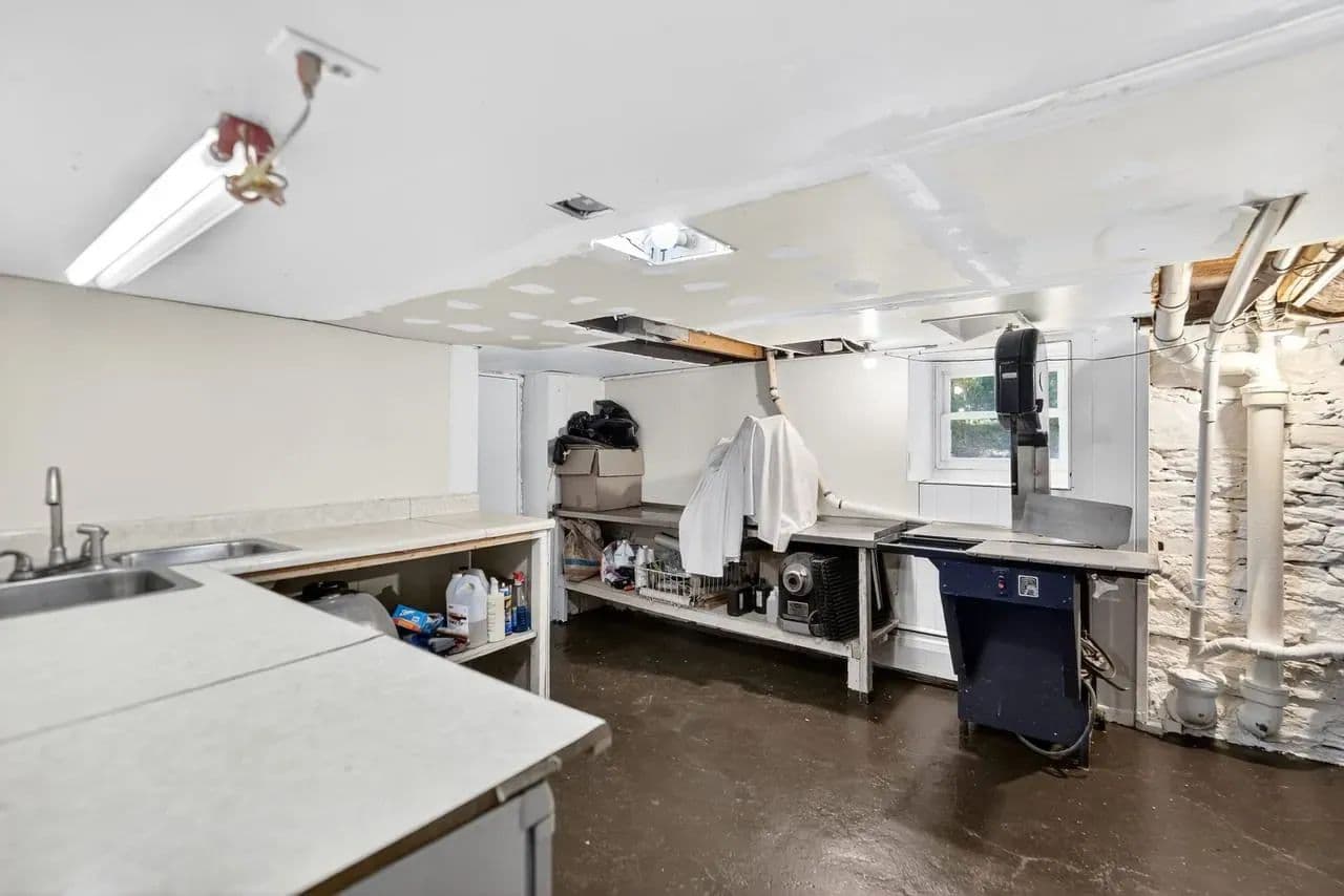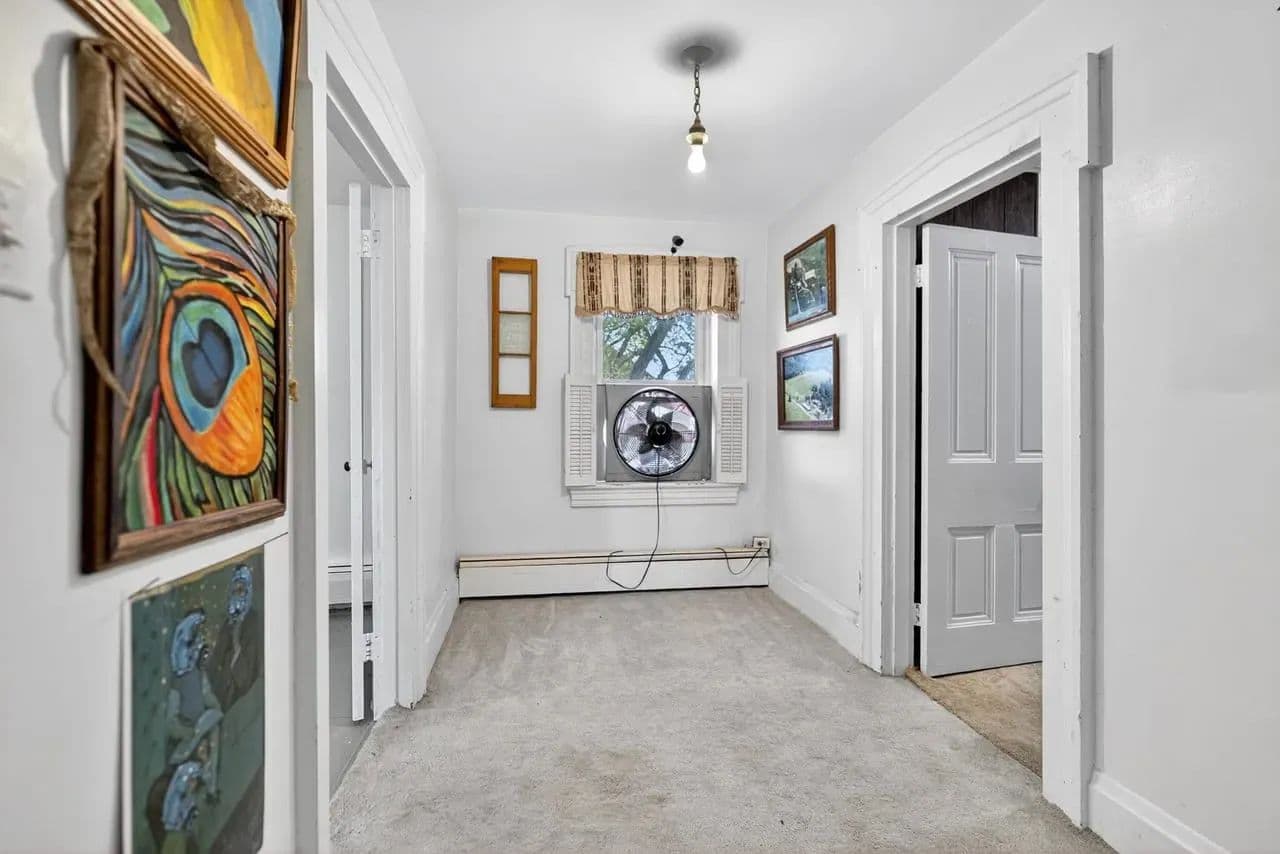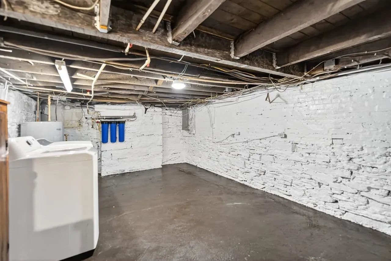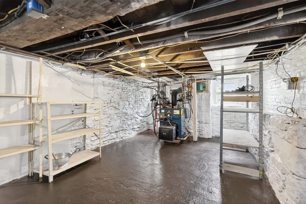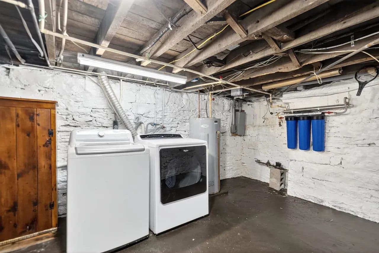 Upstairs, there are four additional bedrooms plus an insulated, unfinished attic for storage. The basement offers a kitchenette for canning, winemaking, or extra prep space. Utilities include hot water, oil-fired heat with dual 275-gallon tanks, washer/dryer, and a whole-house three-stage Big Blue water filtration system.