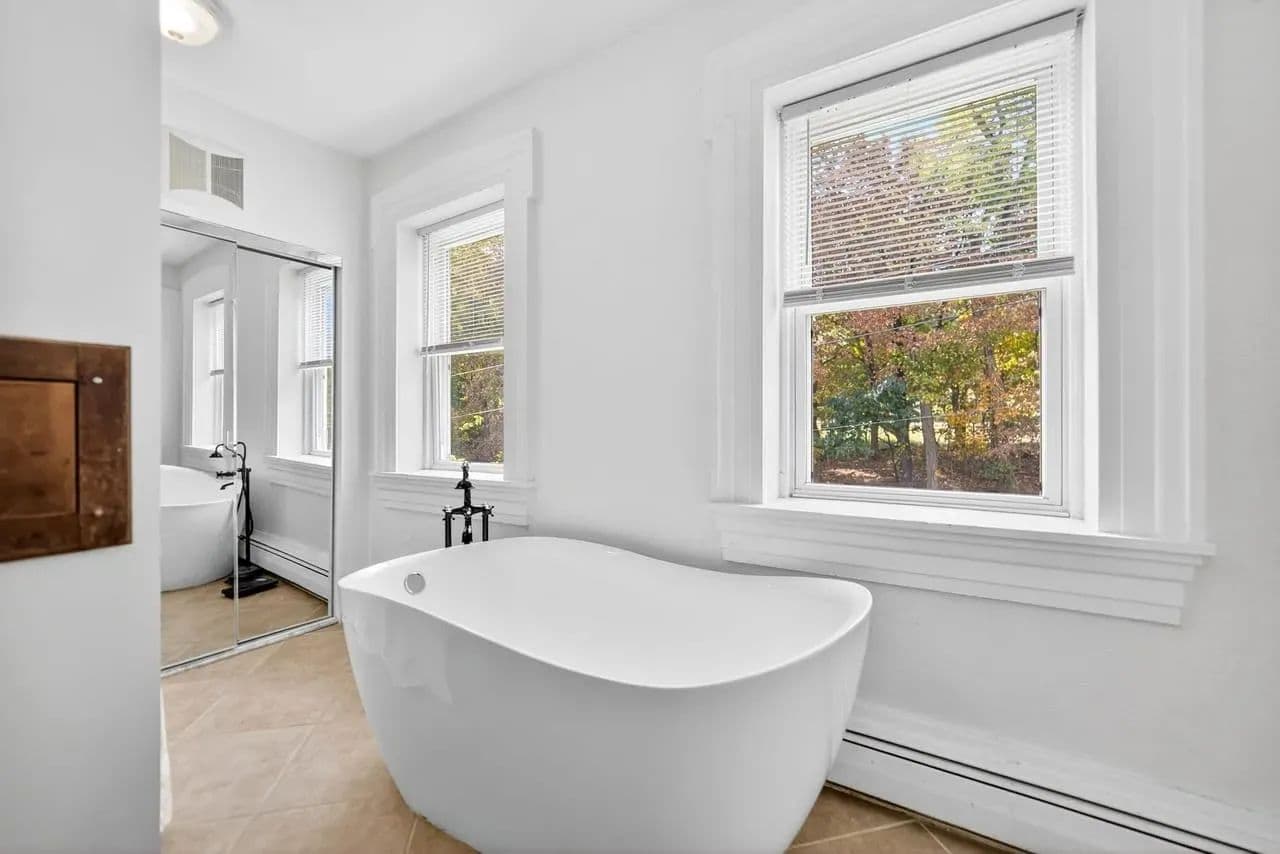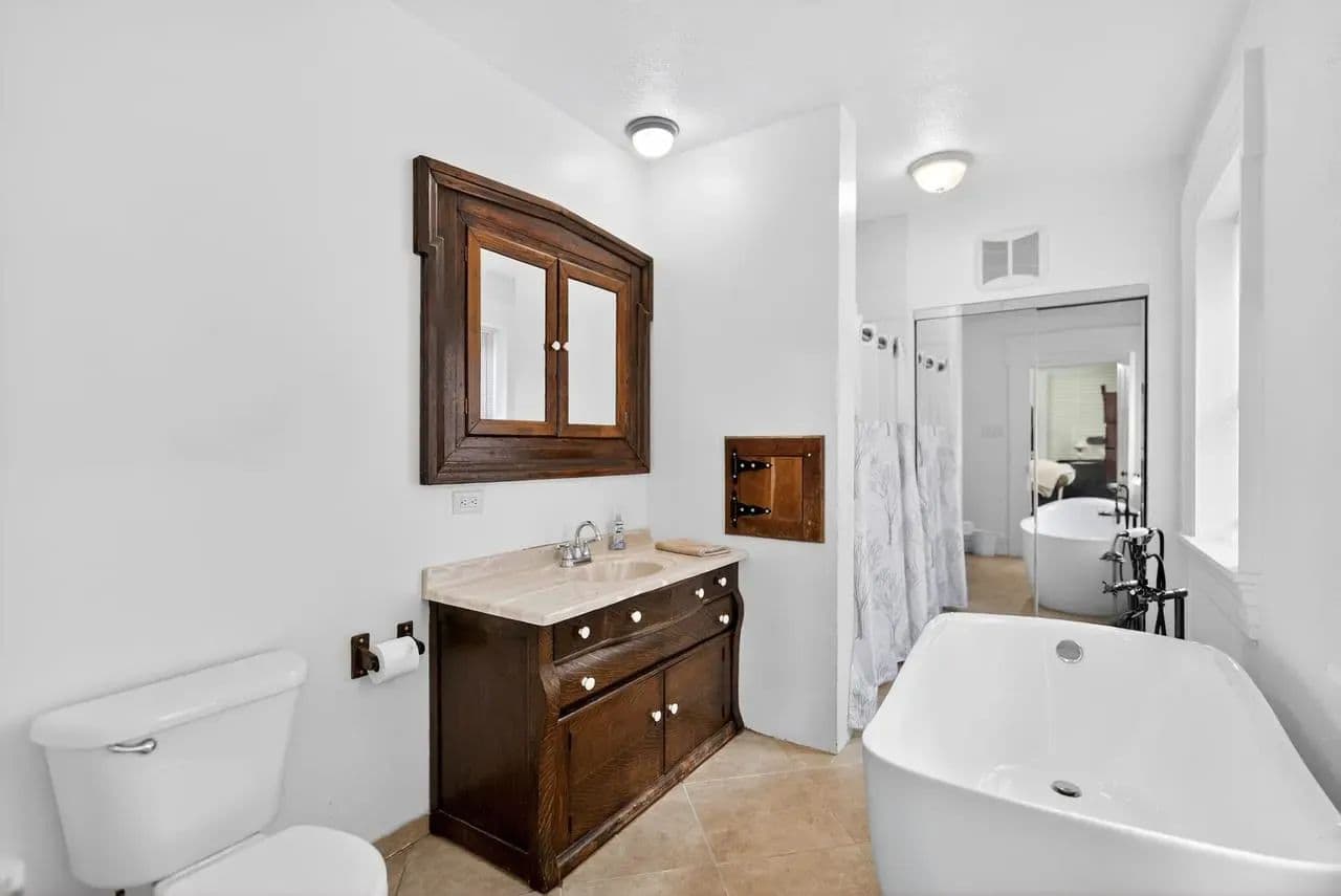 Remodeled full bath with freestanding tub, shower stall, and updated vanity