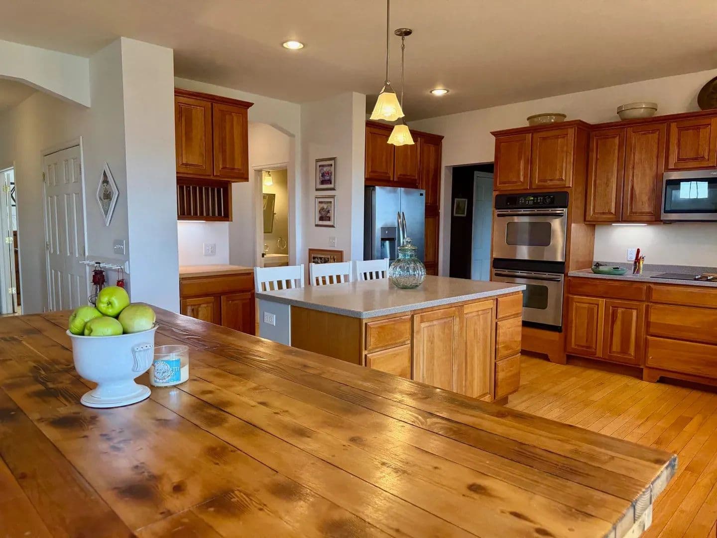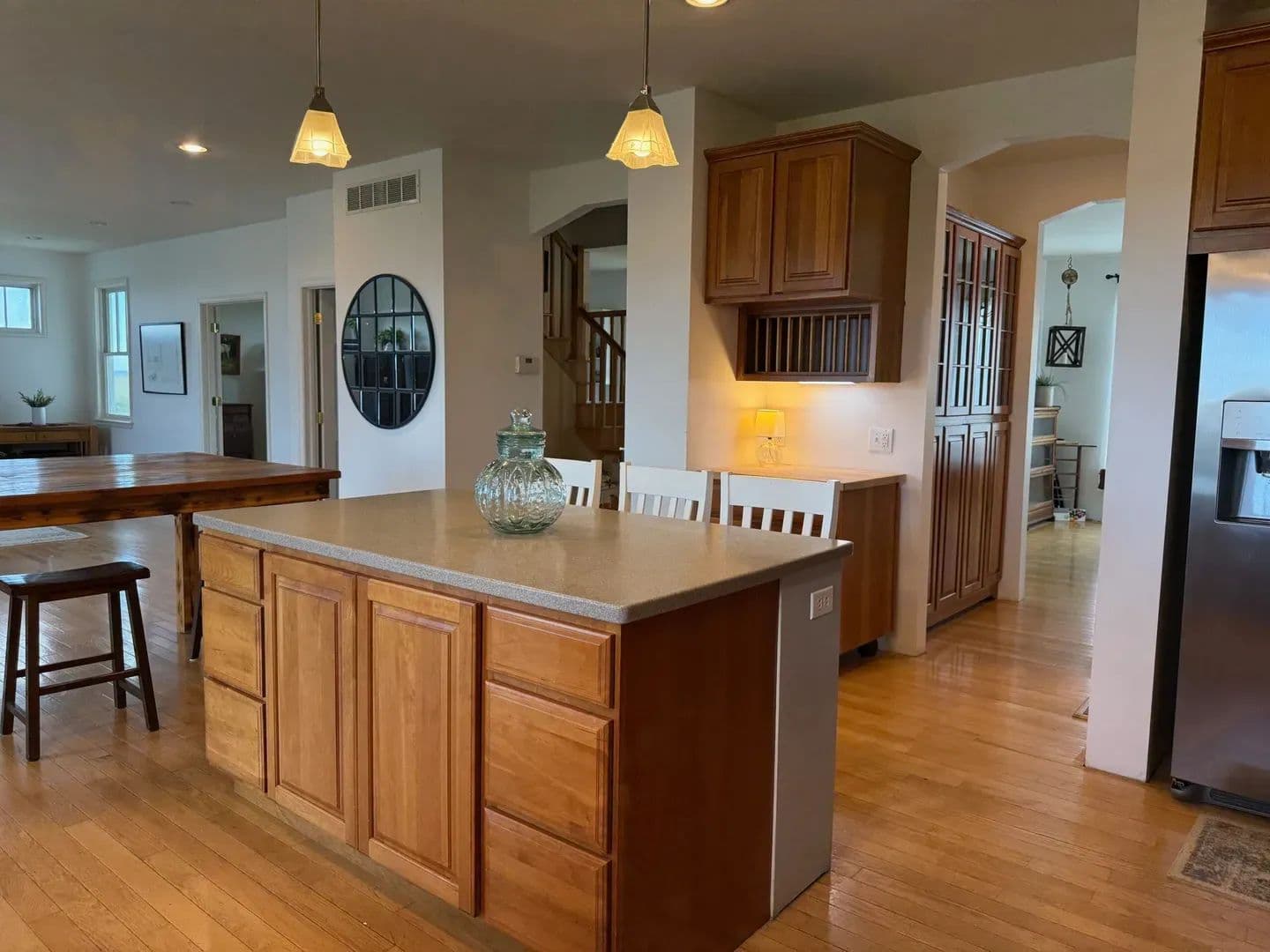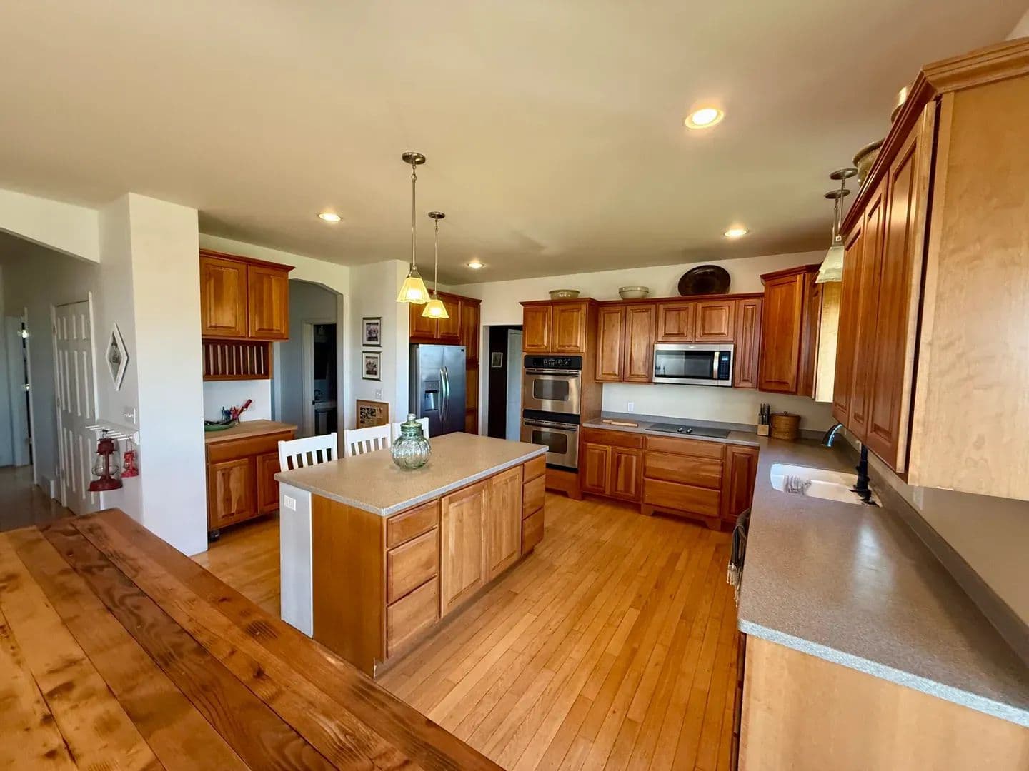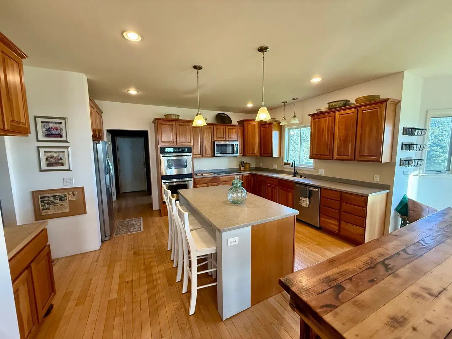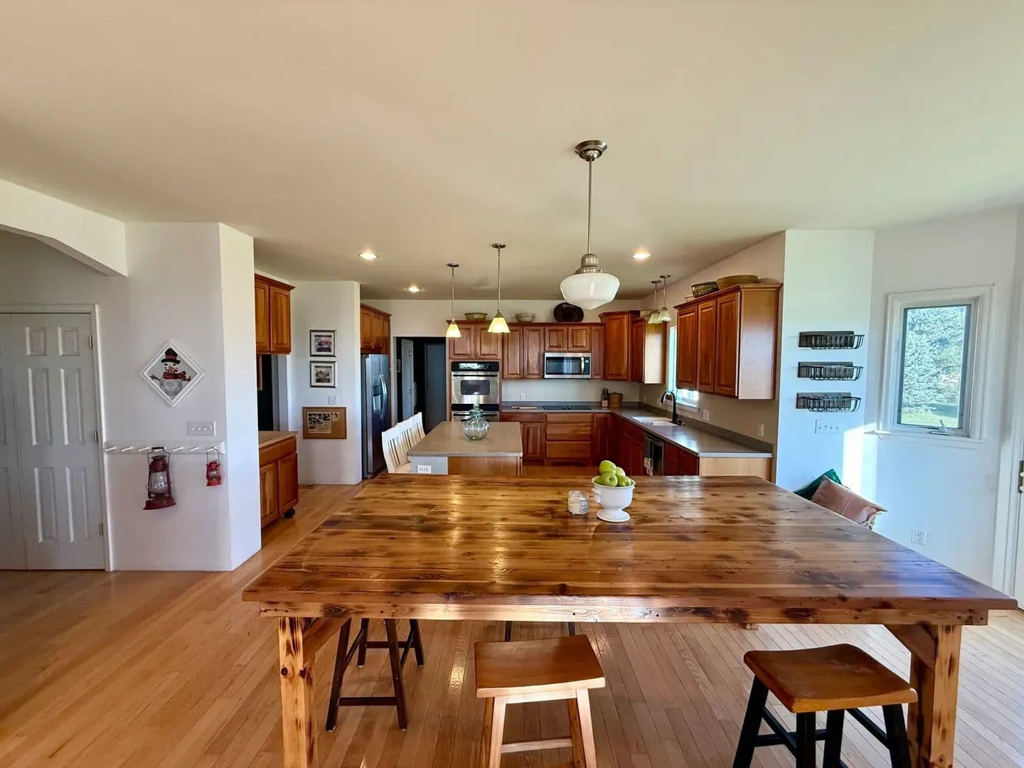 Step inside to discover an open-concept floor plan that seamlessly connects the kitchen, dining, and living areas—ideal for both everyday comfort and entertaining. The kitchen is a chef’s dream, with abundant counter space, a large central island that serves as a perfect gathering spot, and oversized windows that flood the home with natural light.