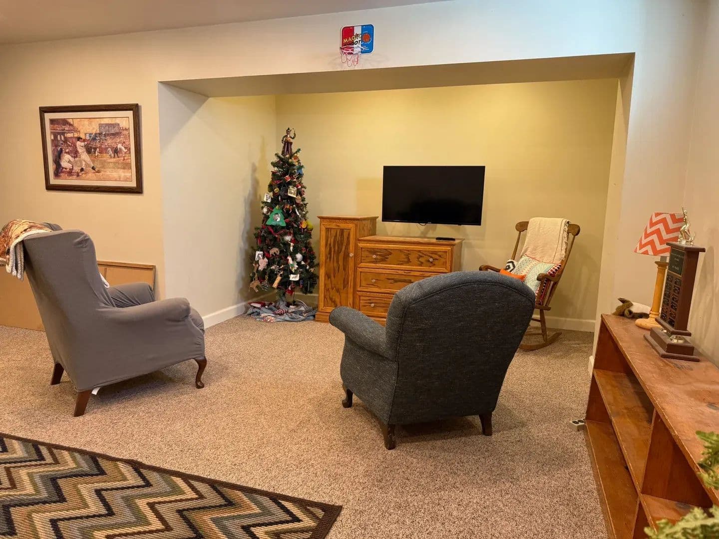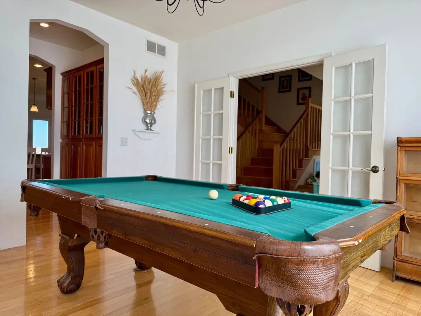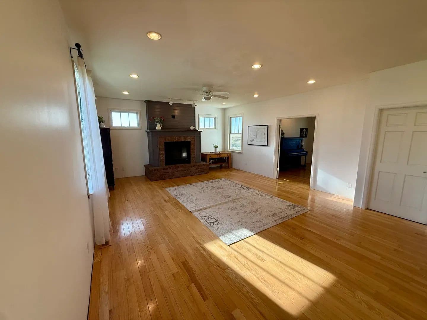The living room is equally impressive, anchored by a large fireplace and enhanced by soaring ceilings that add a sense of grandeur. Throughout the home, you’ll find beautiful hardwood flooring and thoughtful custom touches that reflect quality craftsmanship.