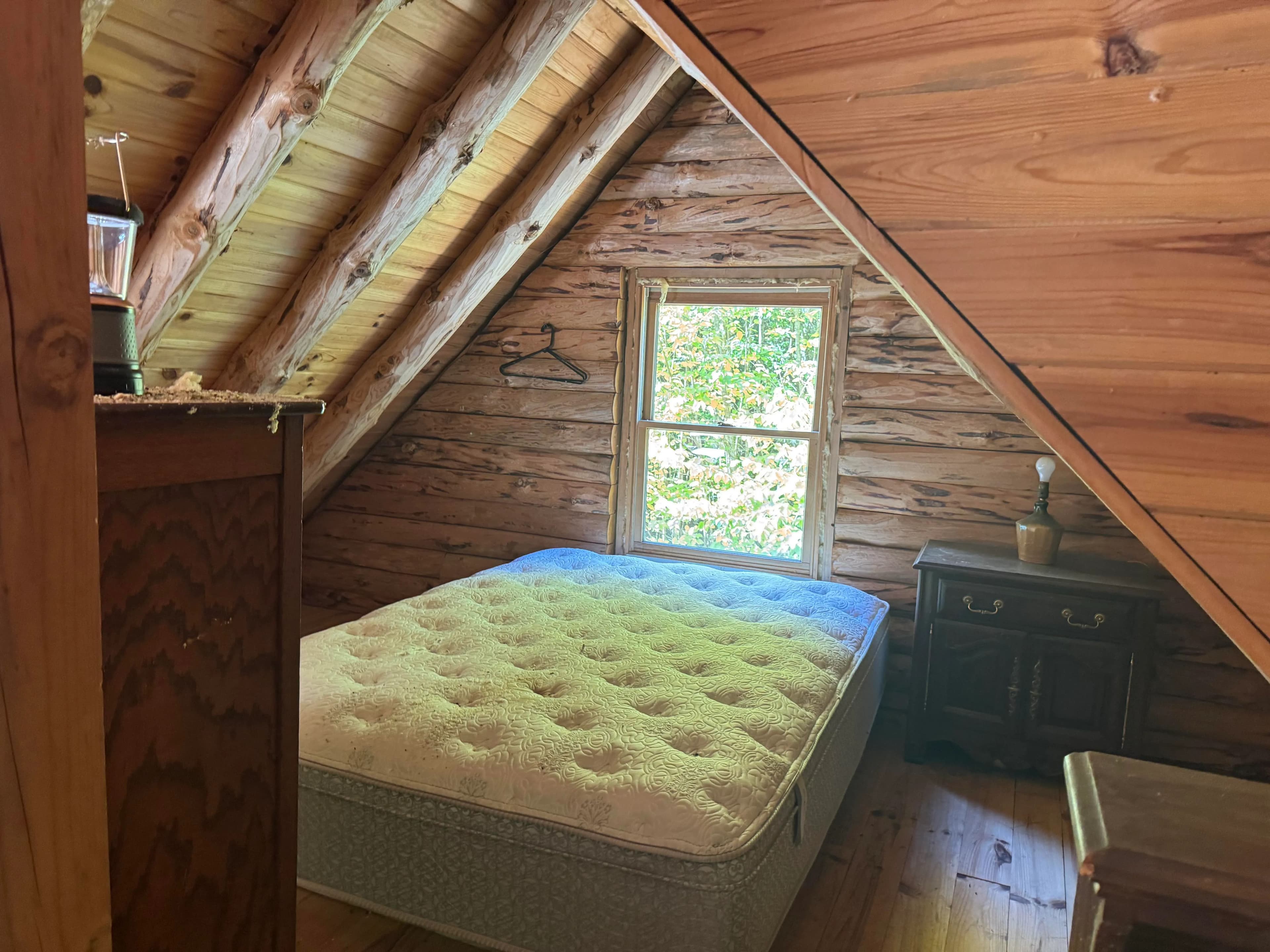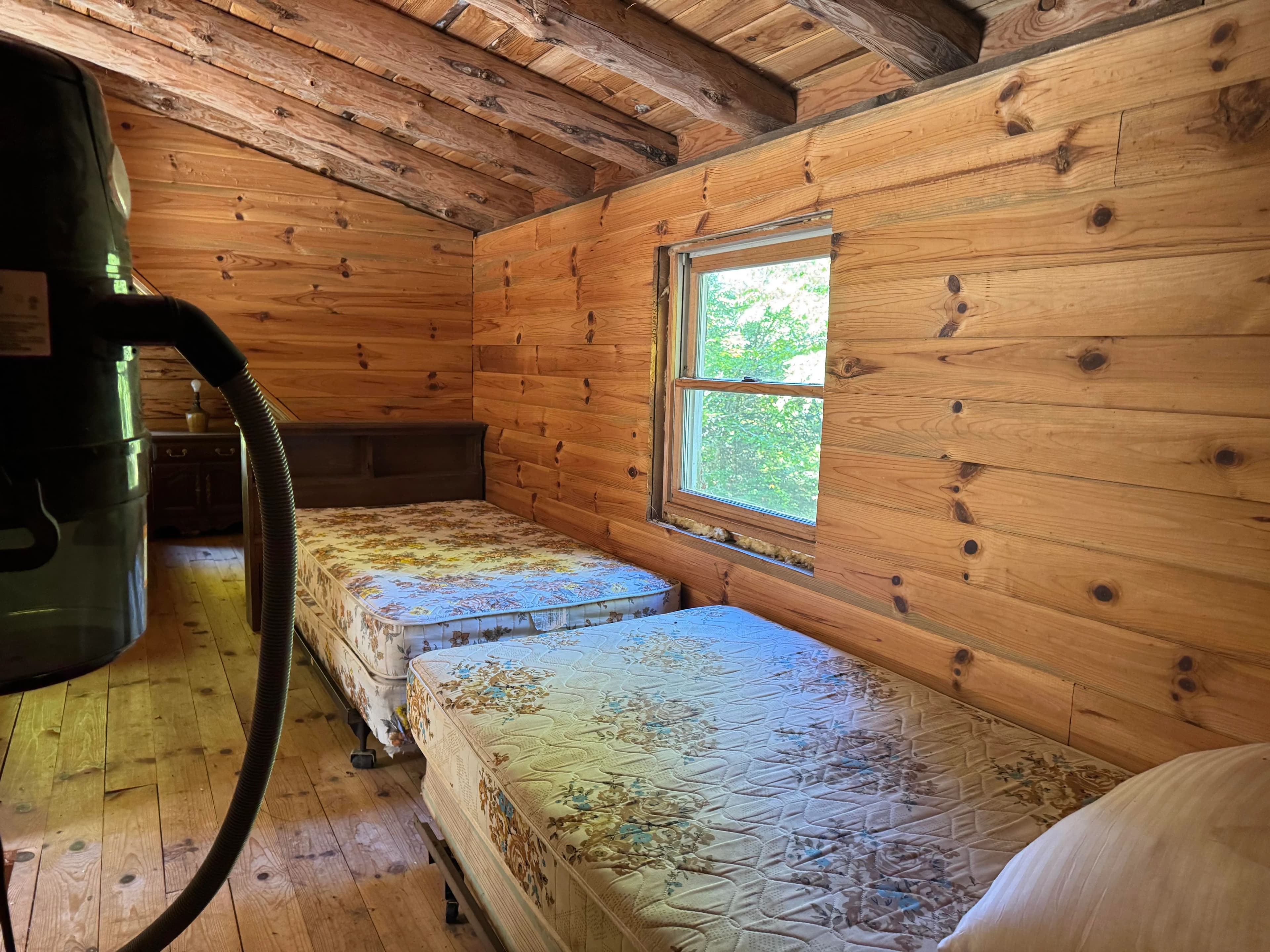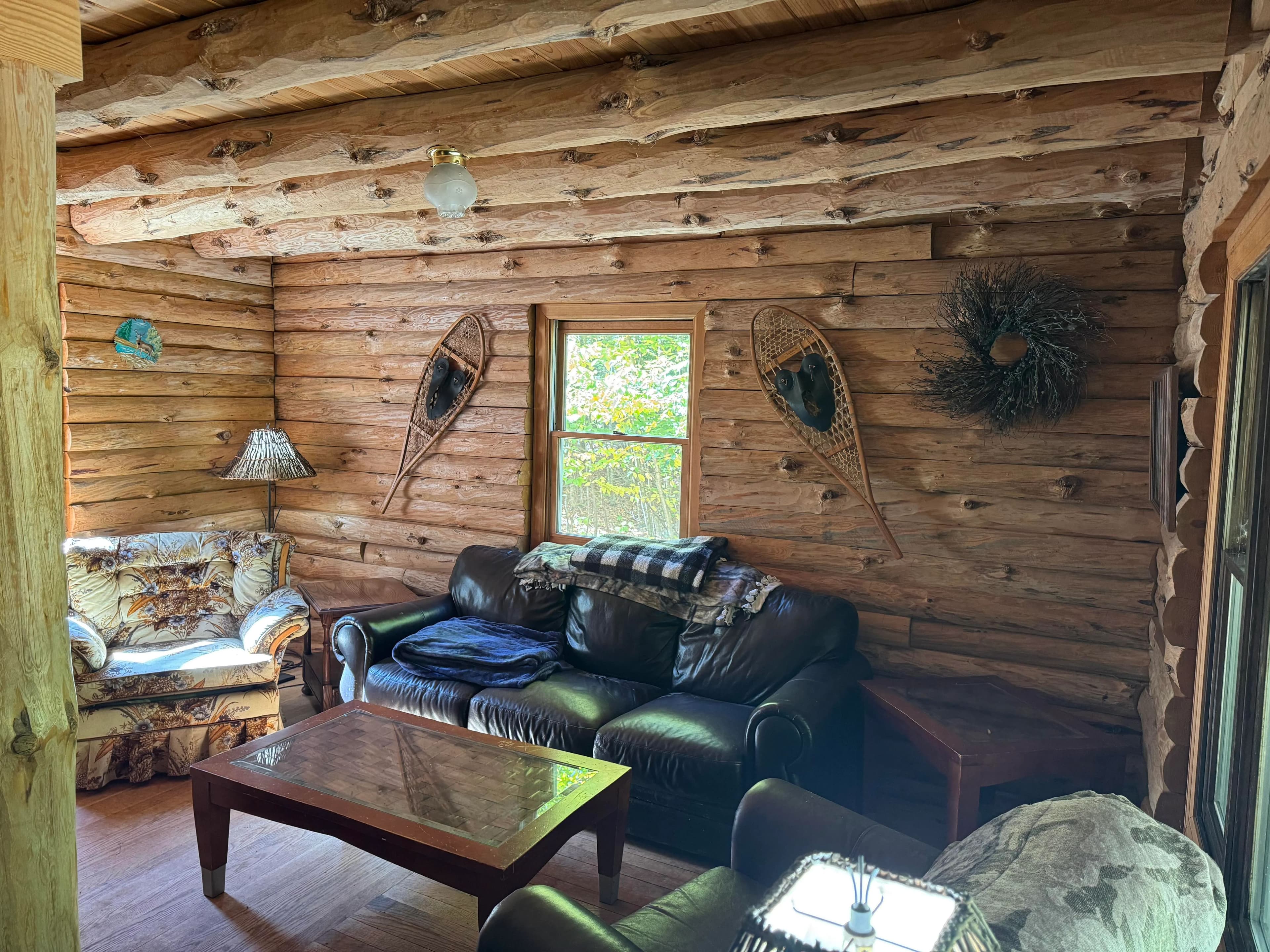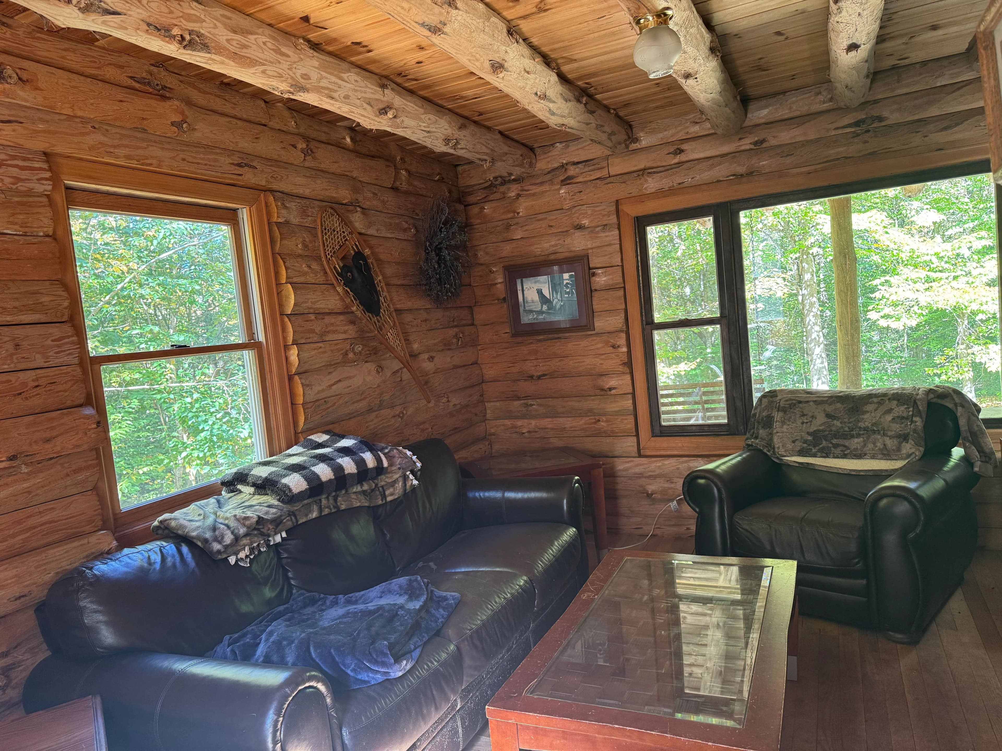 The cabin features a full basement with poured concrete walls, housing the utilities that power the home via generator and providing plenty of extra storage space. The first floor offers a cozy eat-in kitchen, living room, and full bathroom, while the second floor includes multiple sleeping areas and a central vacuum system for added convenience.