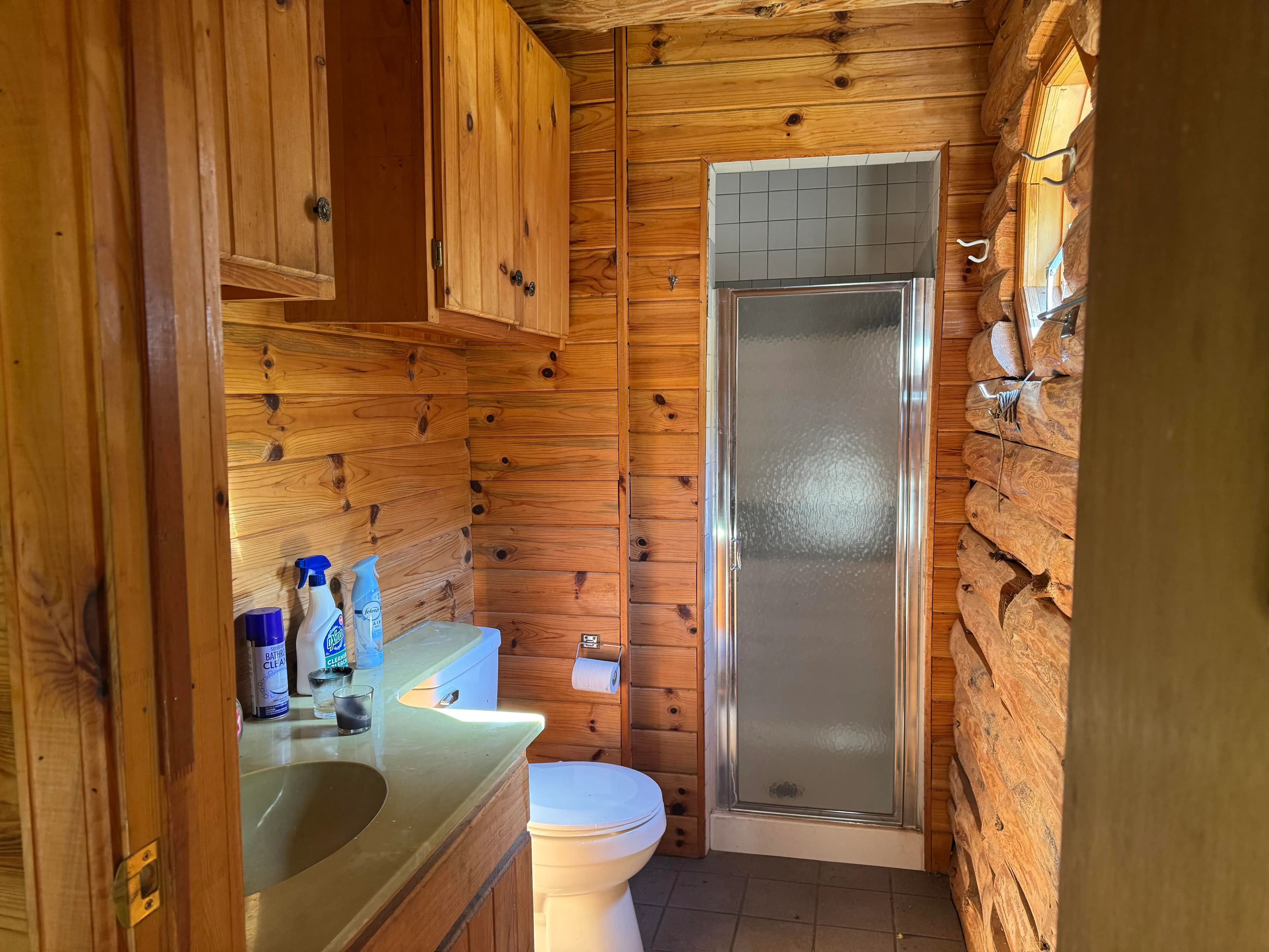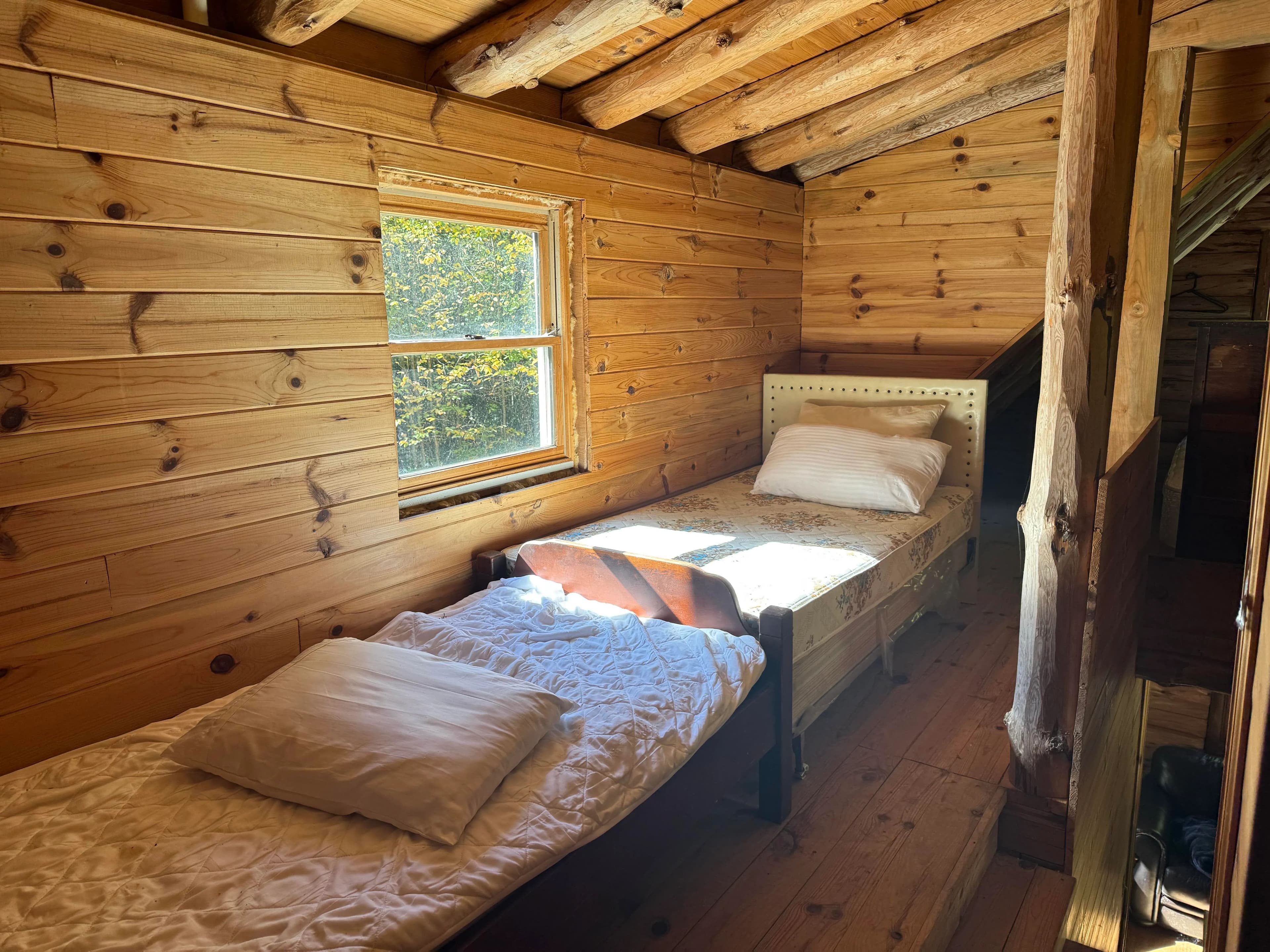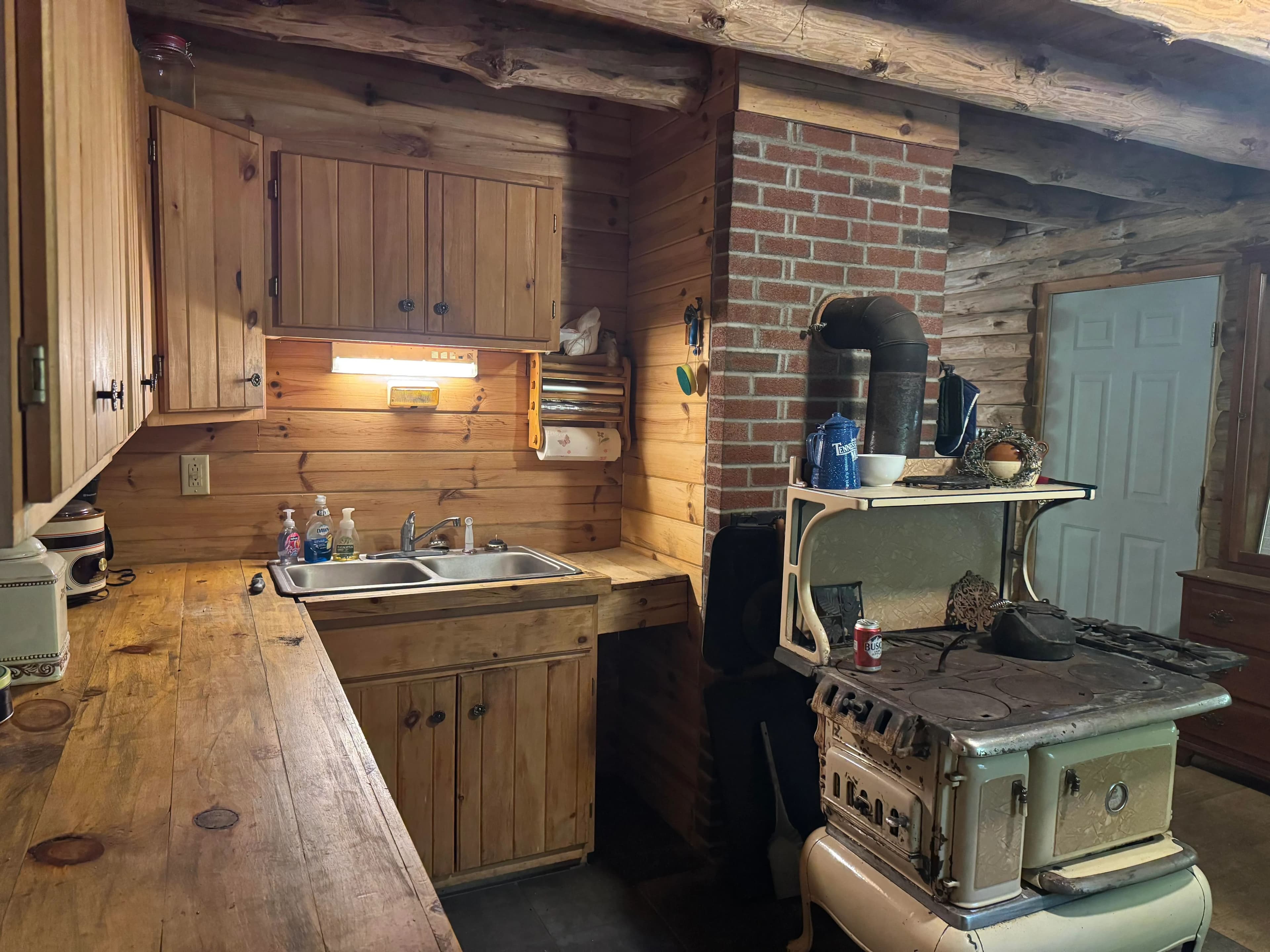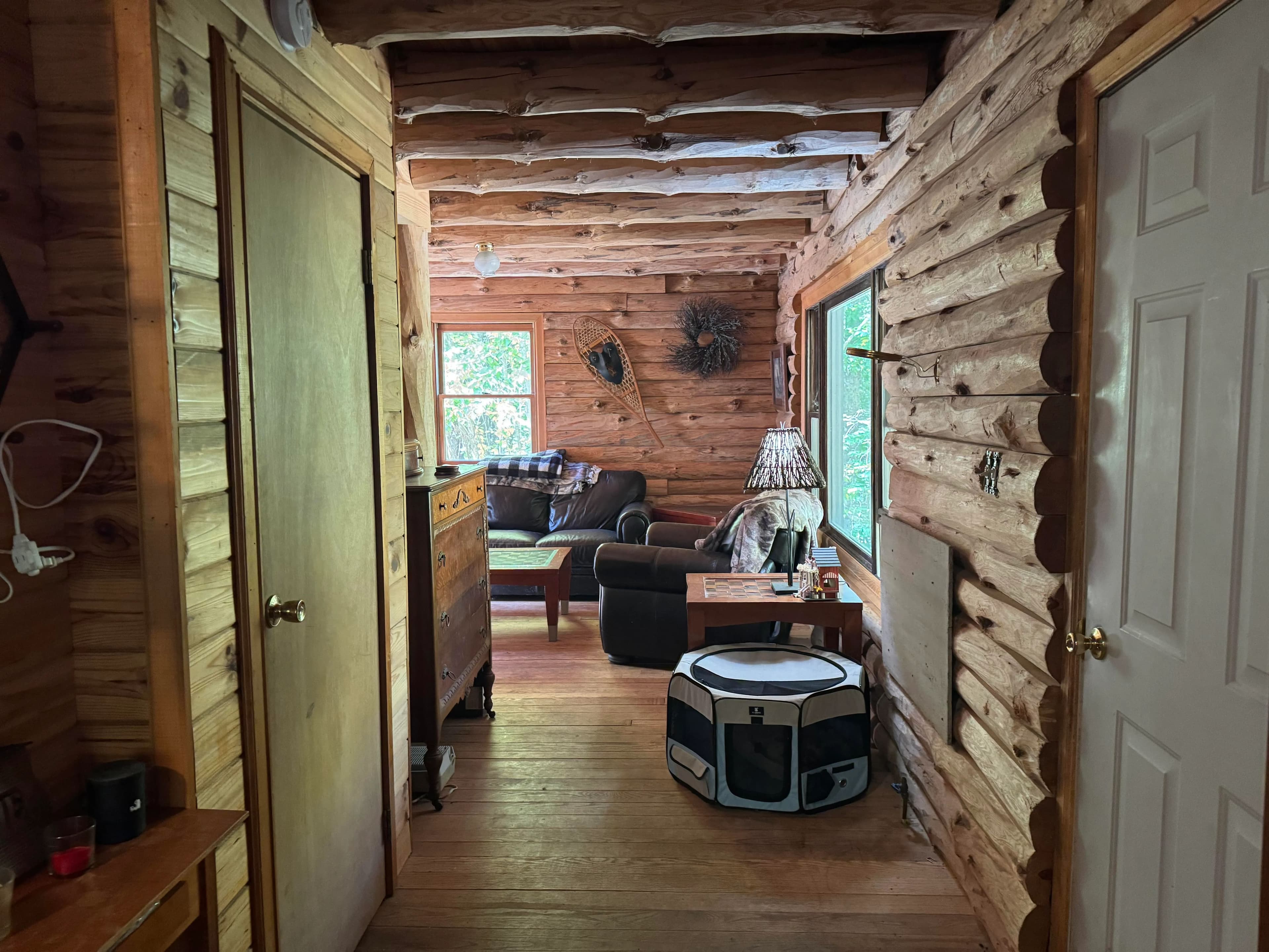 The cabin features a full basement with poured concrete walls, housing the utilities that power the home via generator and providing plenty of extra storage space. The first floor offers a cozy eat-in kitchen, living room, and full bathroom, while the second floor includes multiple sleeping areas and a central vacuum system for added convenience.