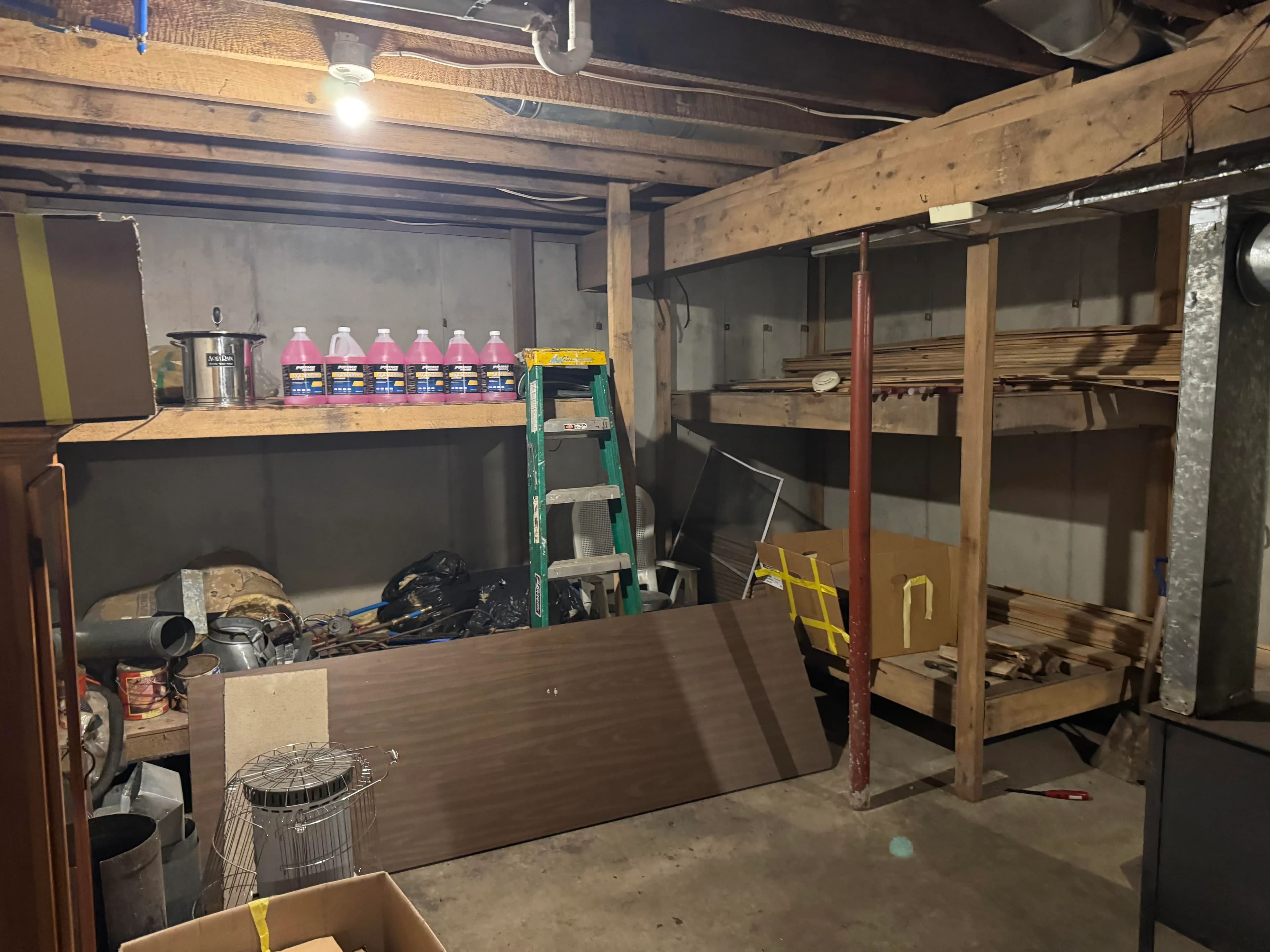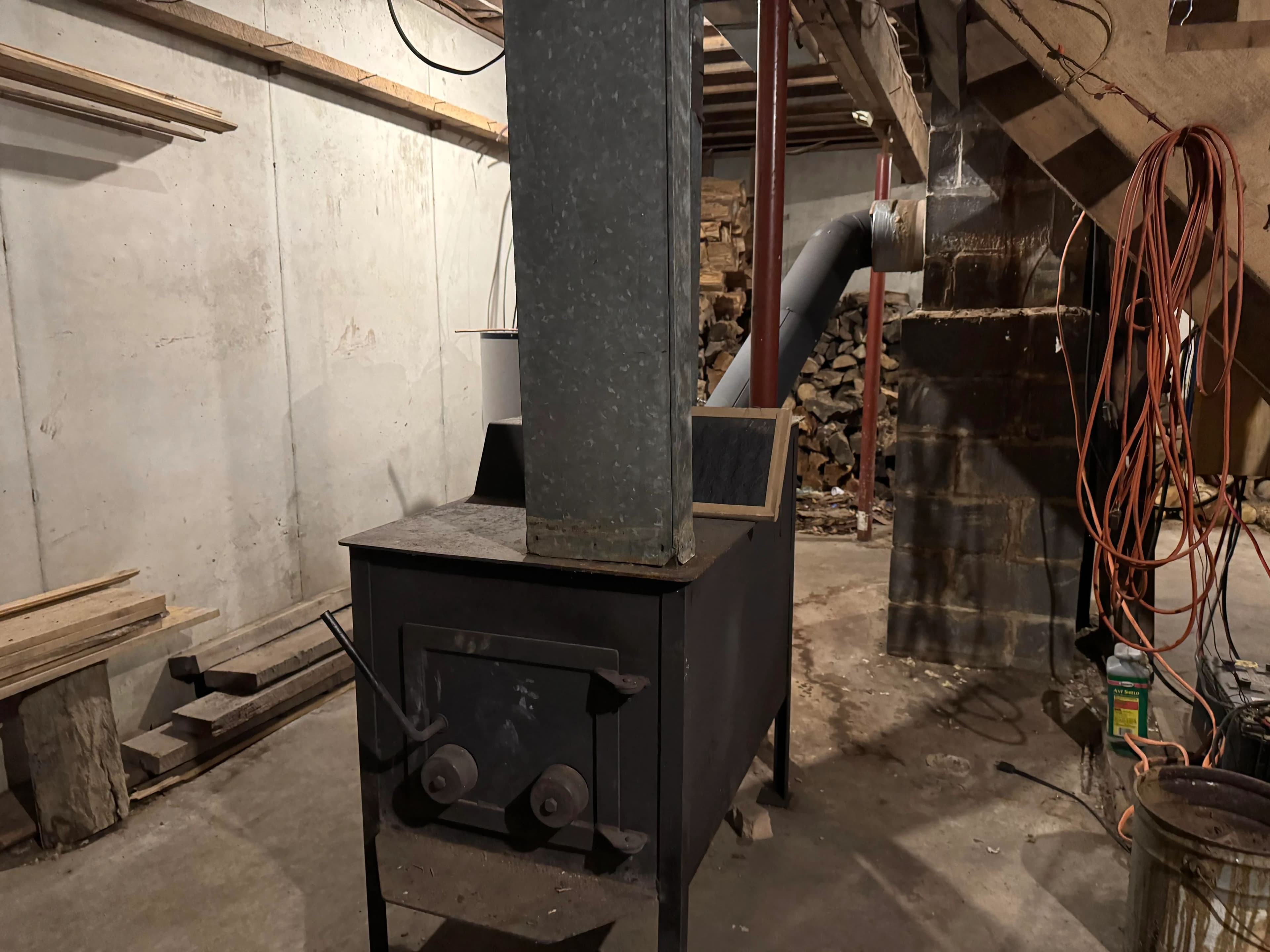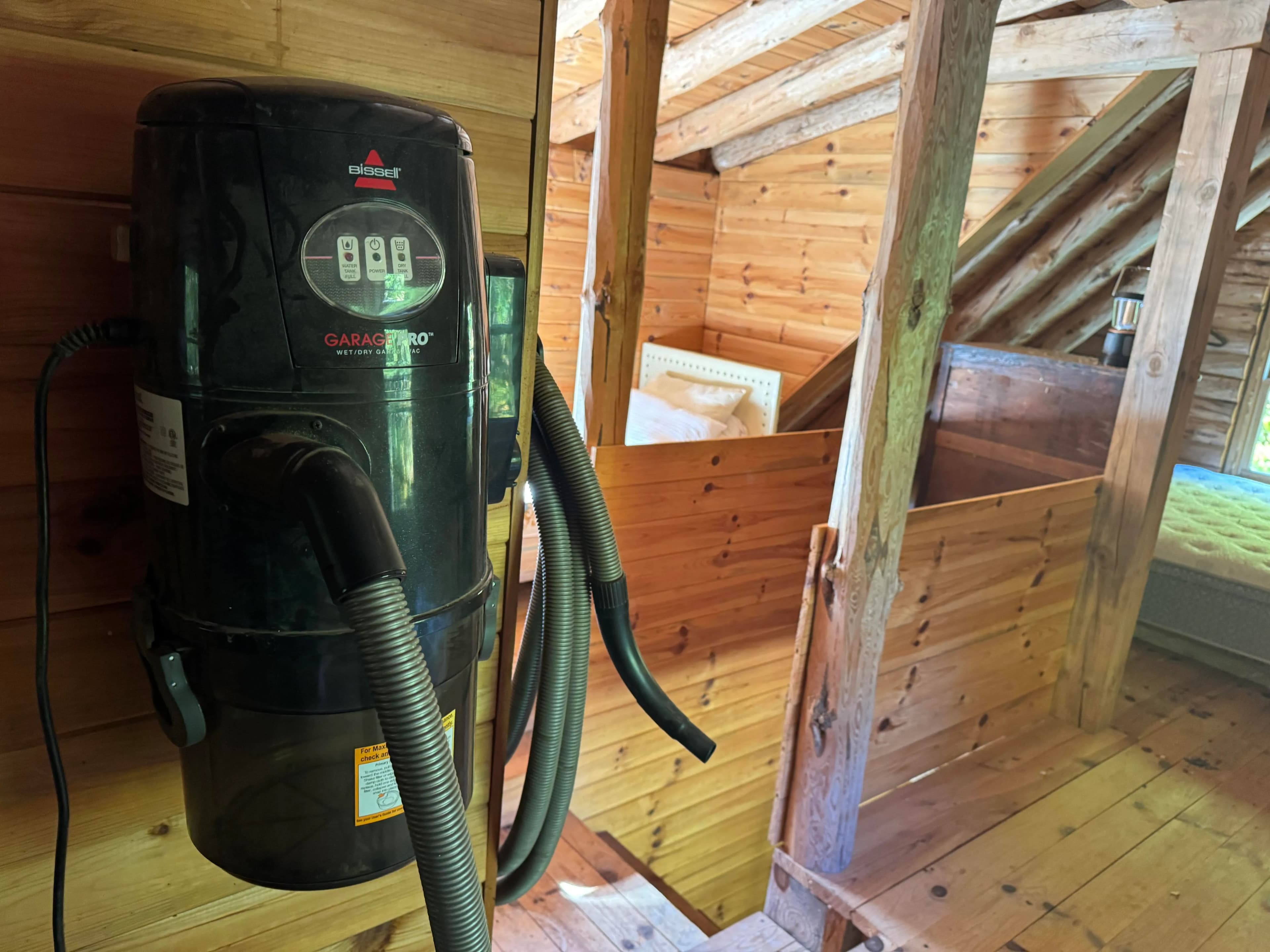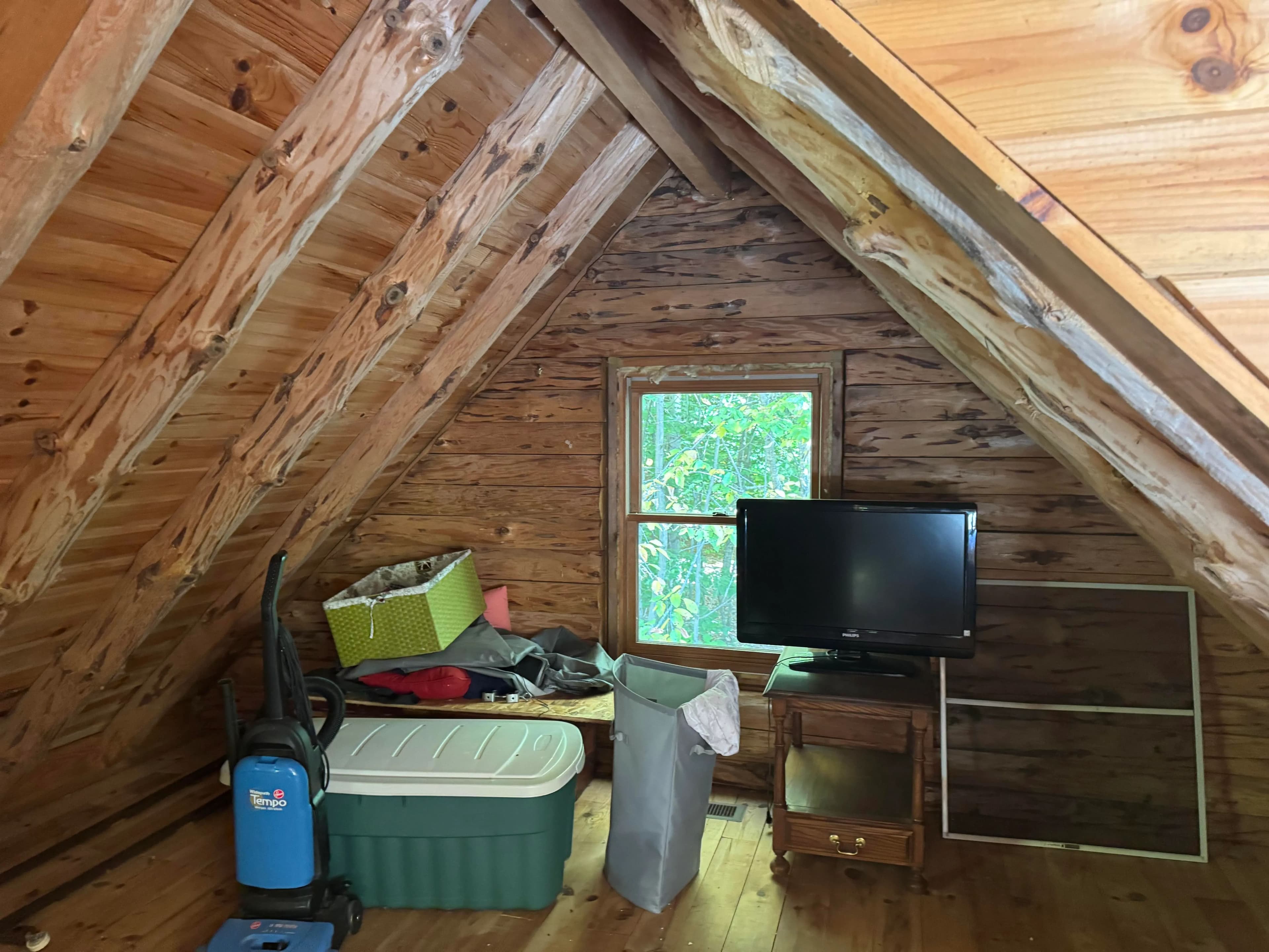 The cabin features a full basement with poured concrete walls, housing the utilities that power the home via generator and providing plenty of extra storage space. The first floor offers a cozy eat-in kitchen, living room, and full bathroom, while the second floor includes multiple sleeping areas and a central vacuum system for added convenience.