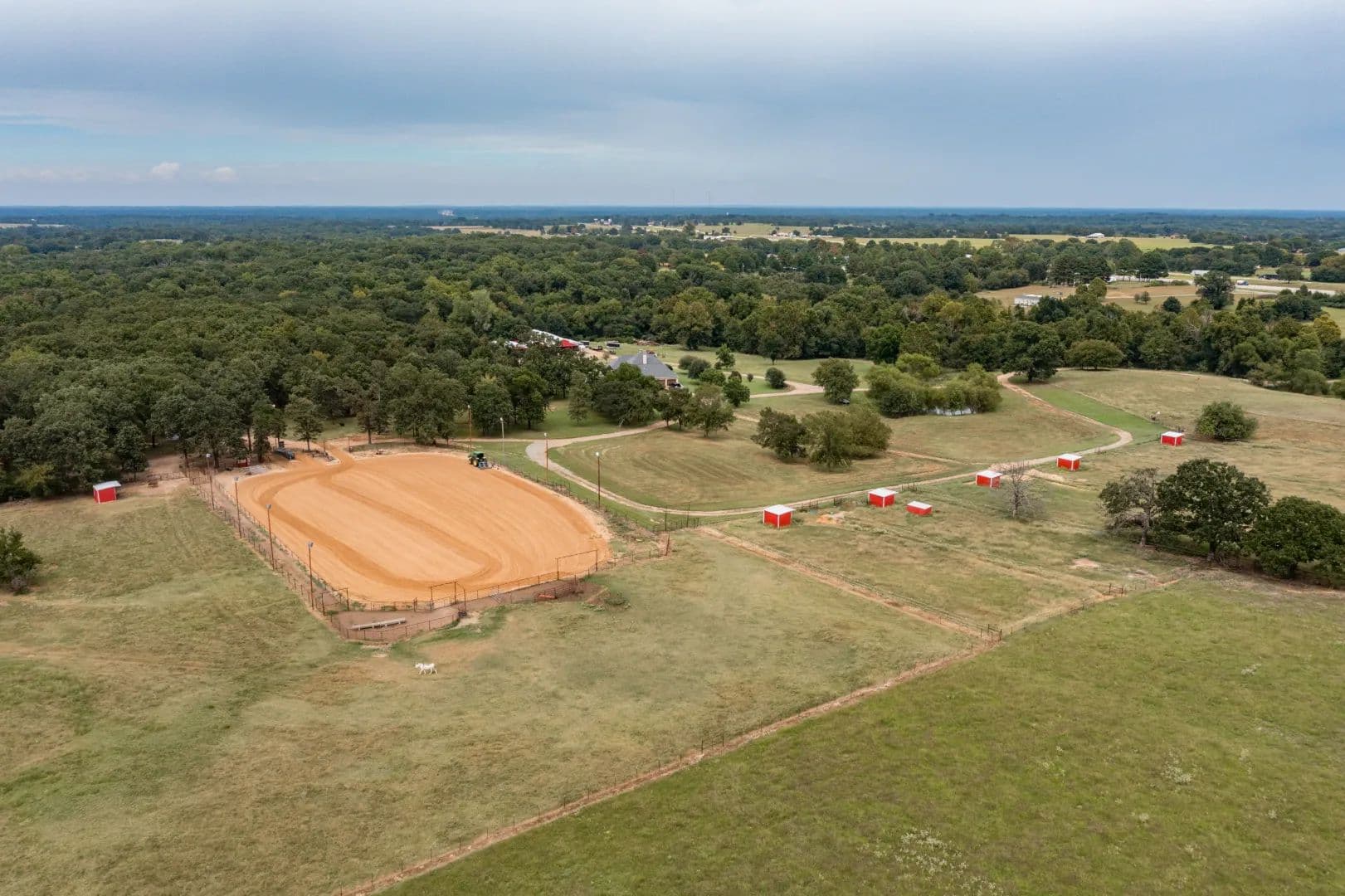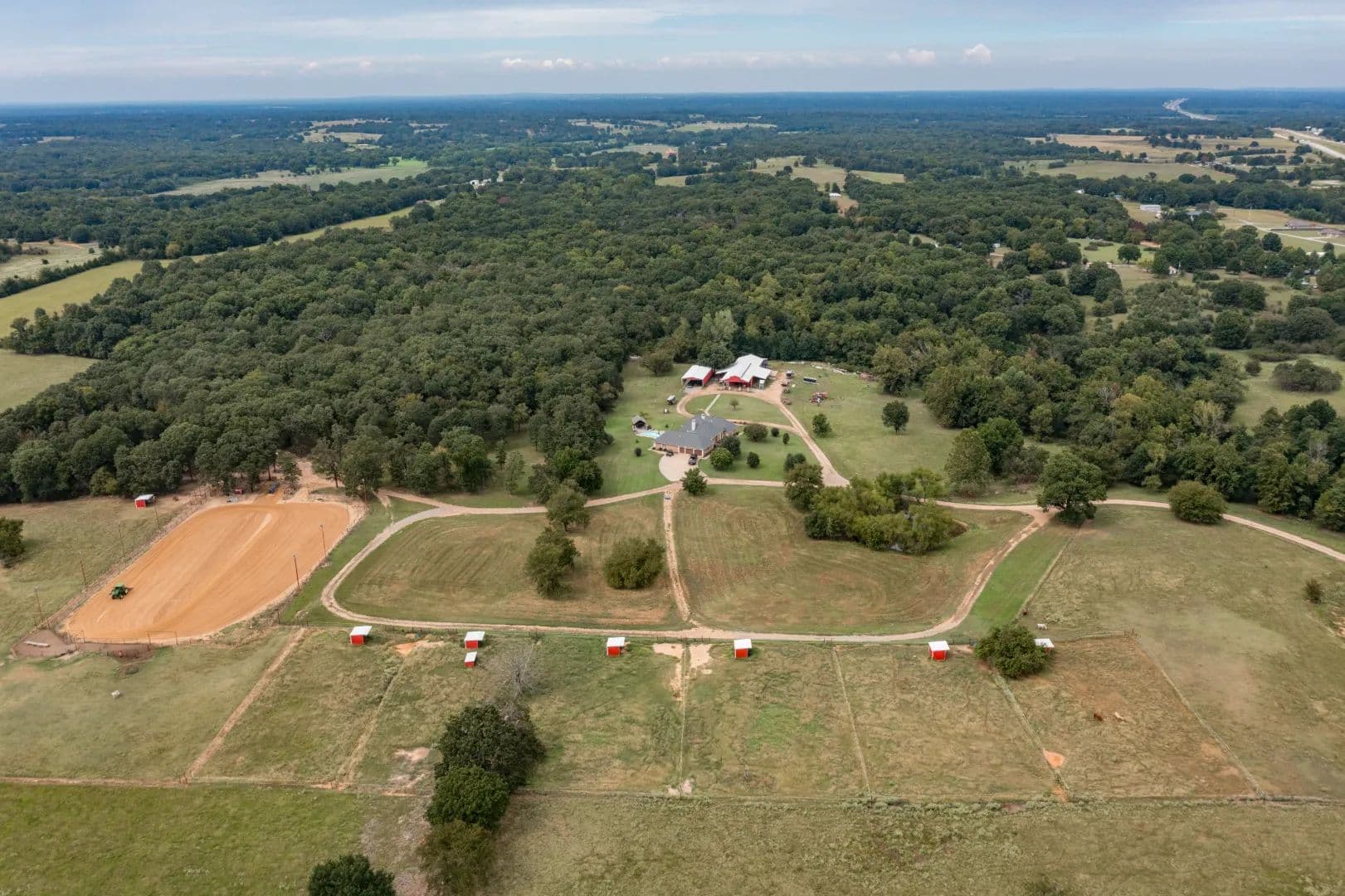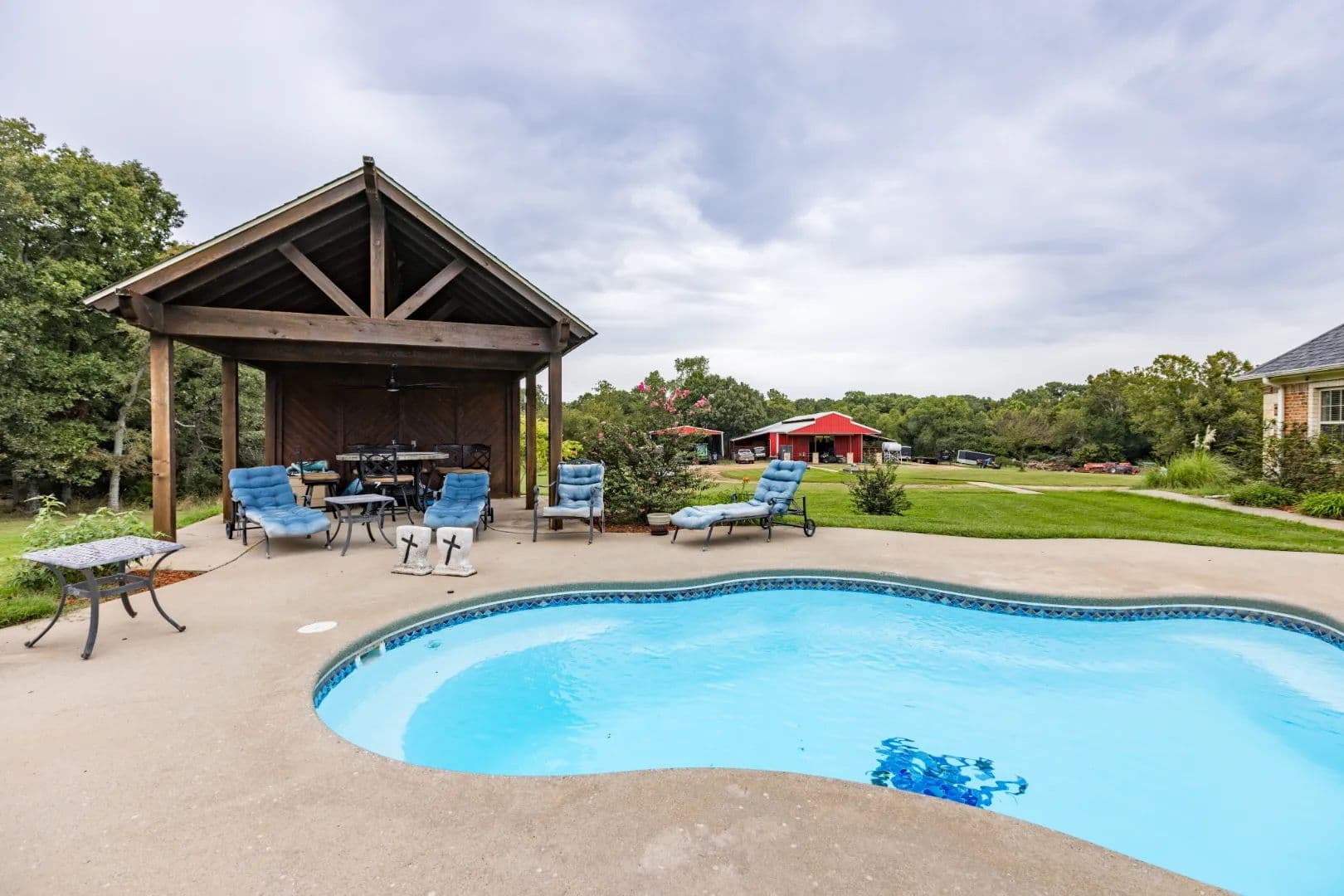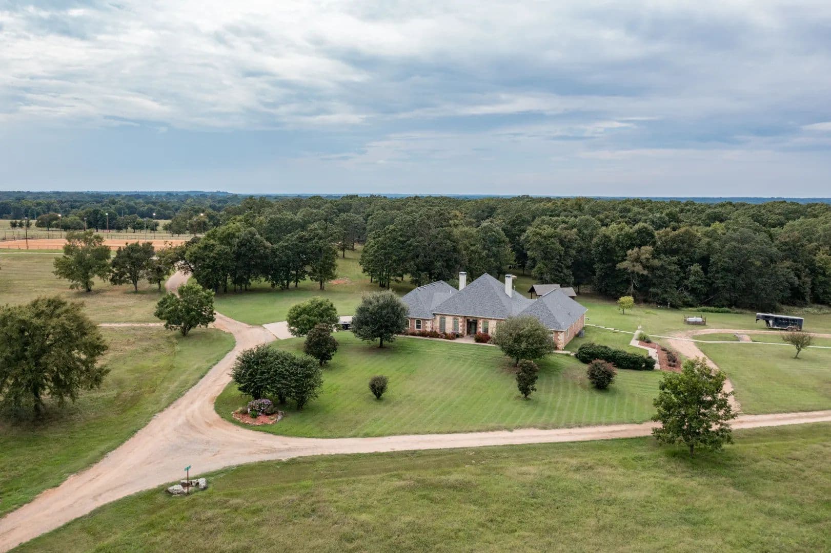 Luxury Ranch on 97+- Acres with Horse Barn and Lighted Arena Nestled away from the hustle and bustle, this property offers the perfect blend of tranquility and luxury. The beautifully landscaped grounds feature a lighted and heated inground pool, a poolside gazebo with a hot tub, and a professional 14-zone sprinkler system. Horse enthusiasts will love the 5-stall horse barn with a wash rack, heated and cooled tack room, RV or LQ covered parking, hay storage, and a connex storage building. The 37x73 shop provides ample workspace, while the 166x300 lighted arena is ideal for roping, barrels, and other equestrian activities. Also included are several turn out pens and 6 Horse sheds with their own water supply. Enjoy the great outdoors with two ponds (including a large catfish pond with a fishing dock) and abundant wildlife. The property also features a playground, picnic area, and firepit for entertaining guests. Inside the luxurious home, you'll find an open kitchen and living concept, a formal dining room, granite countertops, a propane fireplace, an office, a game room with a wet bar, and two master suites with private baths and walk-in closets. Owner financing available – Seller is open to offering owner financing with acceptable terms. Contact listing agent for details.