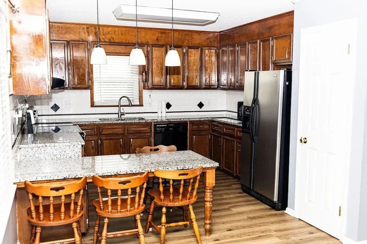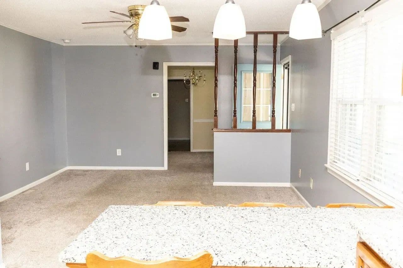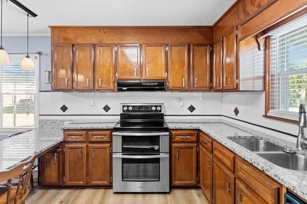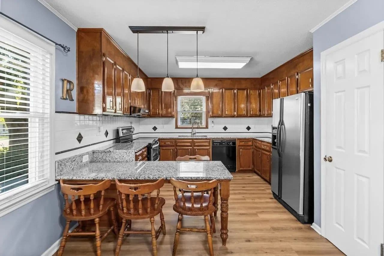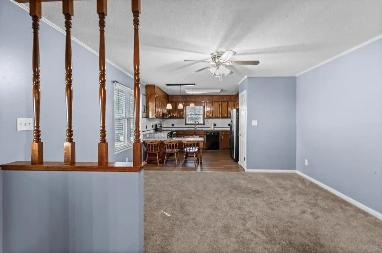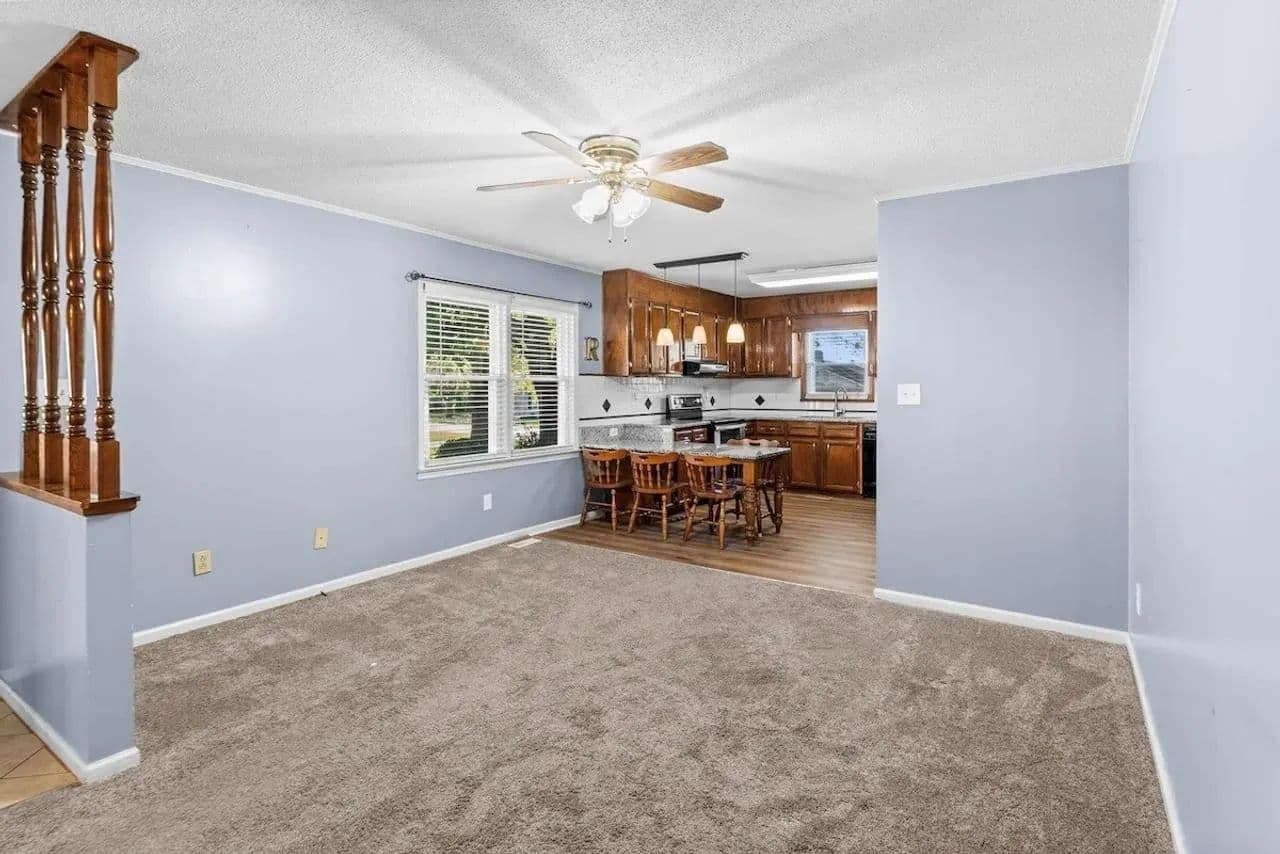 Nestled on .11 acres on a corner lot in town, this charming brick home offers over 2400 heated square feet of comfortable living space, perfect for those seeking space to spread out. With 4 bedrooms, 2 full bathrooms, and a large bonus room, this home has plenty of room for the whole family. Step inside to find a spacious and open kitchen and den with a formal dining room complete with beautiful built-in corner cabinets. The updated kitchen features a large island, providing ample space for casual dining. Three of the bedrooms are conveniently located on the first floor for easy accessibility. The primary suite is thoughtfully positioned on one side of the home for added privacy,while two additional bedrooms and a full bath are located on the opposite side—ideal for guests, children, or a home office setup. A spacious laundry room features a deep utility sink, ample cabinetry for storage, and convenient access directly from the carport. Upstairs, you'll find a generously sized bonus room, perfect for use as a playroom or a hobby room, and an additional bedroom. Upstairs also offers a large storage closet and plenty of storage space tucked neatly into the eaves—perfect for seasonal items or household extras. The exterior boasts a low-maintenance brick exterior, a spacious driveway with plenty of parking, a carport, a quaint covered front porch, and a storage shed.