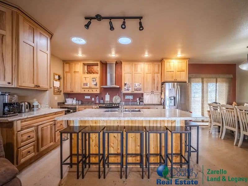At the heart of the property is a 2,821 sq. ft. ranch-style home offering 5 bedrooms, 3 bathrooms, and an additional flex room that can serve as an office, guest space, or non-conforming bedroom. The home features in-floor radiant heat, concrete flooring, and a newly remodeled primary bathroom. The open-concept kitchen, dining, and living room creates a warm, communal space with a newly installed island adding functionality and flow.