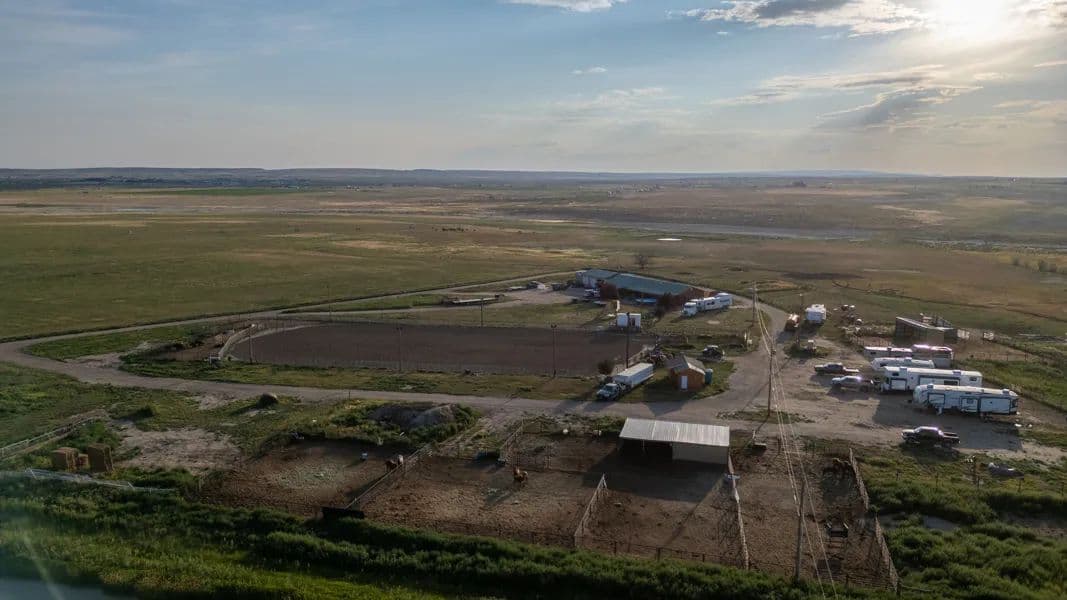 Equestrian & Event Amenities - Casper-area equestrian ranch with roping arena, return chute, announcer’s booth, and livestock-ready outbuildings.